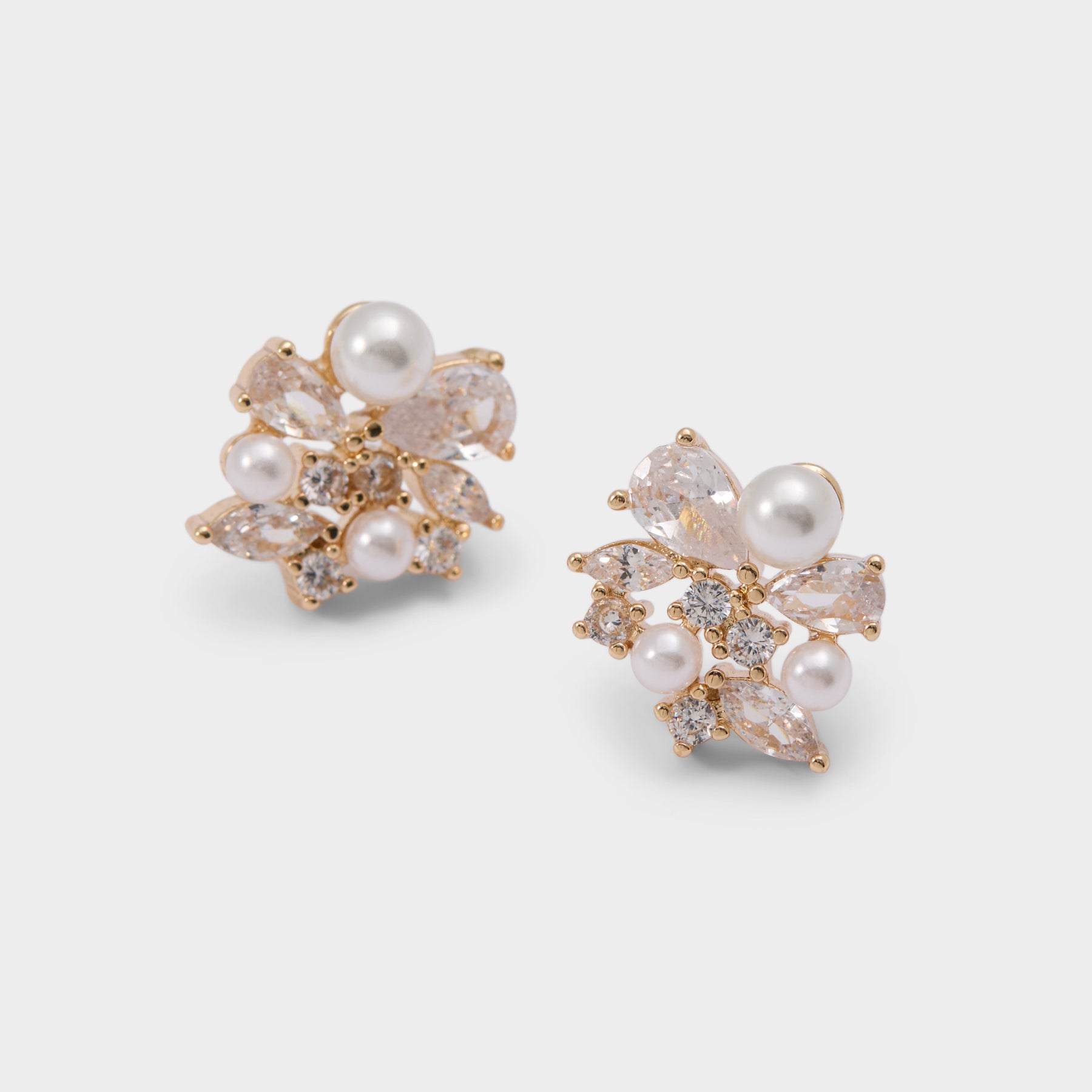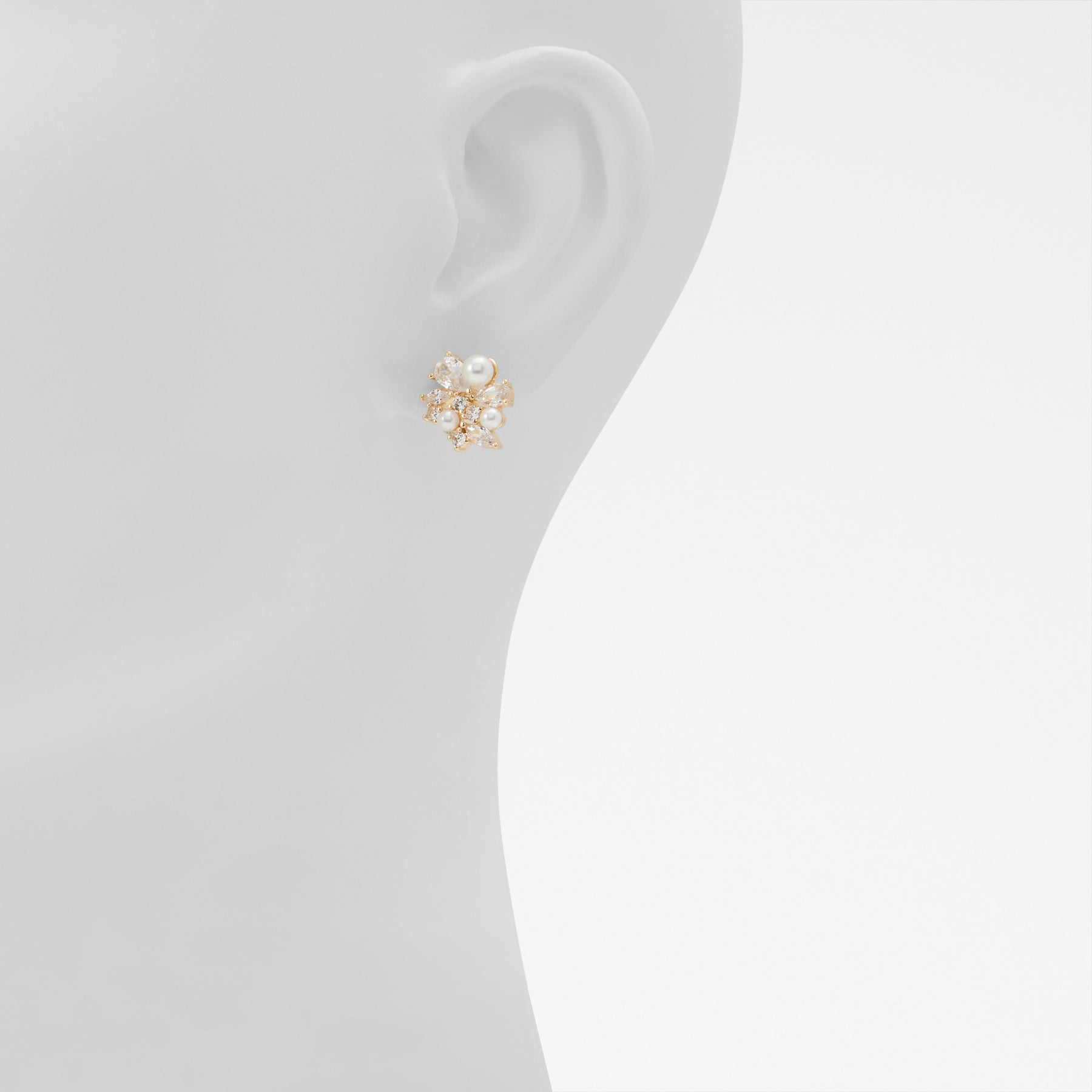 Brincos curtos OLADELE para mulher, em dourado, com pérolas brancas e pedras brilhantes.