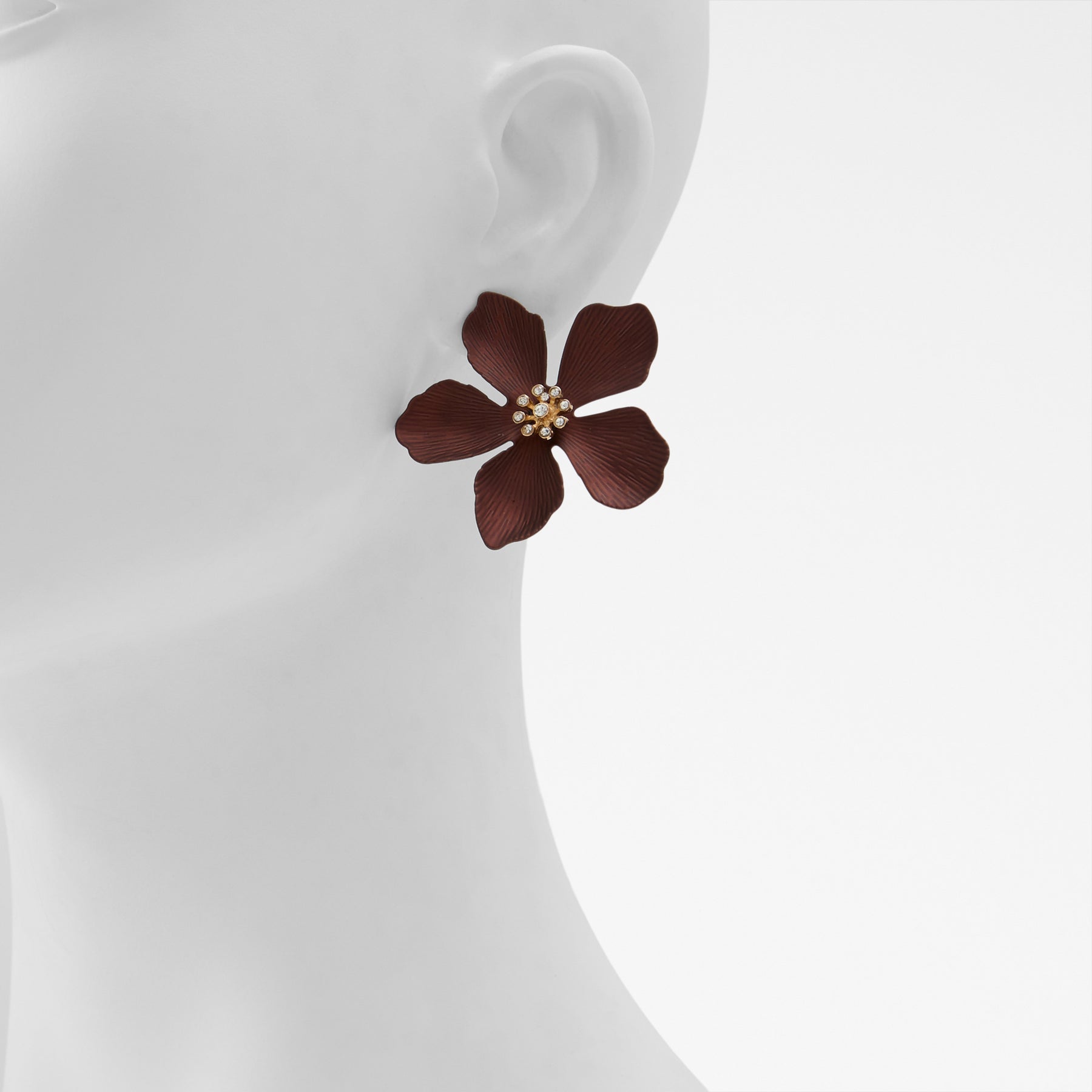 Brincos longos MAFLORRA para mulher, em castanho, em forma de flor com pedras brilhantes.