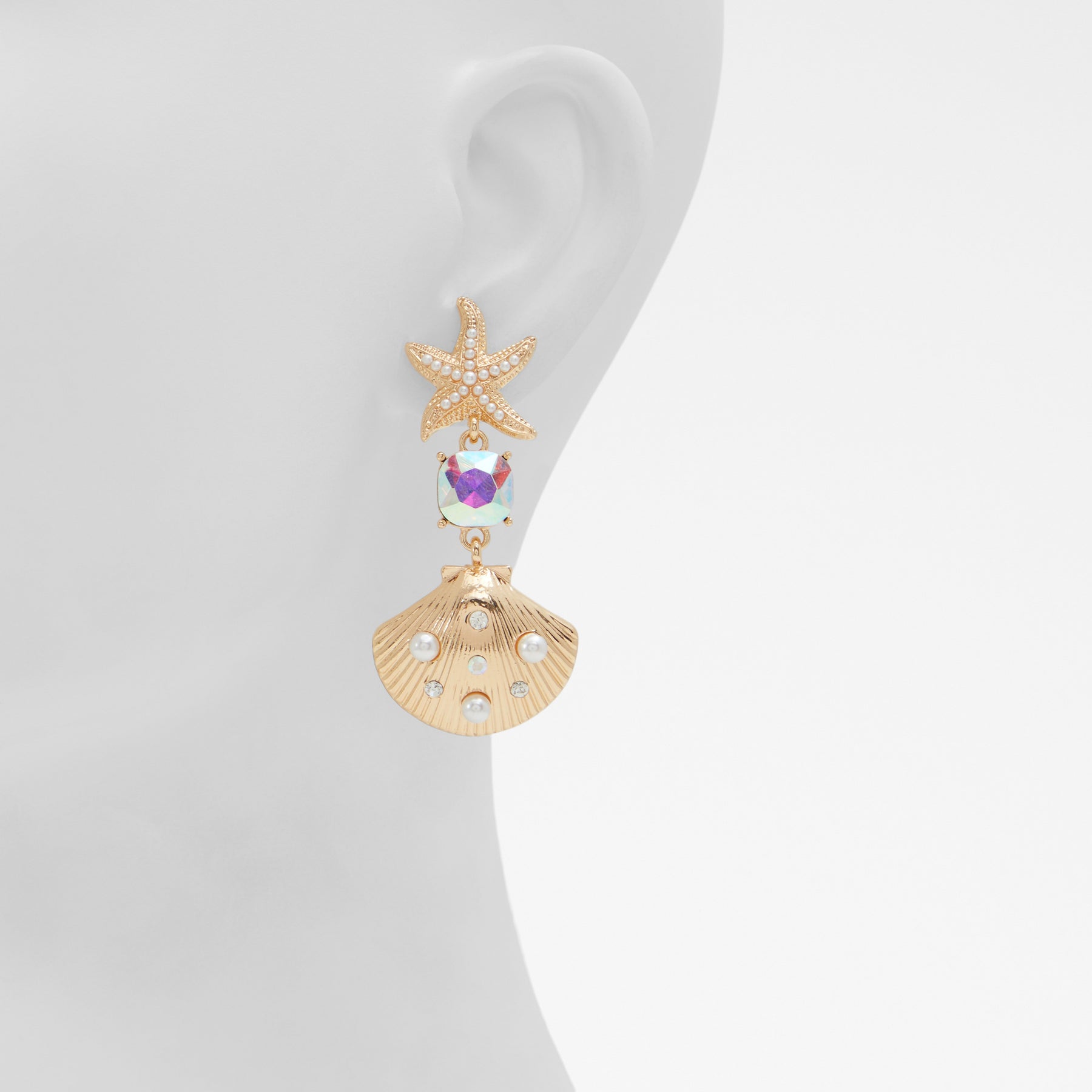 Brincos longos SEASHELLE para mulher, em dourado, com pedras brilhantes, com elementos marinhos e pérolas brancas.