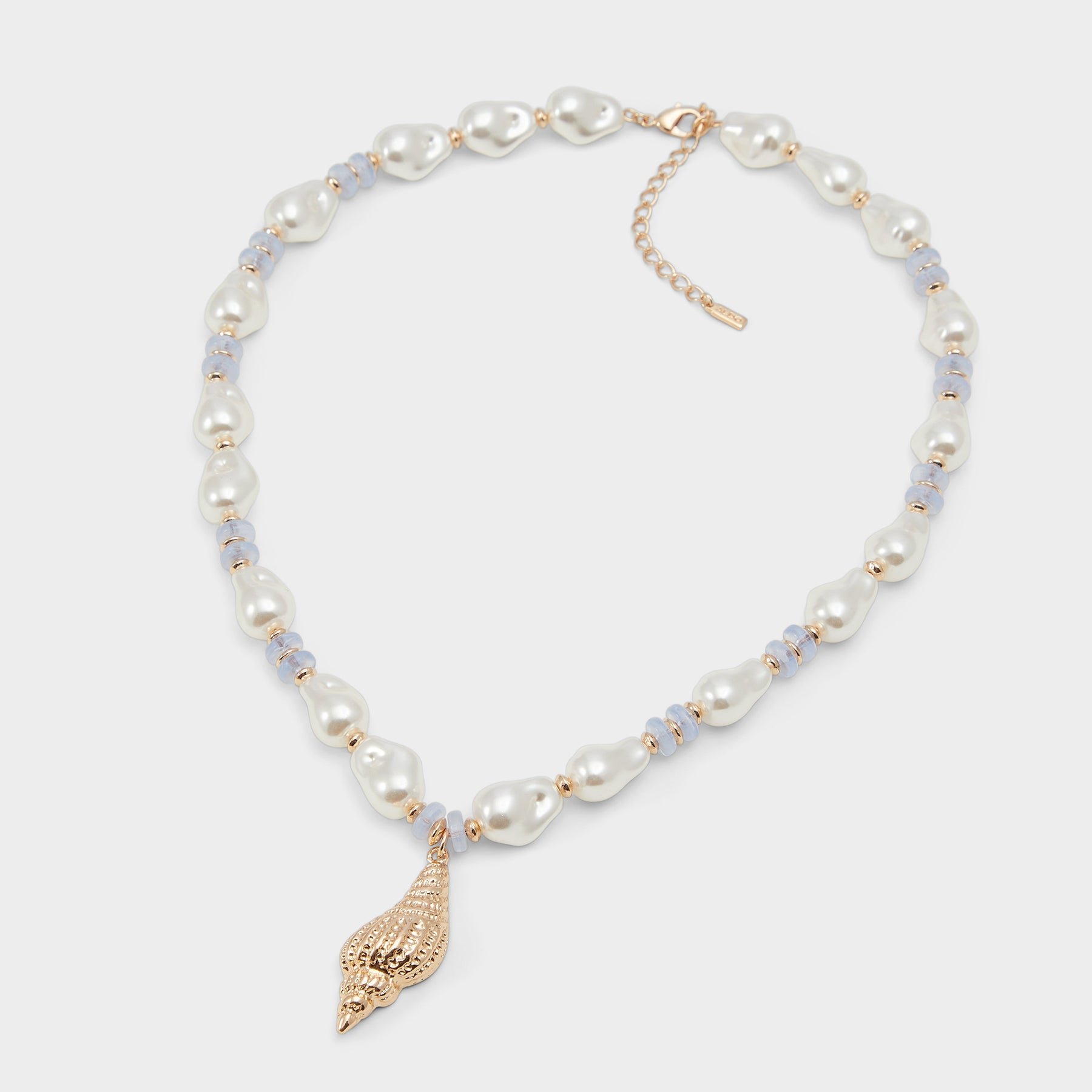 Colar BEACHVIBESS para mulher, em dourado e branco, com pérolas brancas, missangas azuis e pendente em forma de búzio.