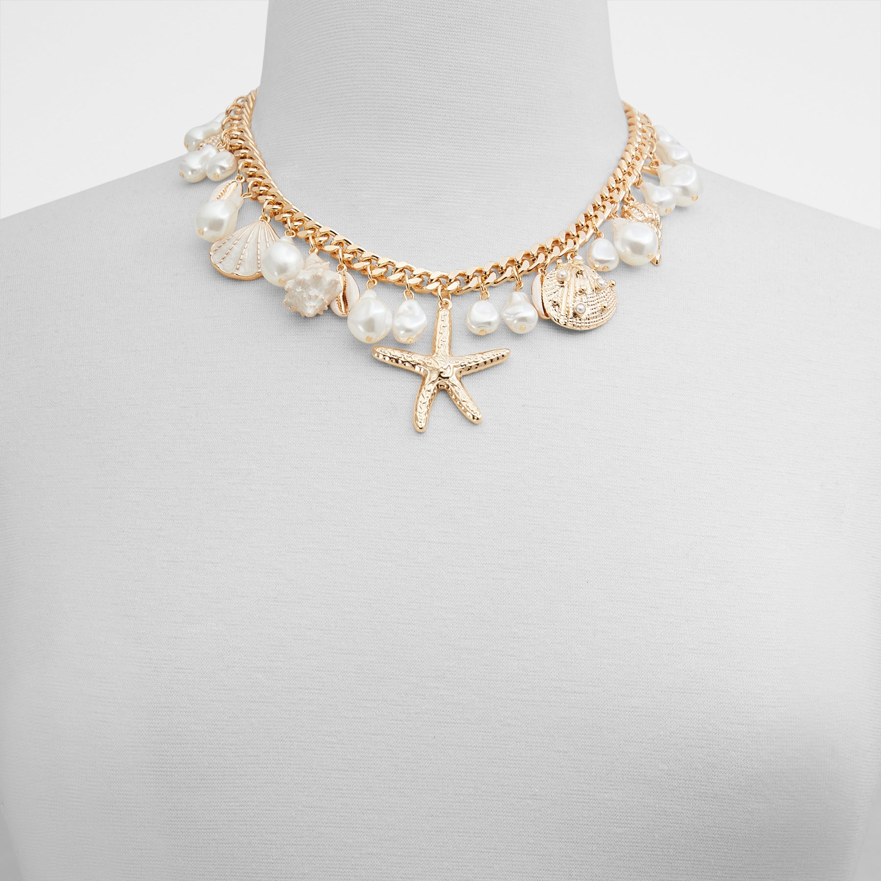 Colar RIVIERRA para mulher, em dourado e branco, com corrente dourada, pérolas e pendentes marítimos.