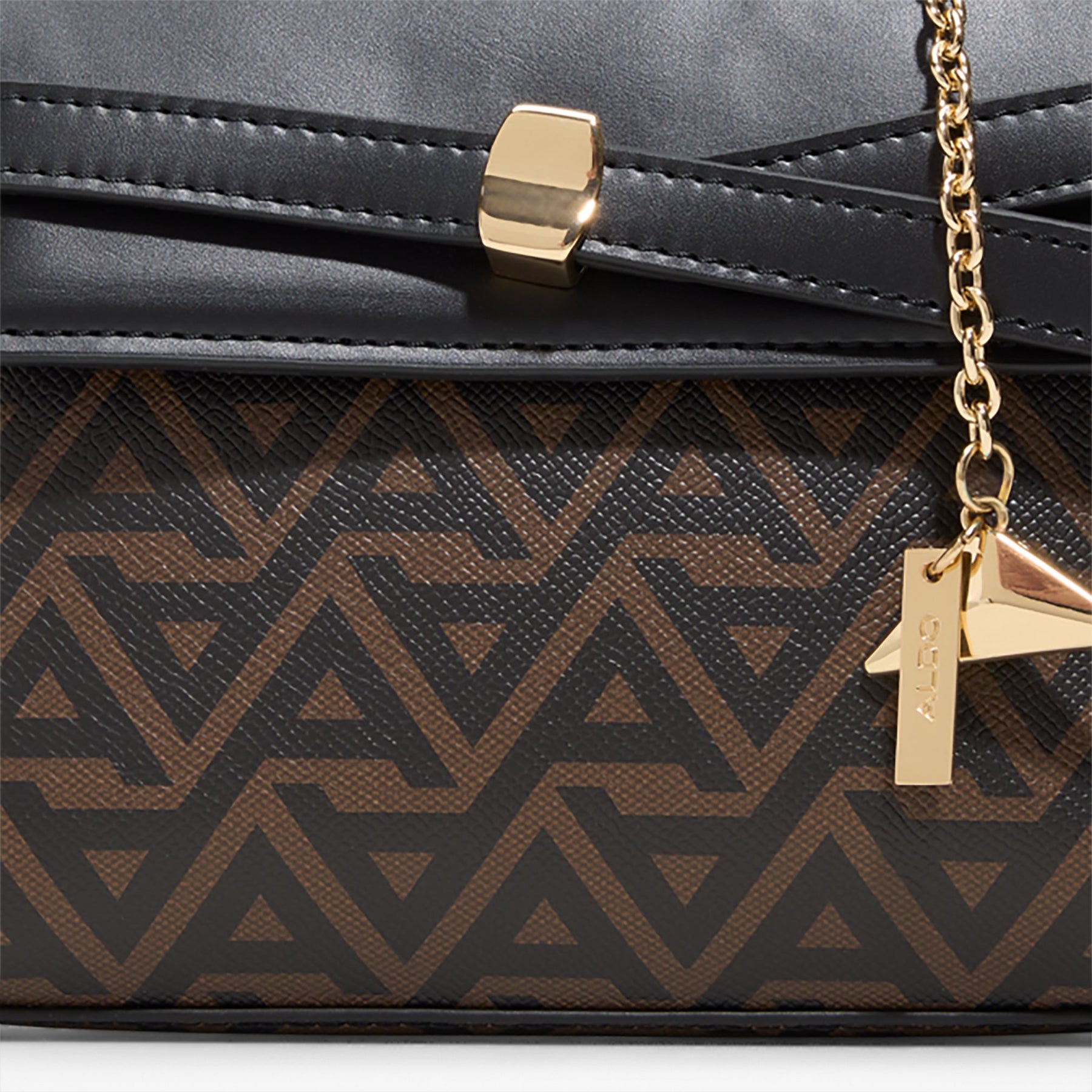 Mala de mão ALOLA para mulher, em castanho, com fecho magnético, alça curta e um aplique decorativo. Com uma alça extra para uso de tiracolo.