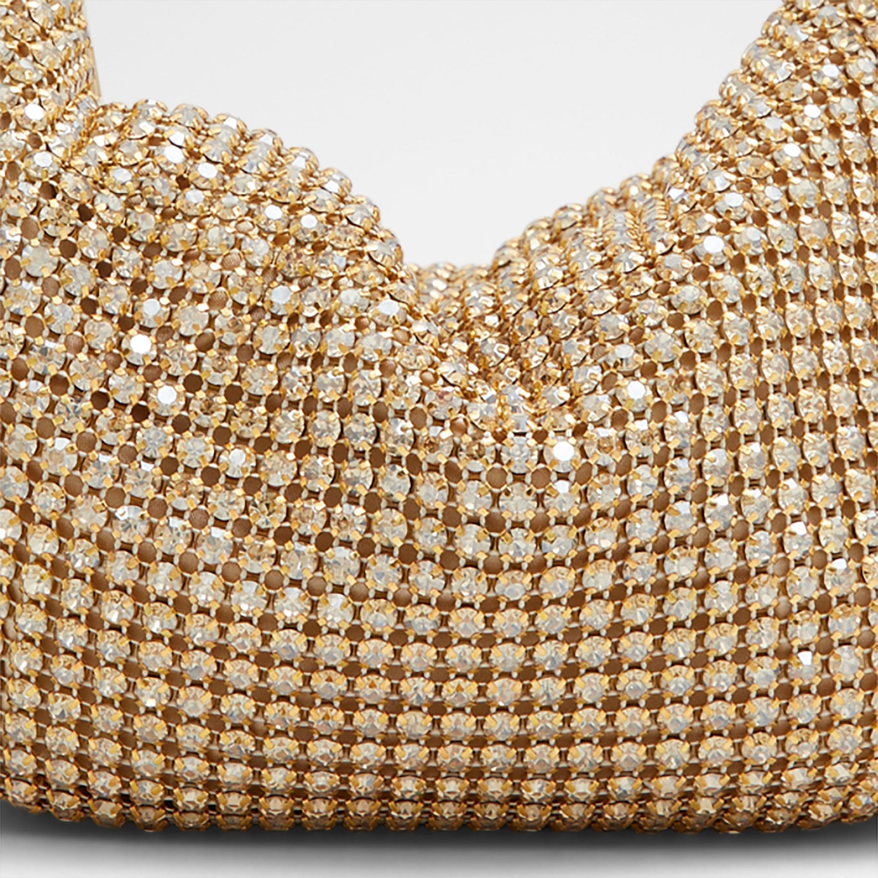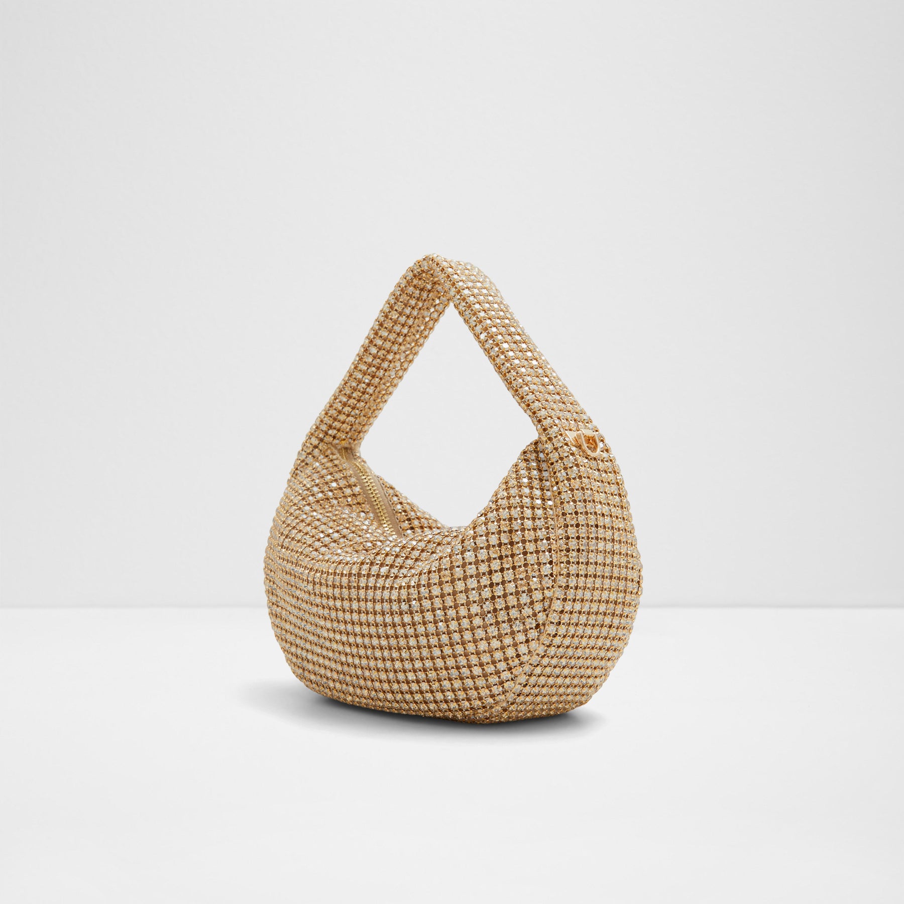 Mala de mão LUZ para mulher, em dourado, com fecho de correr, alça curta e pedras brilhantes. Com uma alça extra para uso de tiracolo.