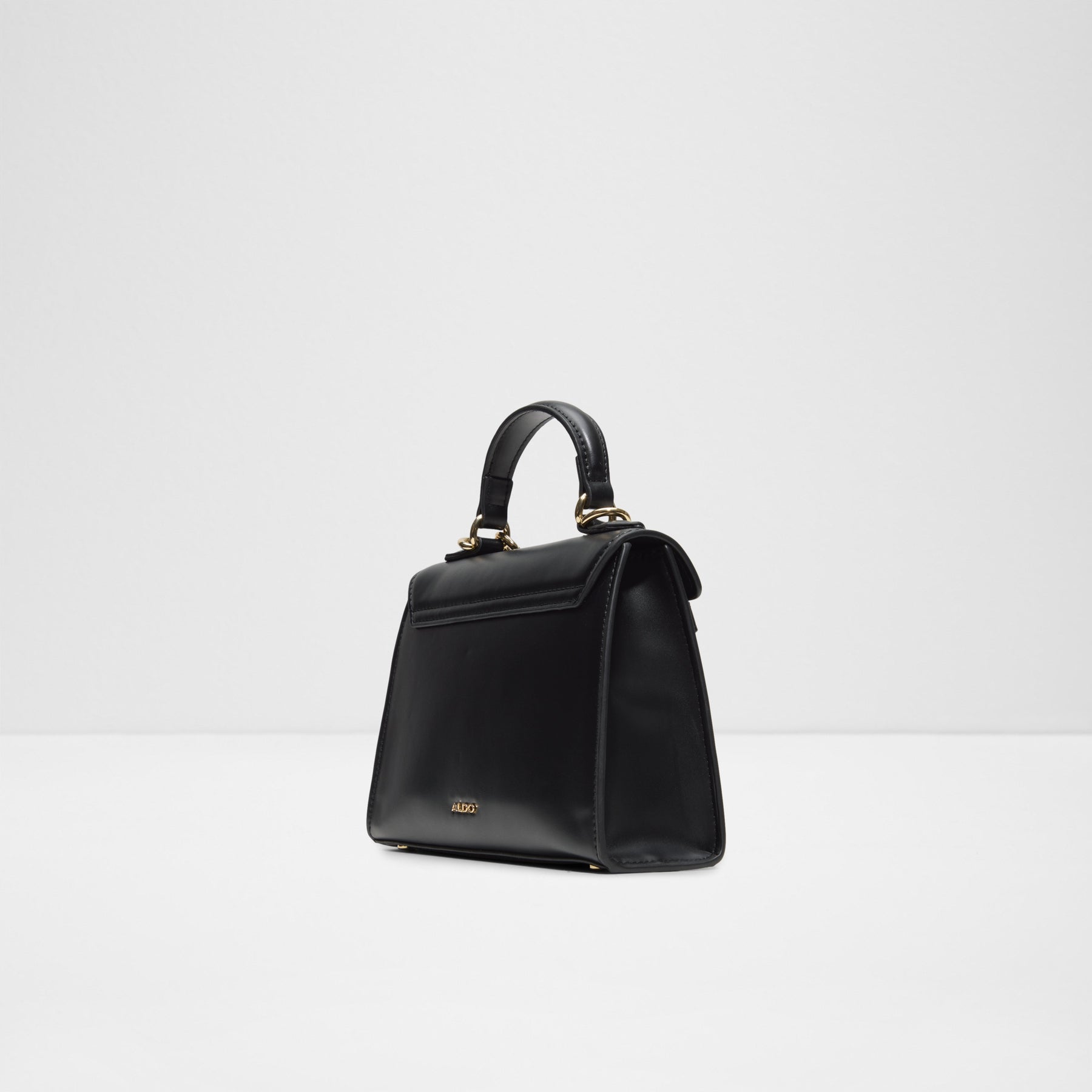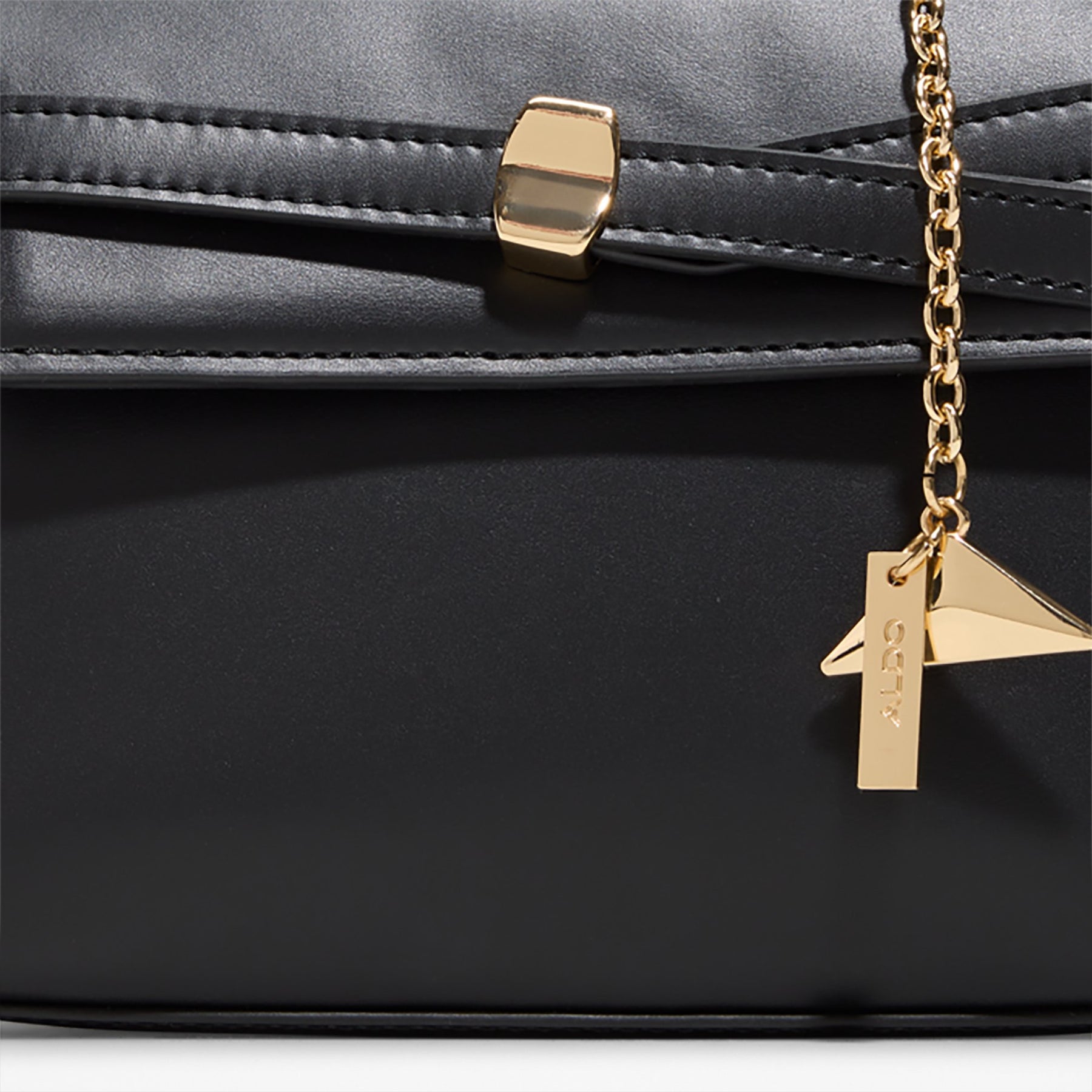 Mala de mão ALOLA para mulher, em preto, com fecho magnético, alça curta e um aplique decorativo. Com uma alça extra para uso de tiracolo.