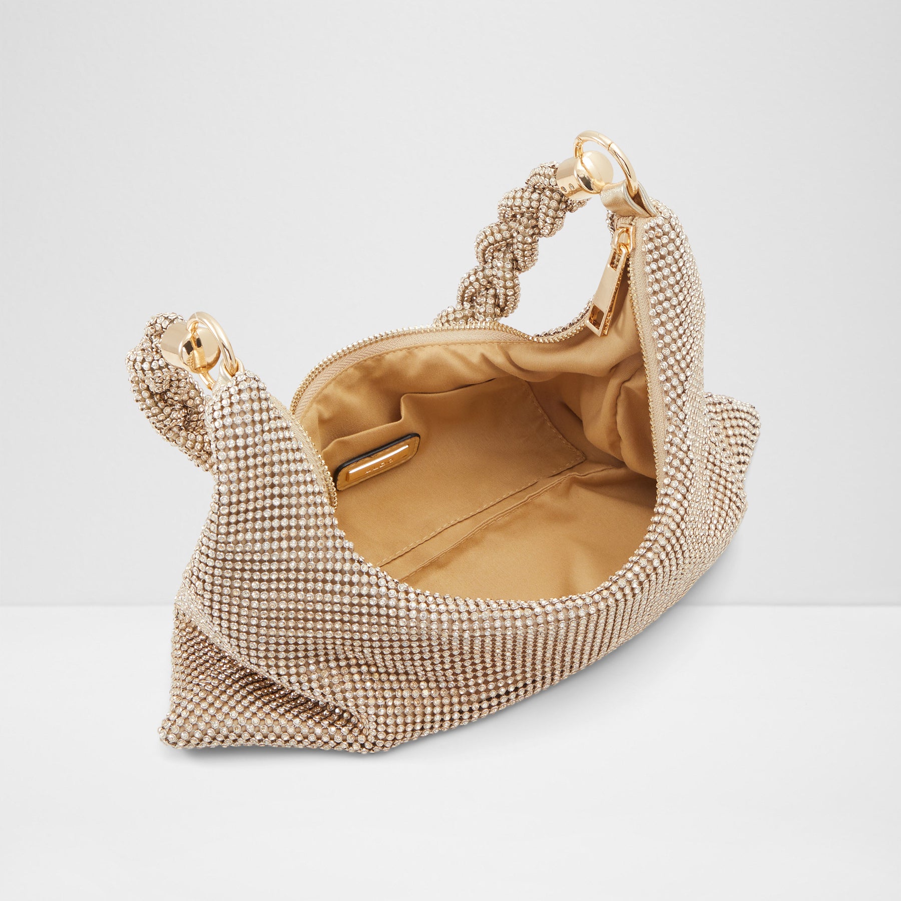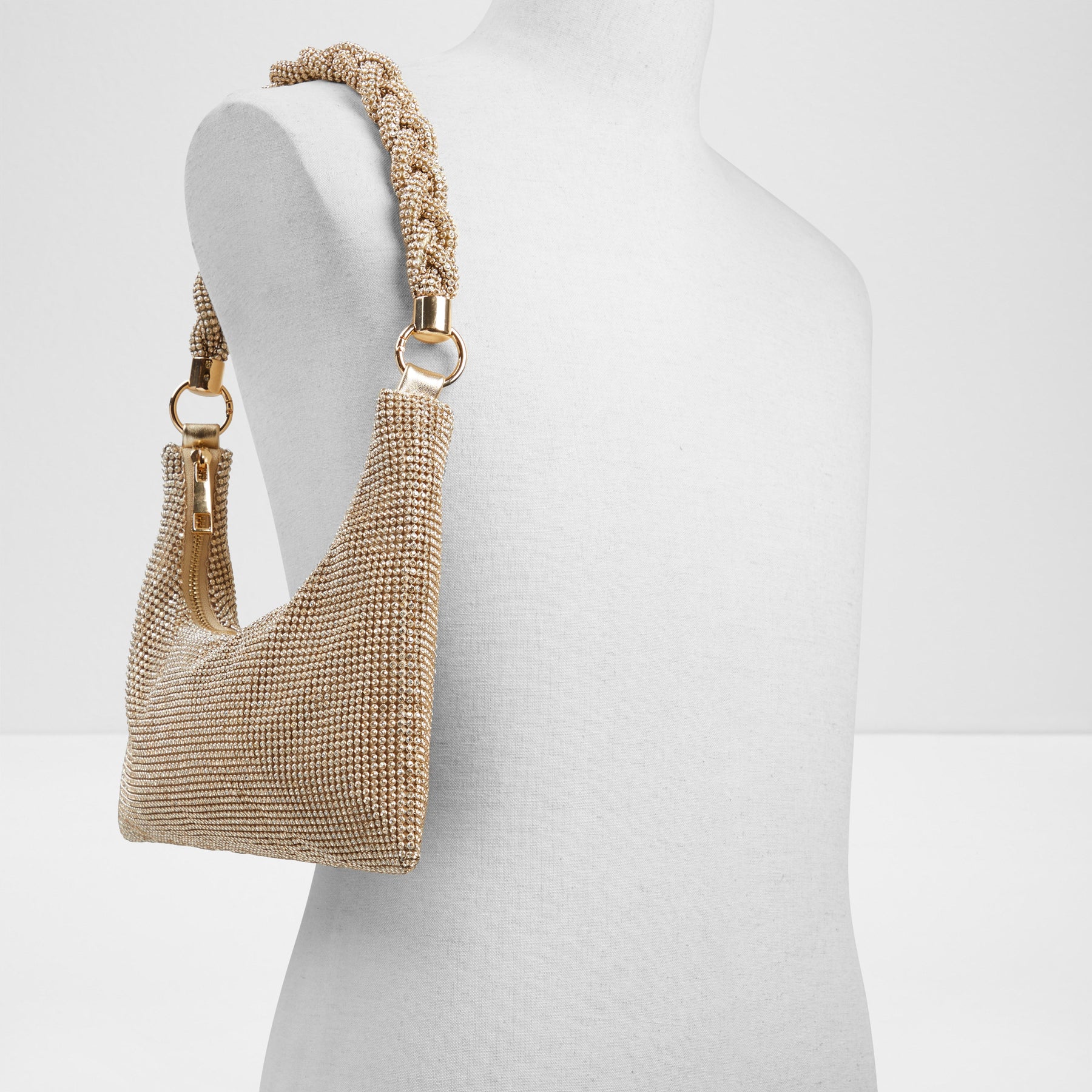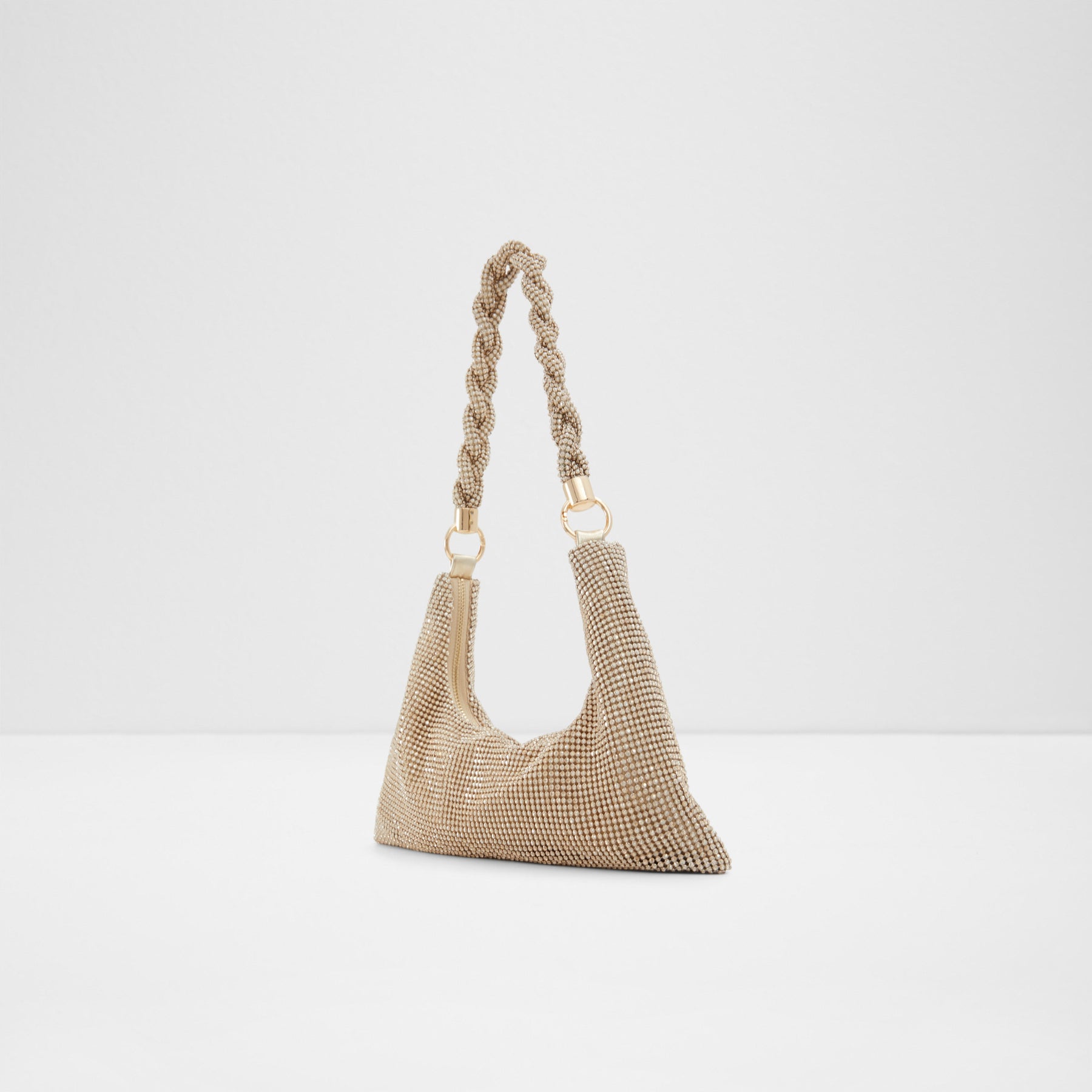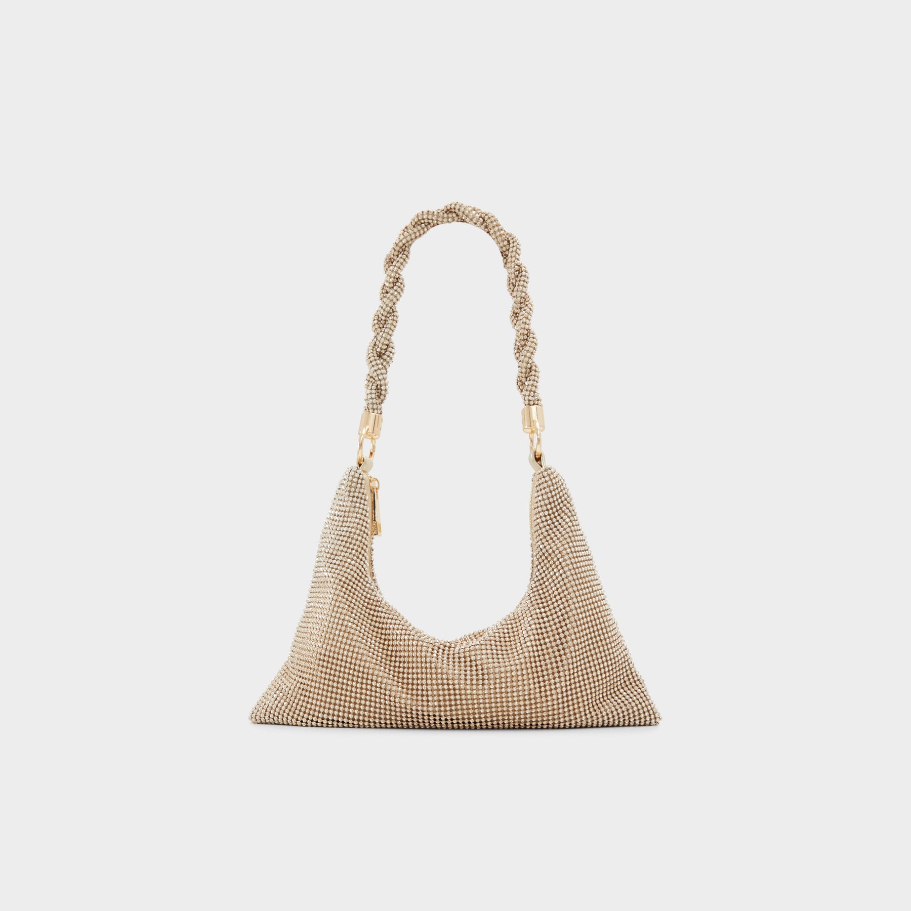 Mala de ombro MARLYSA para mulher, em dourado, com fecho de correr, alça média e pedras brilhantes.