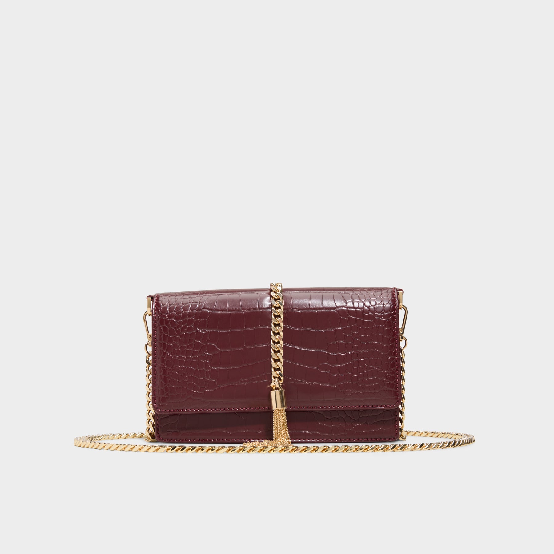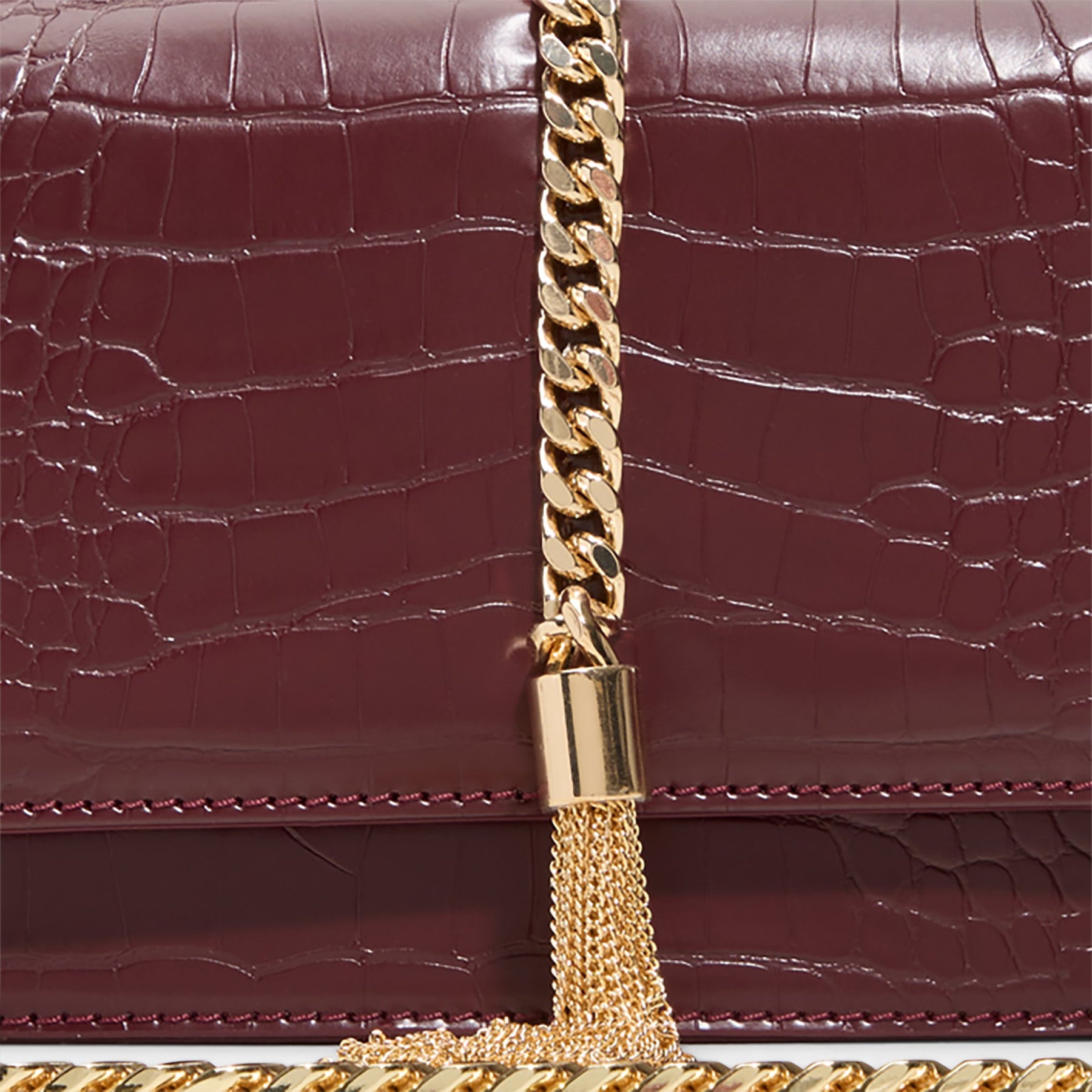Mala de tiracolo LILITHA para mulher, em bordô, com fecho magnético, alça comprida e uma textura de pele animal. Com uma alça extra para uso de tiracolo.