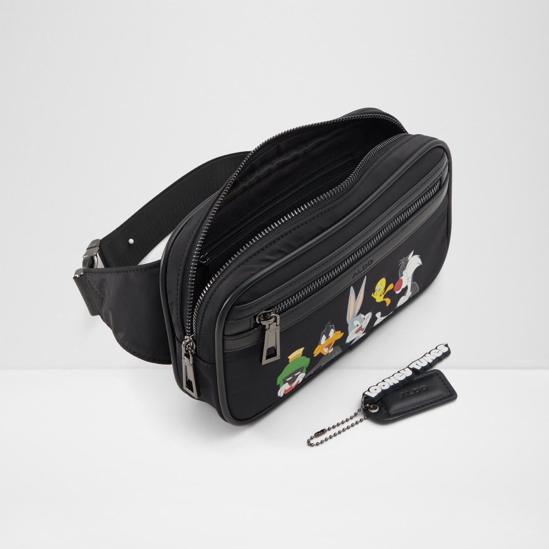 Mala de tiracolo LTFANNYPACK para homem, em preto, com fecho de correr, alça comprida e um estampado colorido. Coleção exclusiva Looney Tunes x ALDO. Complete o seu look aqui.