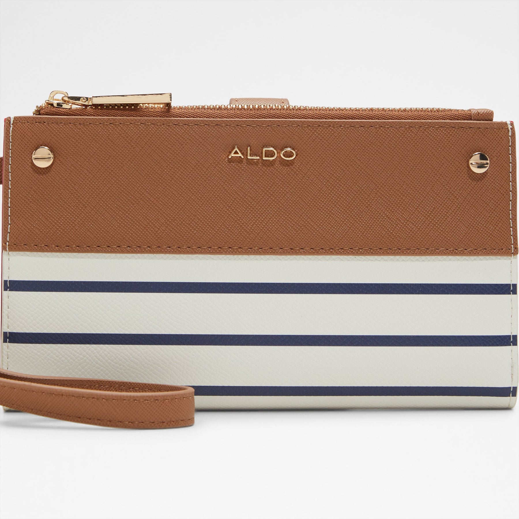 Carteira RORBAG para mulher, em azul marinho e com fecho de mola. Com bolsos para cartões e cartão de identificação, bolso para notas e/ou documentação e compartimento para moedas com fecho de correr. Com padrão de riscas. Com alça de mão em cognac removível.
