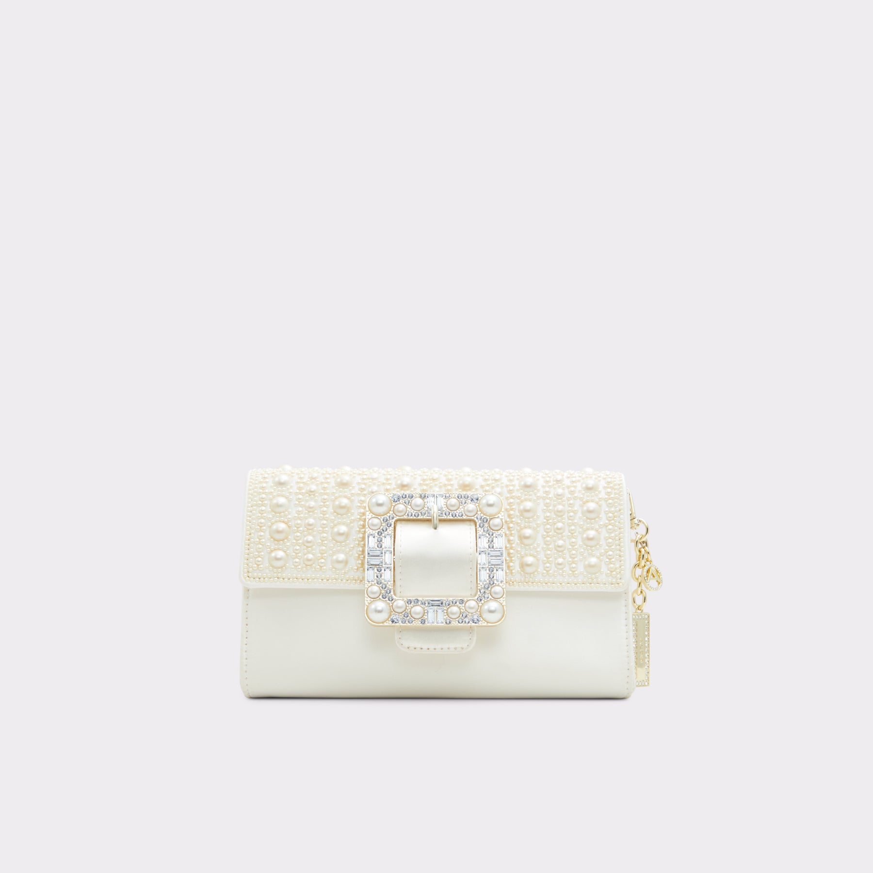 Mala de mão DANCERIA para mulher, em branco, com fecho magnético e pedras brilhantes. Com pérolas brancas e uma alça extra para uso de tiracolo.