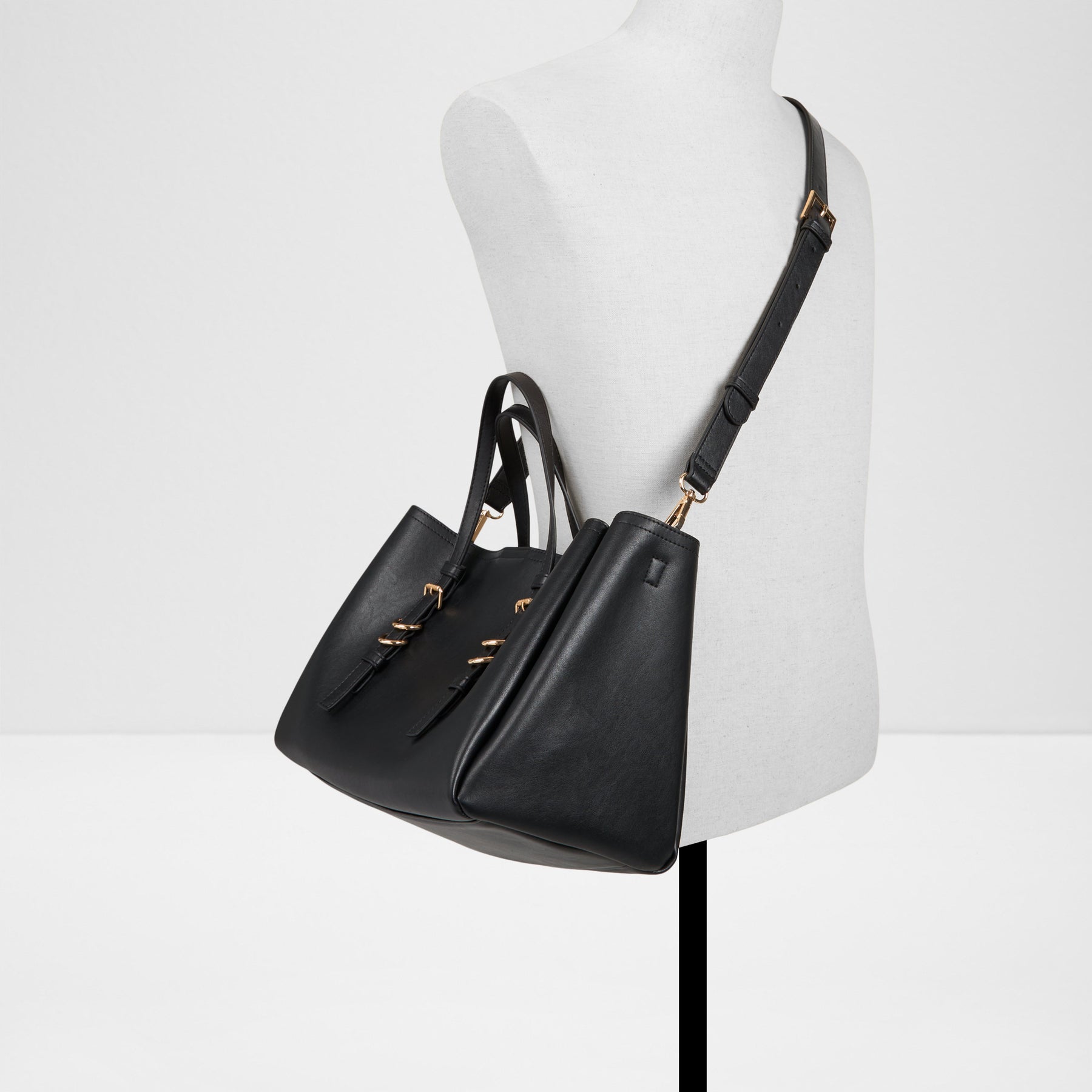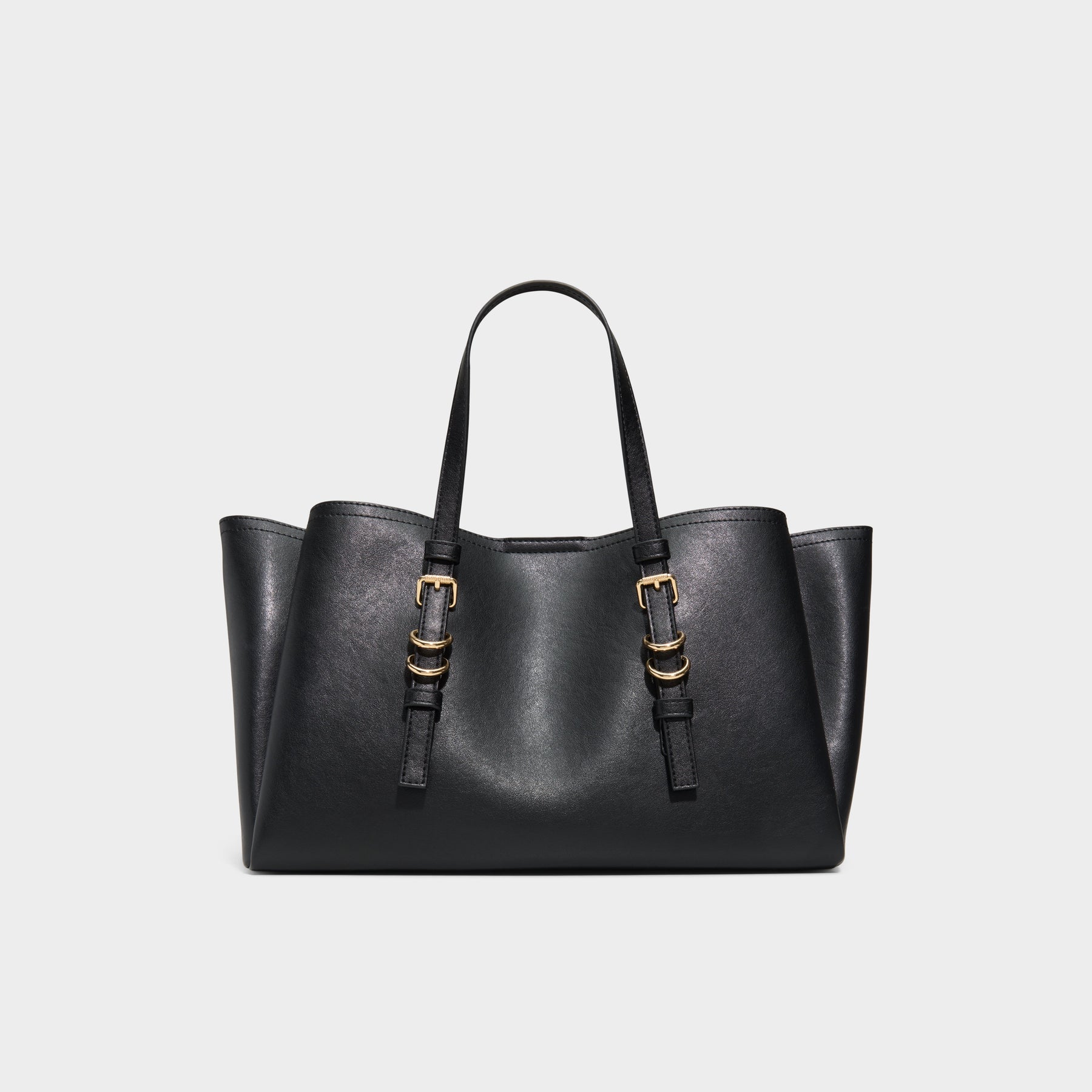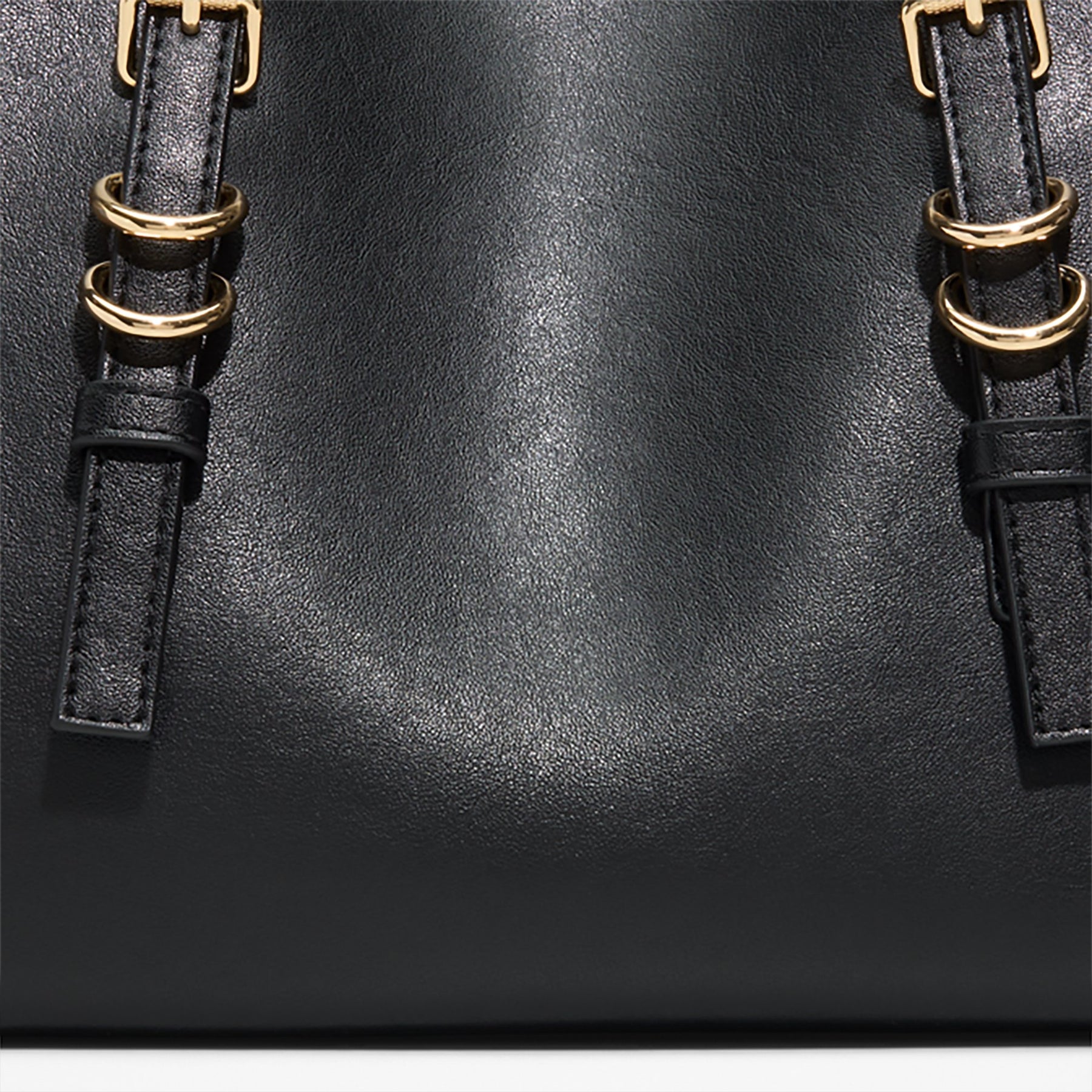 Mala de mão MELEAH para mulher, em preto, com fecho magnético, alça curta e uma alça extra para uso de tiracolo.