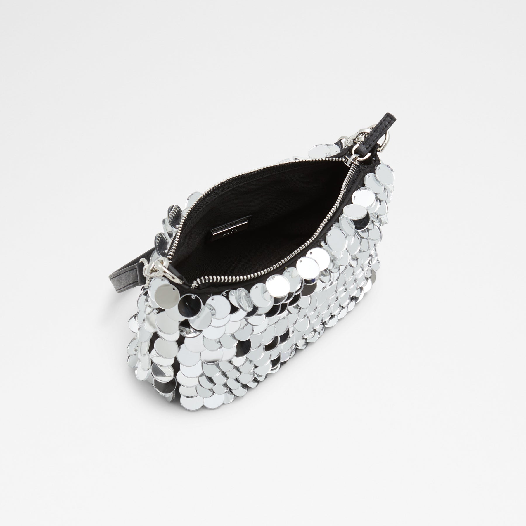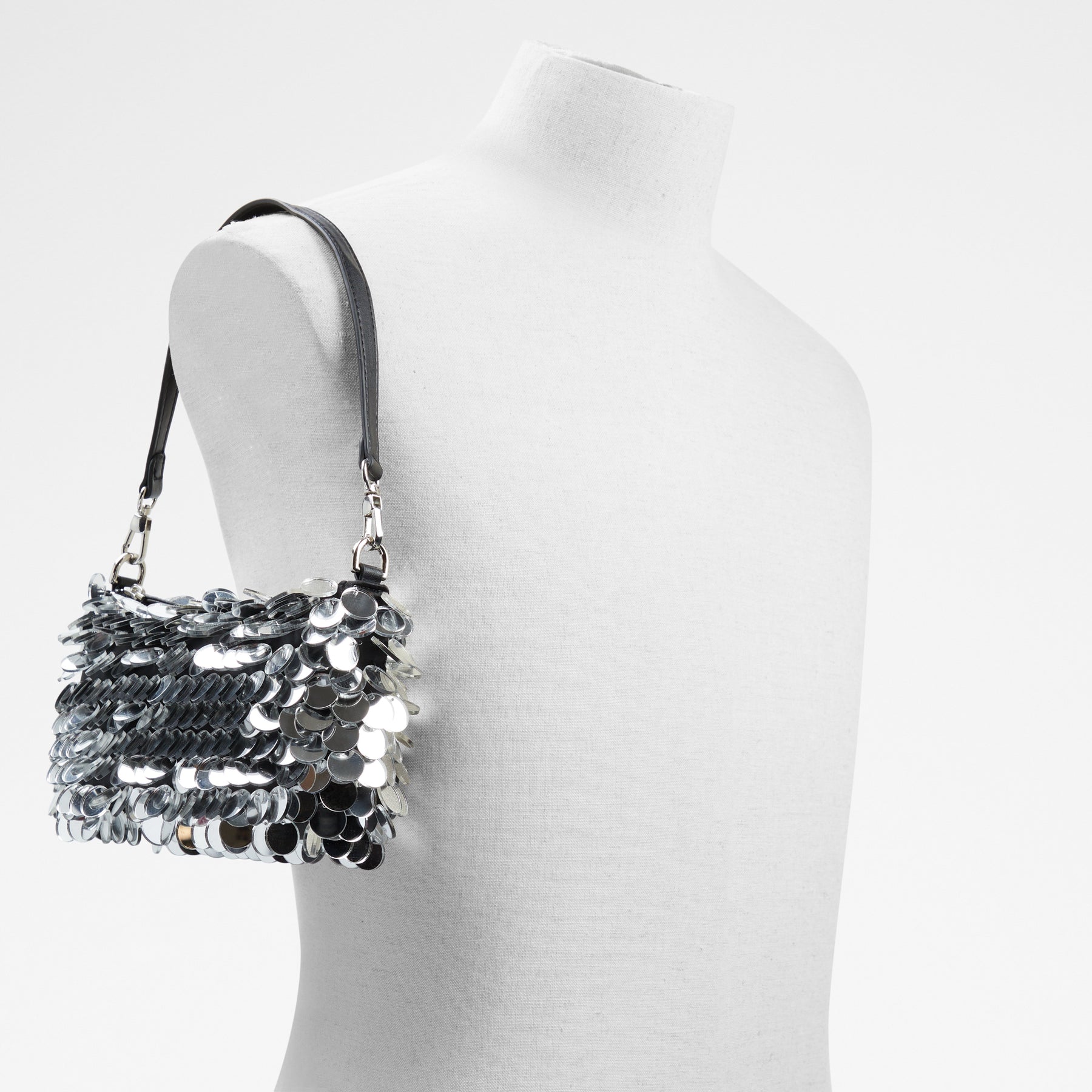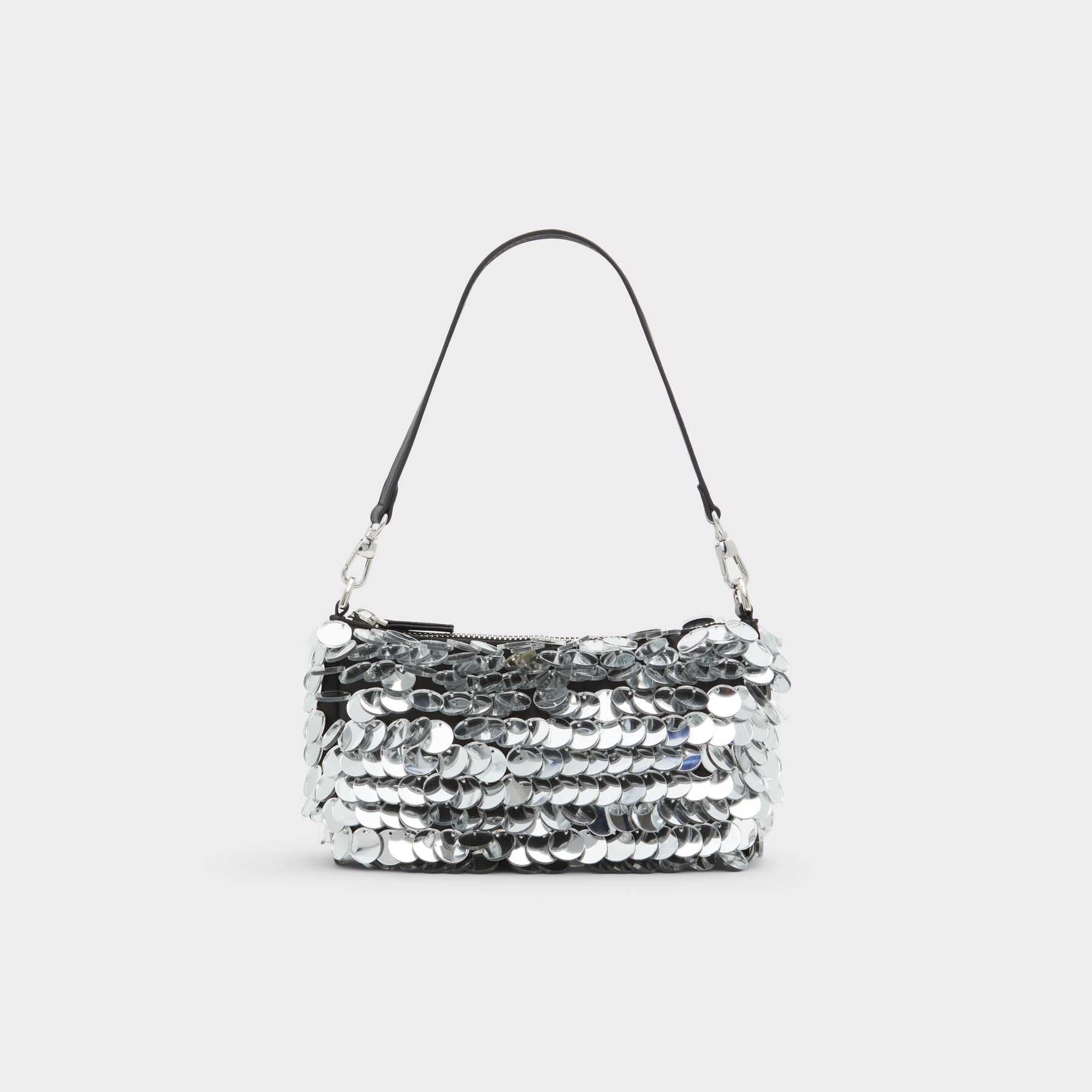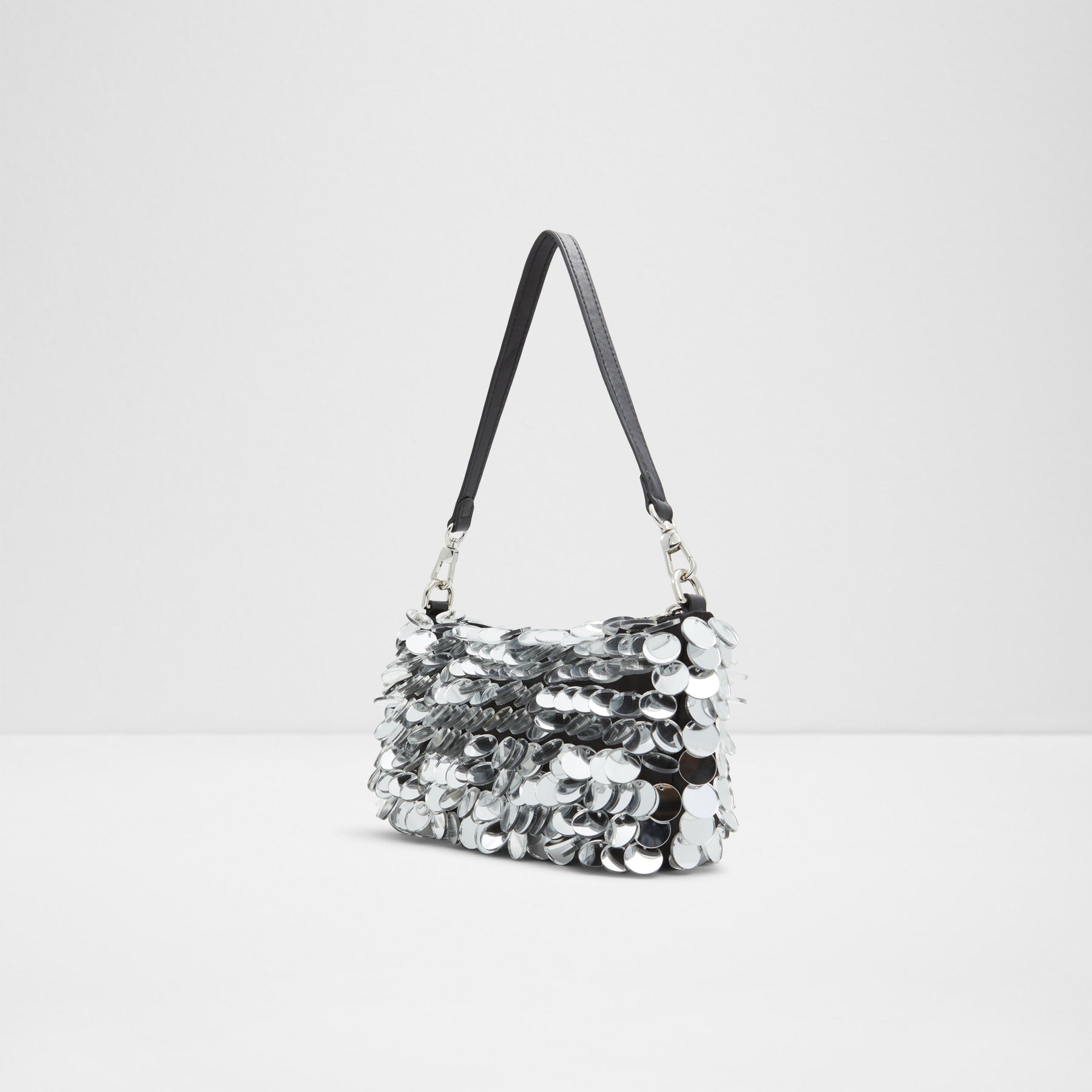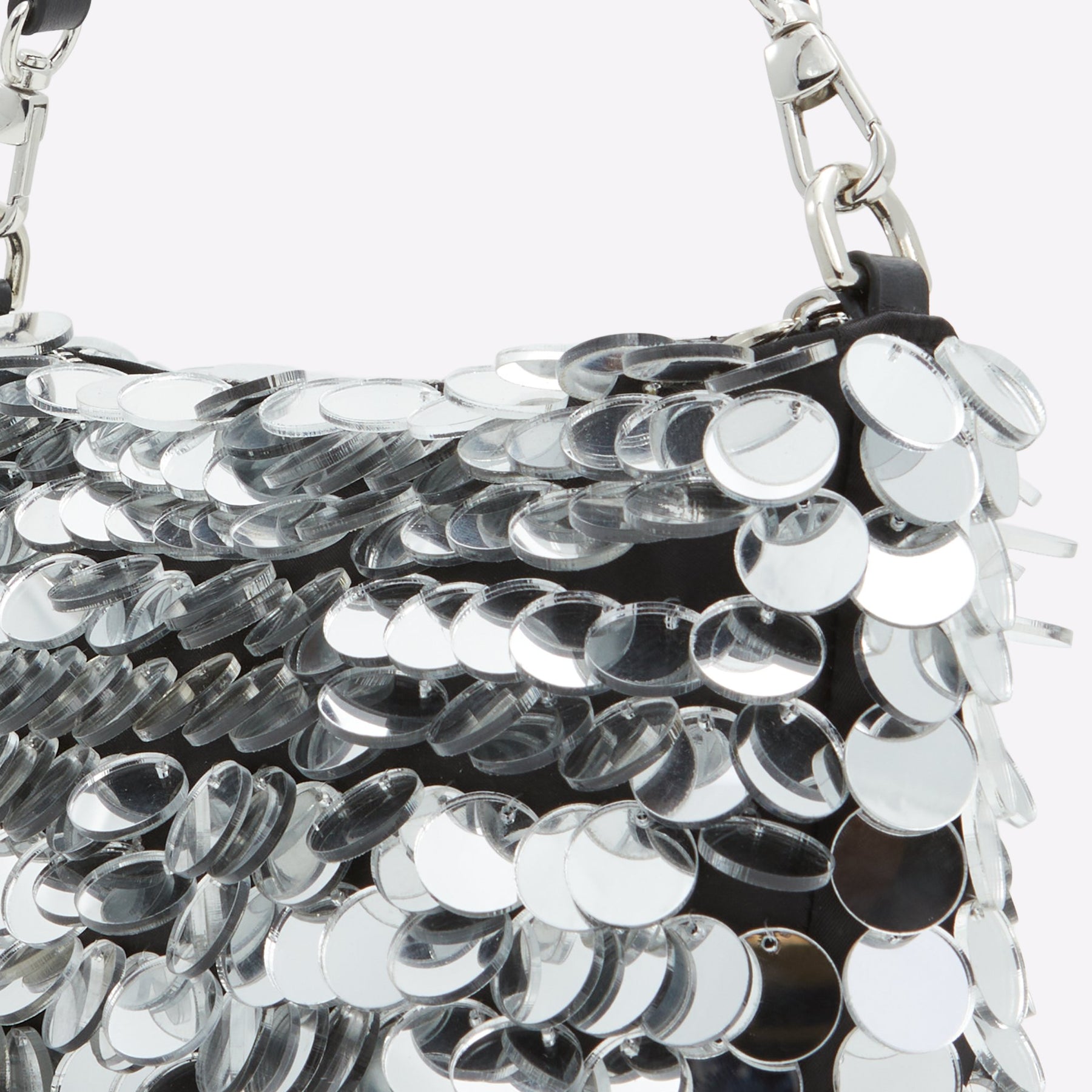 Mala de ombro SEQUINA para mulher, em prateado, com fecho de correr, alça média e lantejoulas decorativas com efeito espelhado.