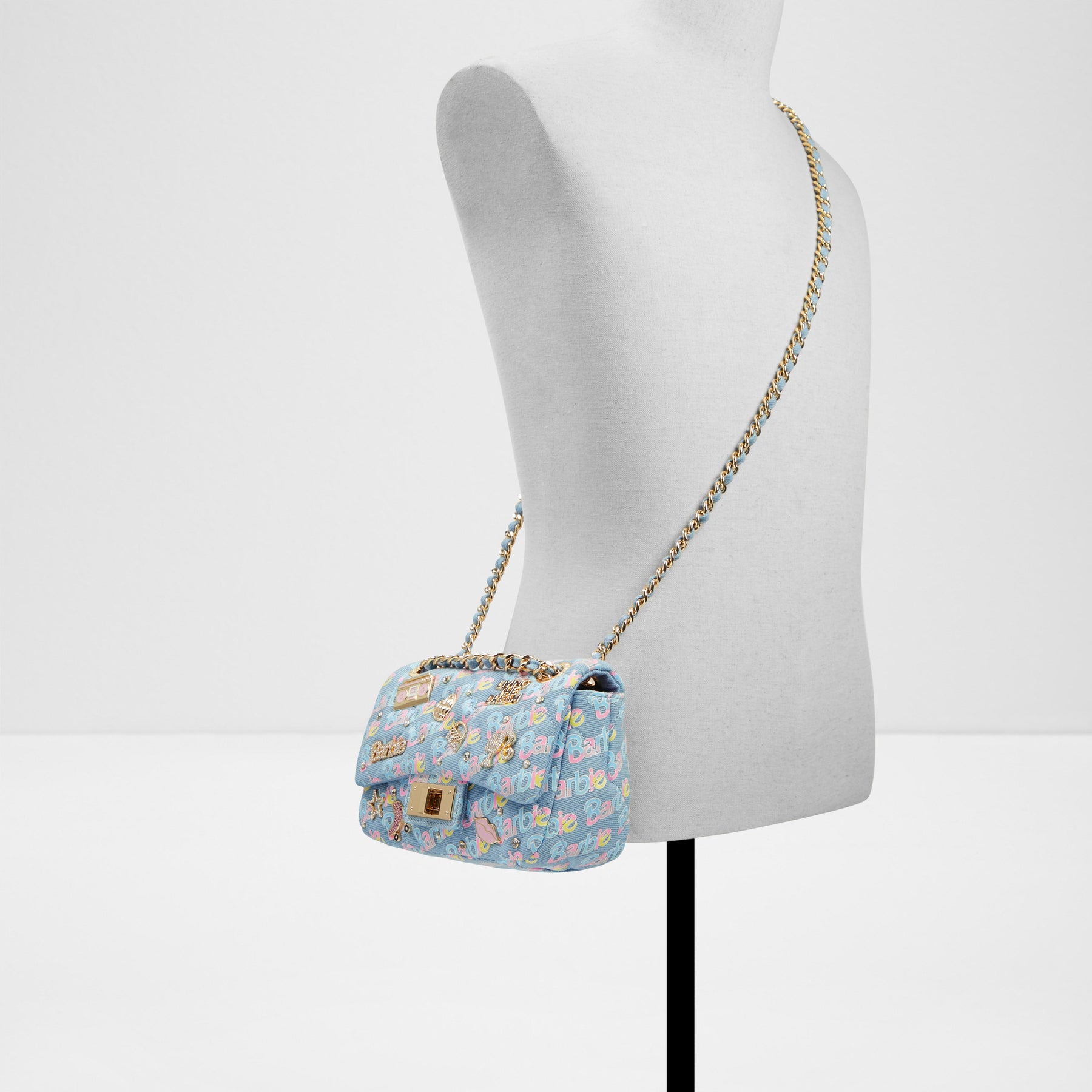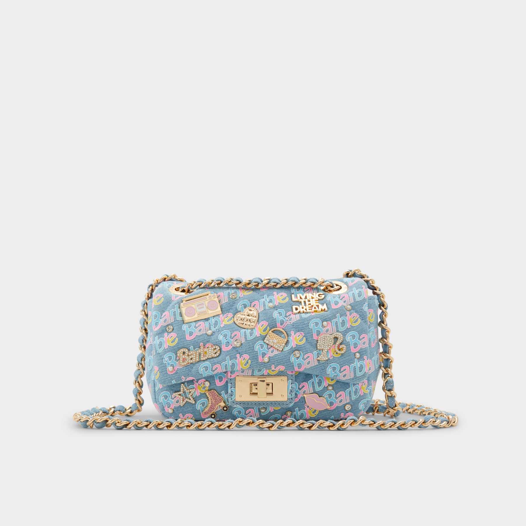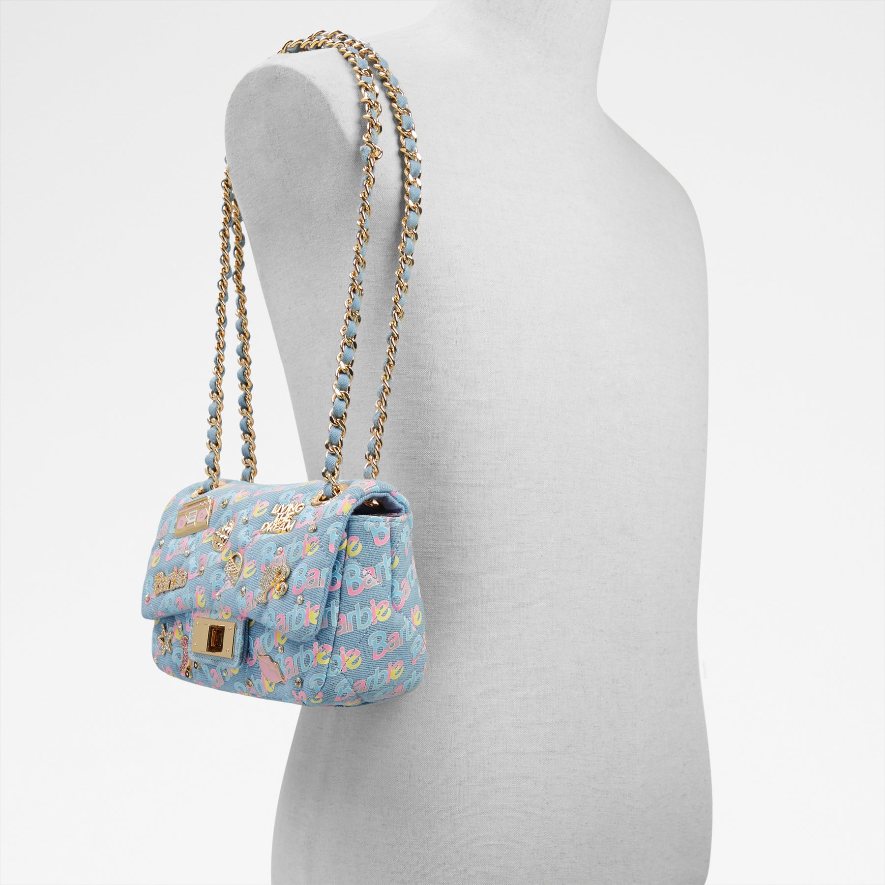 Mala de tiracolo BARBIEPLUSH para mulher, em azul denim, com fecho metálico, alça comprida e um estampado colorido. Com pedras brilhantes. Coleção exclusiva Barbie x ALDO. Complete o seu look aqui.