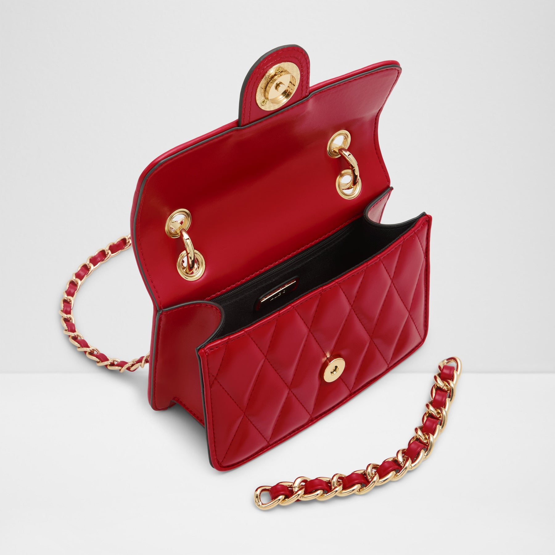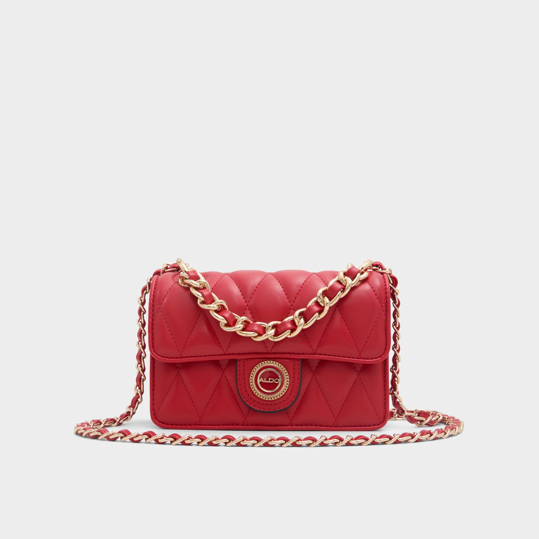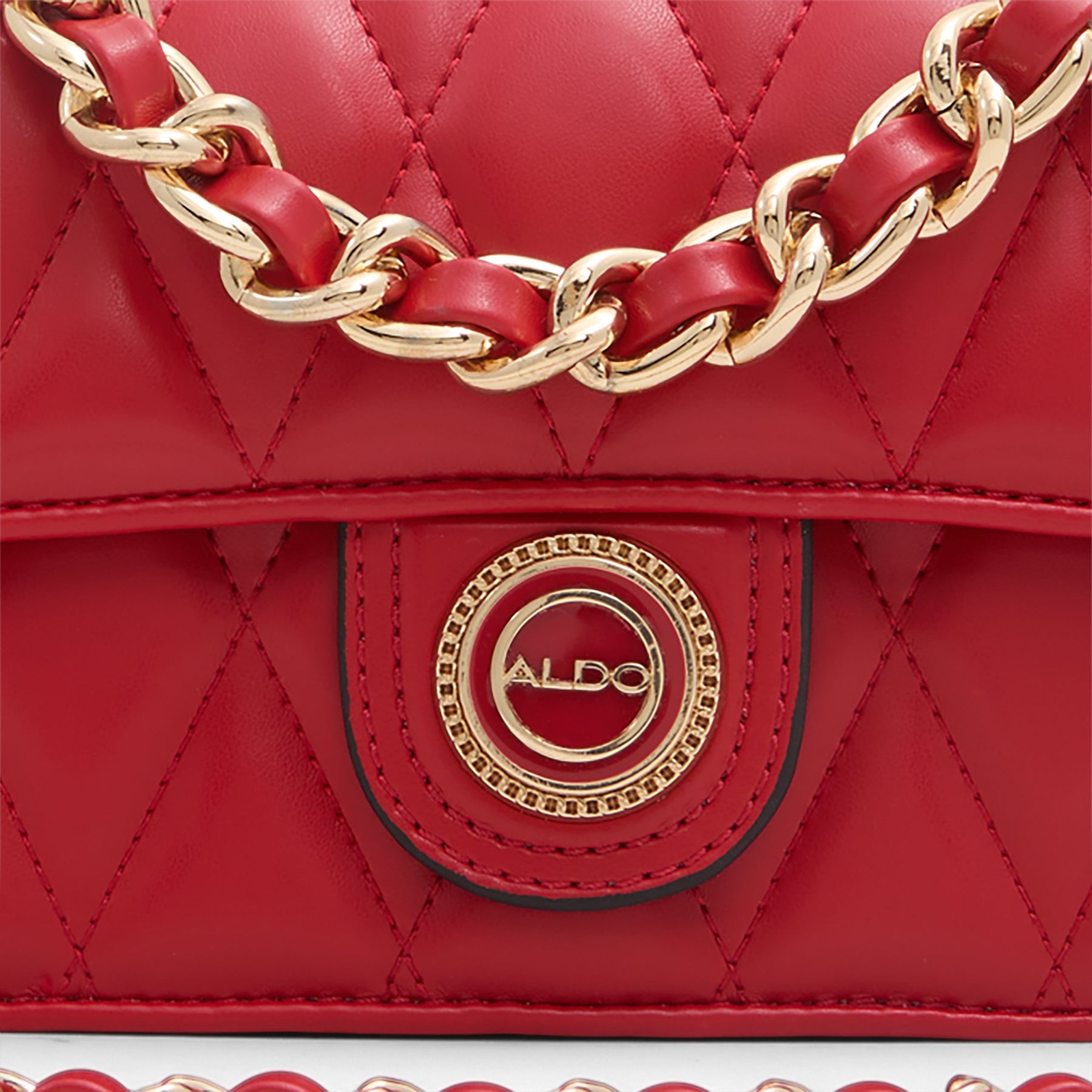 Mala de tiracolo LOUBELLA para mulher, em vermelho, com fecho magnético, alça comprida e corrente decorativa. Com uma textura acolchoada.
