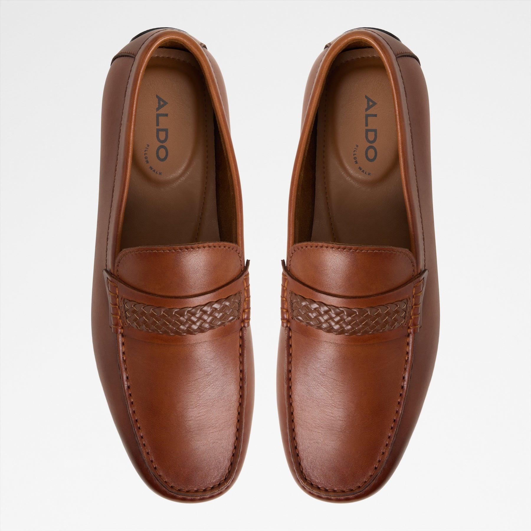 Mocassins CAMILO-IN para homem, em pele, em cognac, com biqueira redonda e detalhe entrançado no peito do pé.