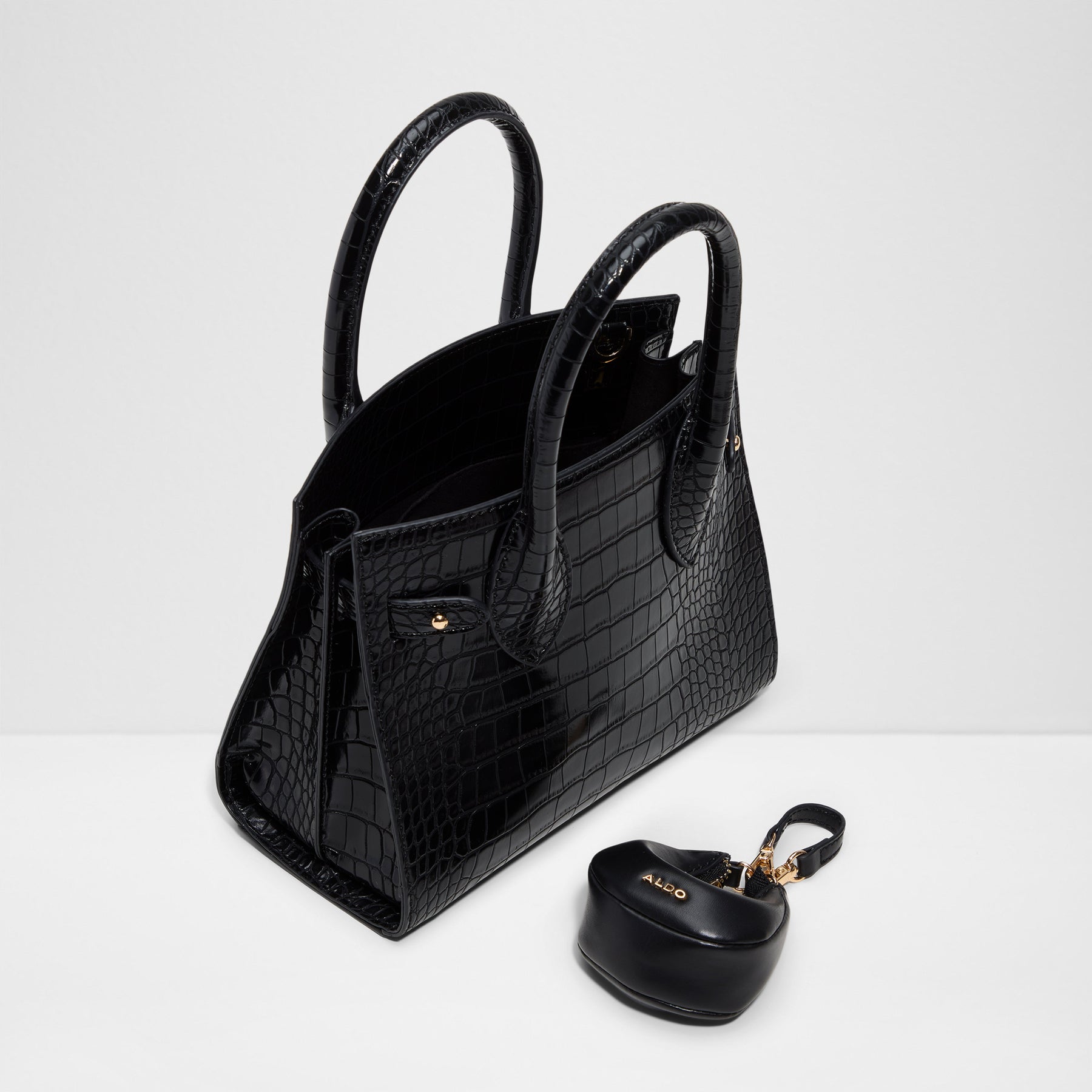 Mala de mão AURALIE para mulher, em preto, com fecho de correr, alça curta e um acessório removível. Com uma alça extra para uso de tiracolo.