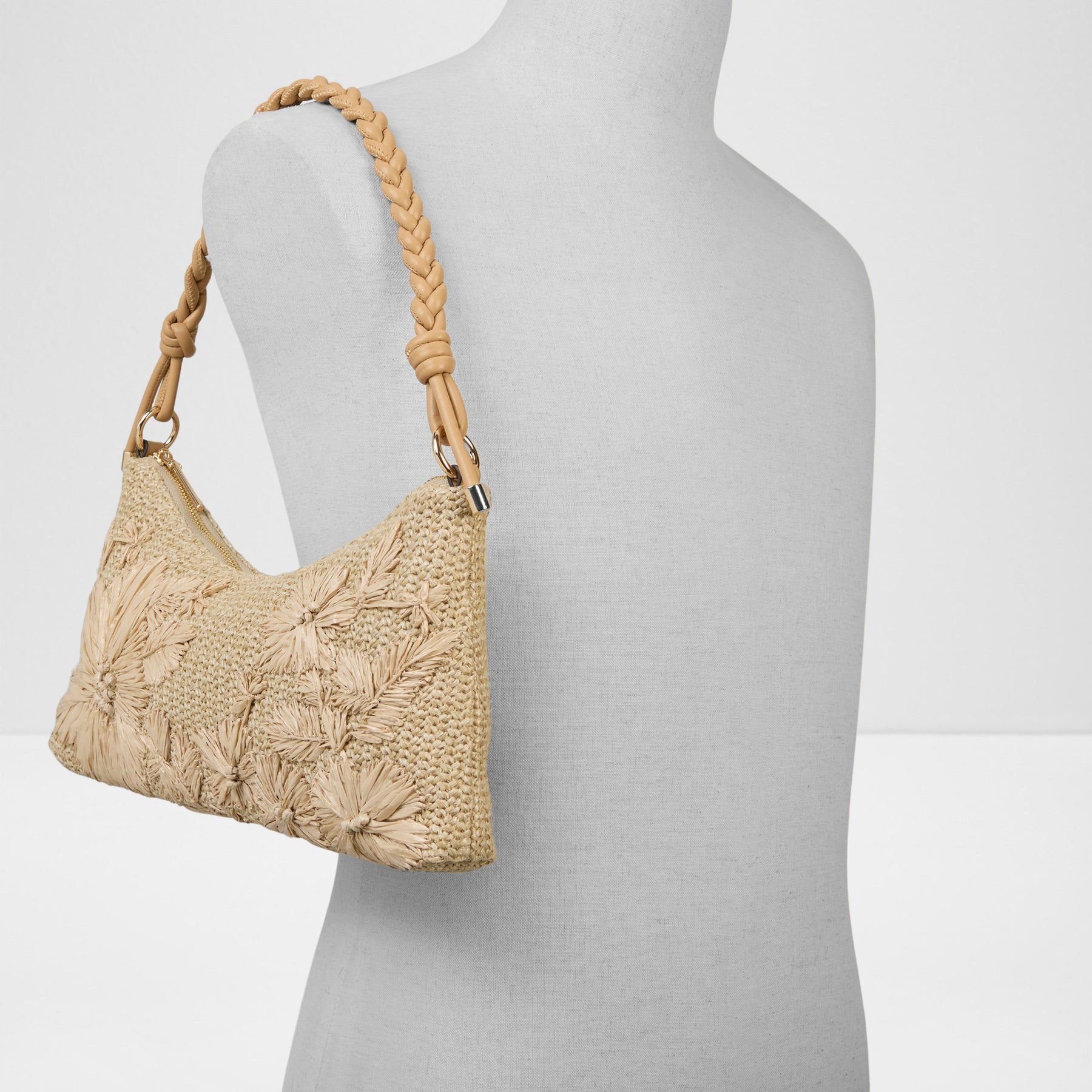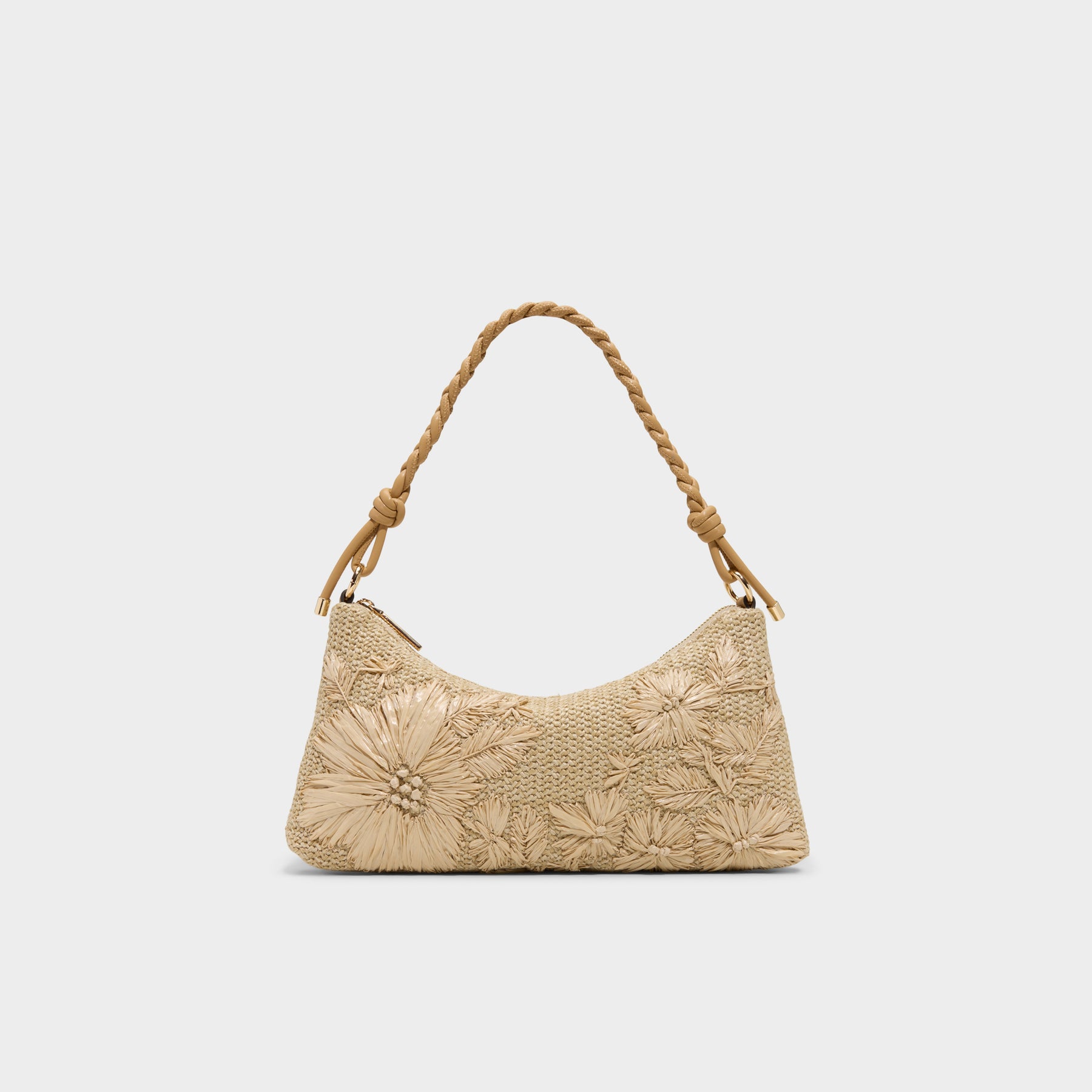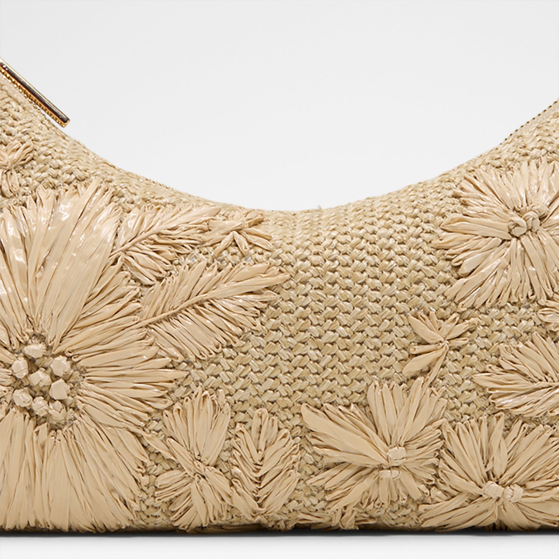 Mala de ombro IRISPOSY para mulher, em bege, com fecho de correr, alça média e material tipo ráfia com flores.