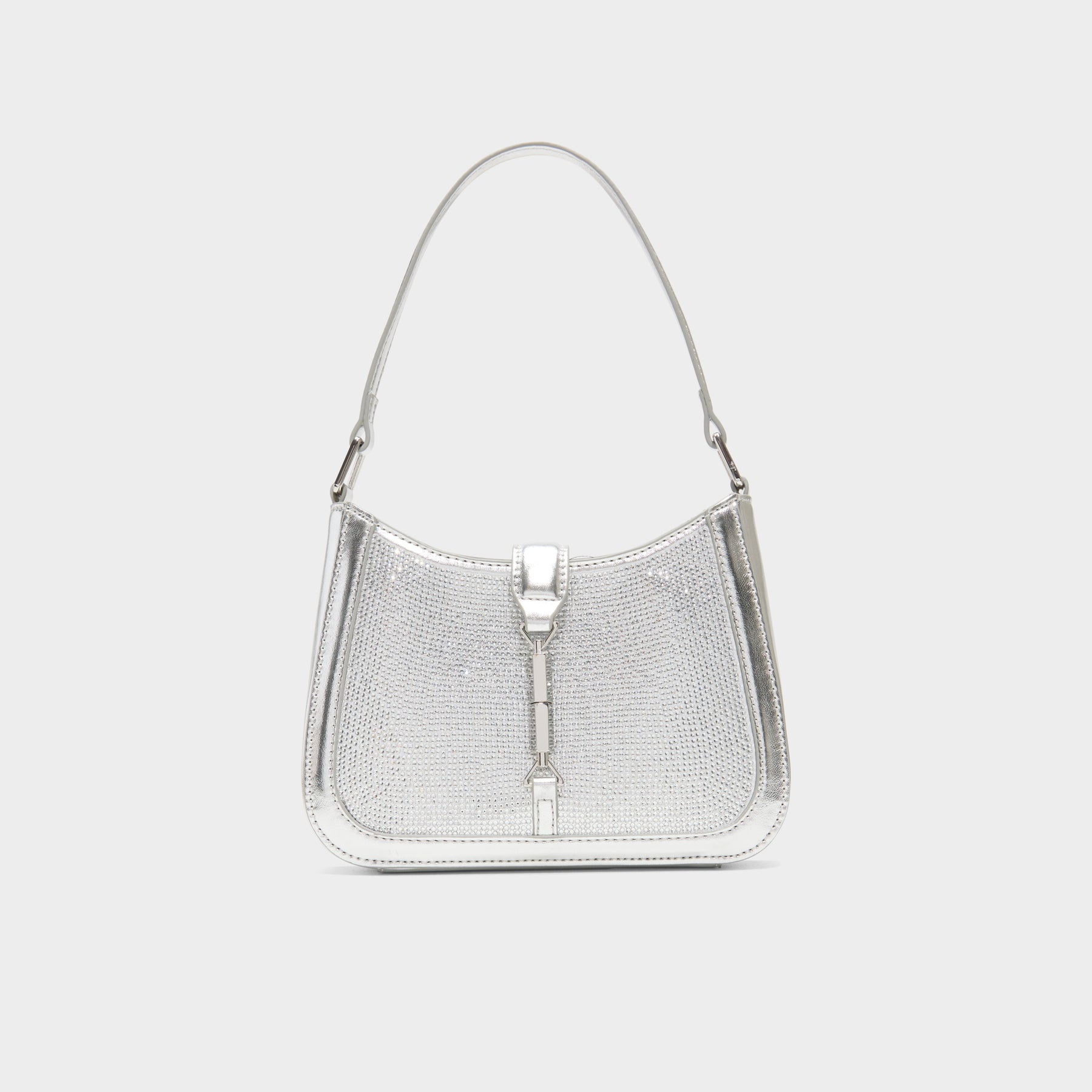 Mala de ombro ELLEBLING para mulher, em prateado, com fecho metálico, alça média e pedras brilhantes. Com uma alça extra para uso de tiracolo.