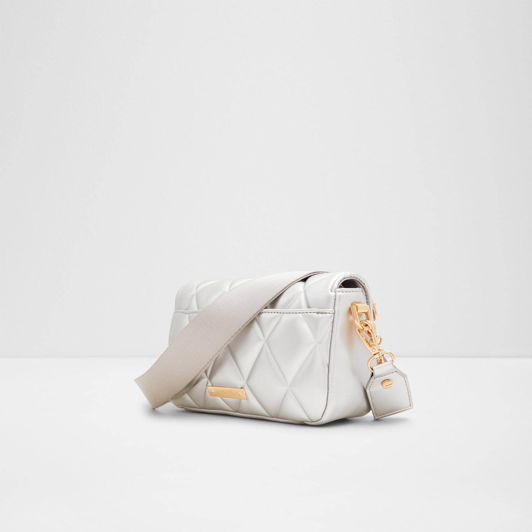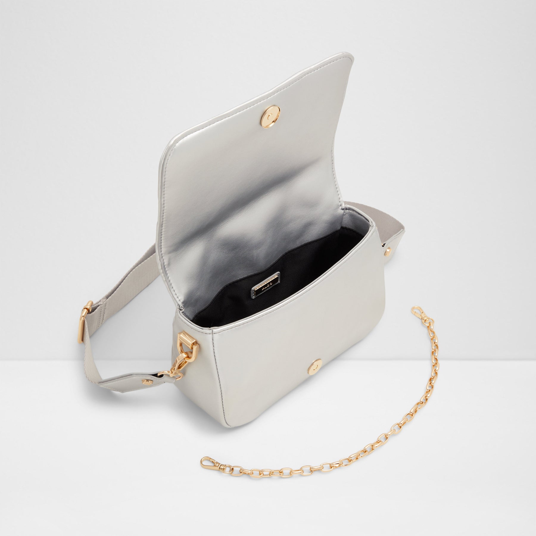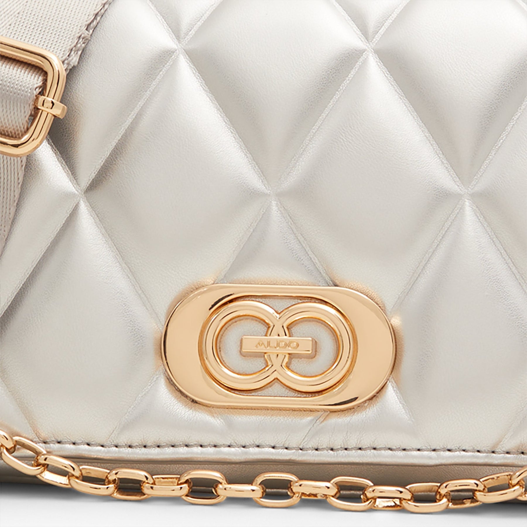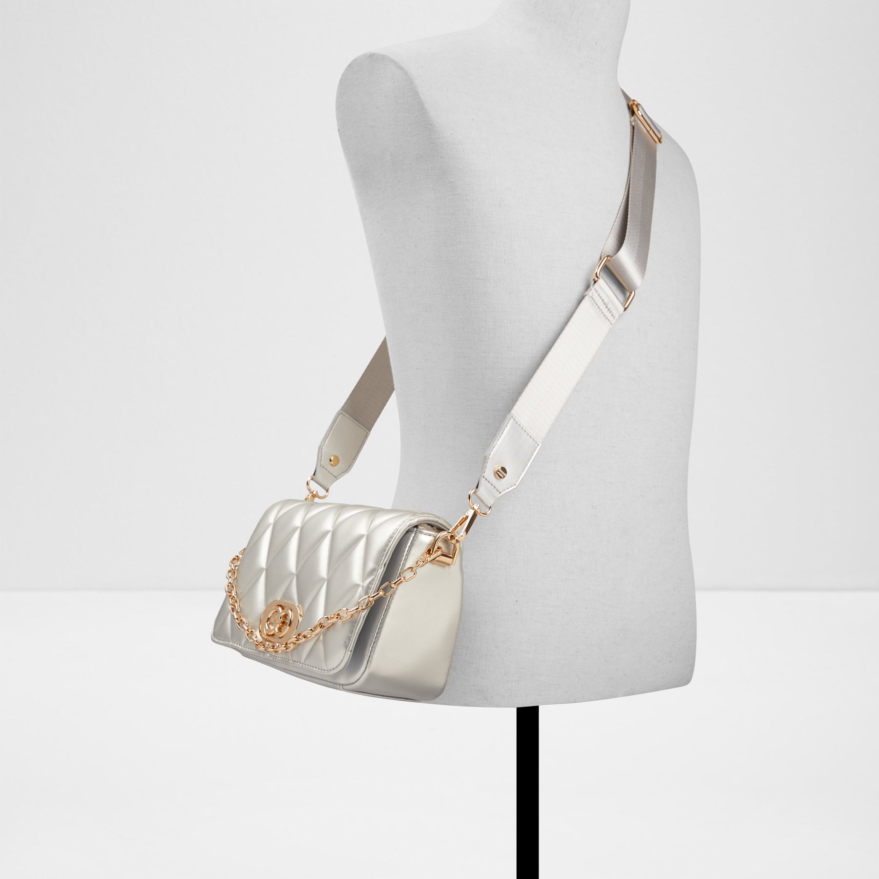 Mala de tiracolo ENOBRENA para mulher, em prateado, com fecho magnético, alça comprida e uma textura acolchoada. Com uma corrente decorativa.