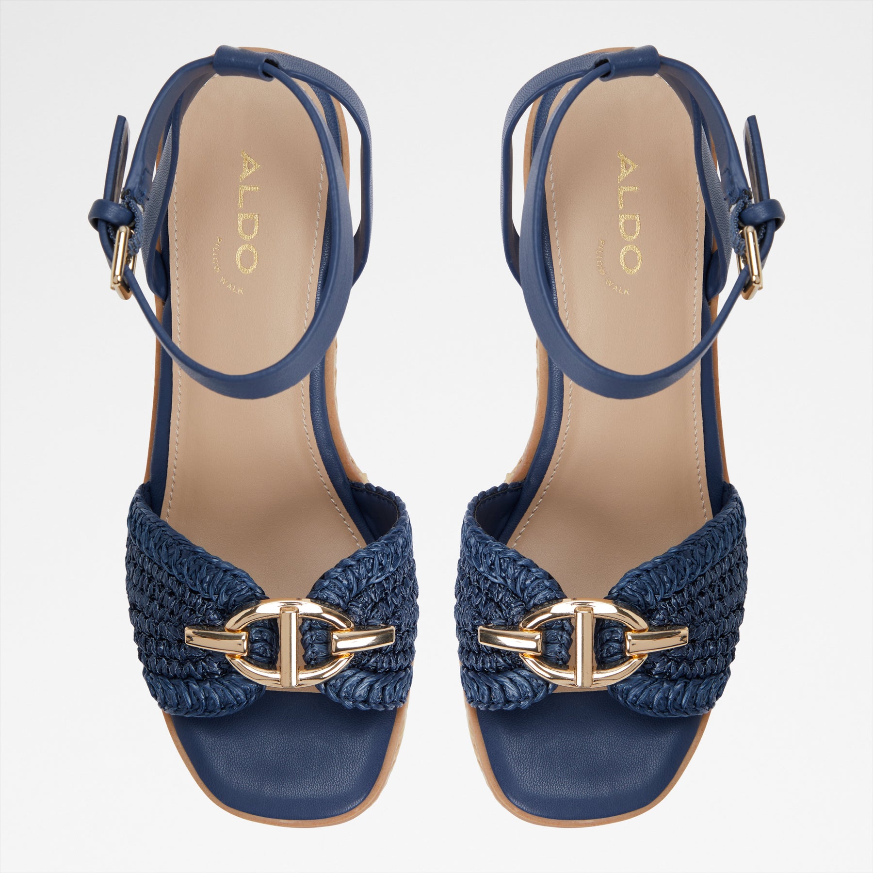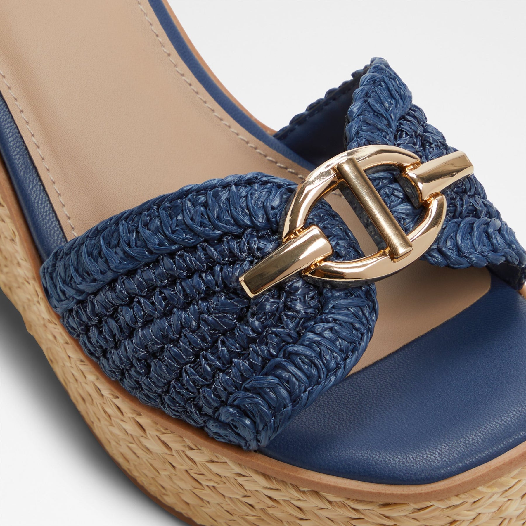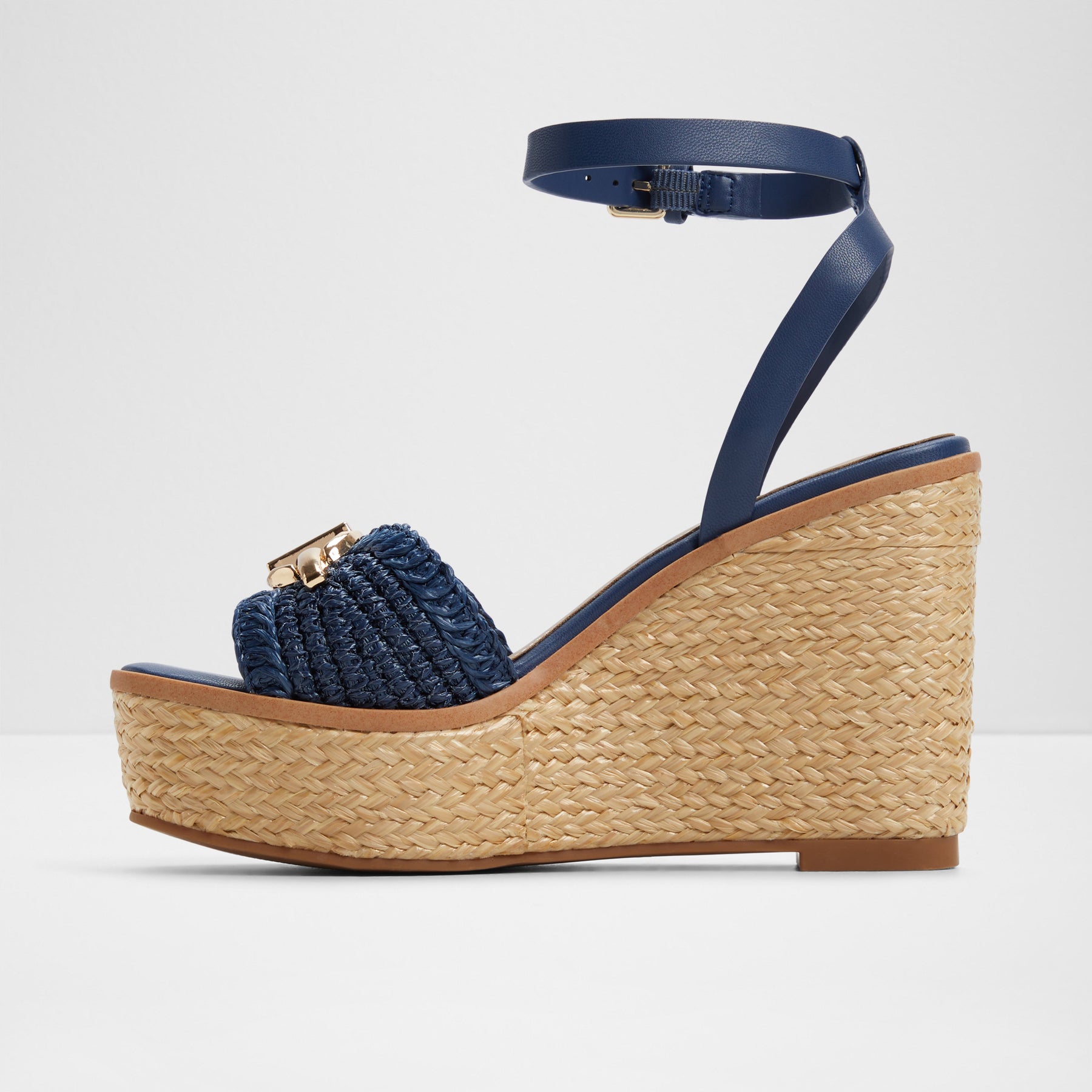 Sandálias YBYLIN para mulher, em azul marinho, de salto em cunha, com biqueira quadrada e material tipo ráfia. Com uma textura entrançada no salto. Com fecho de fivela no tornozelo.