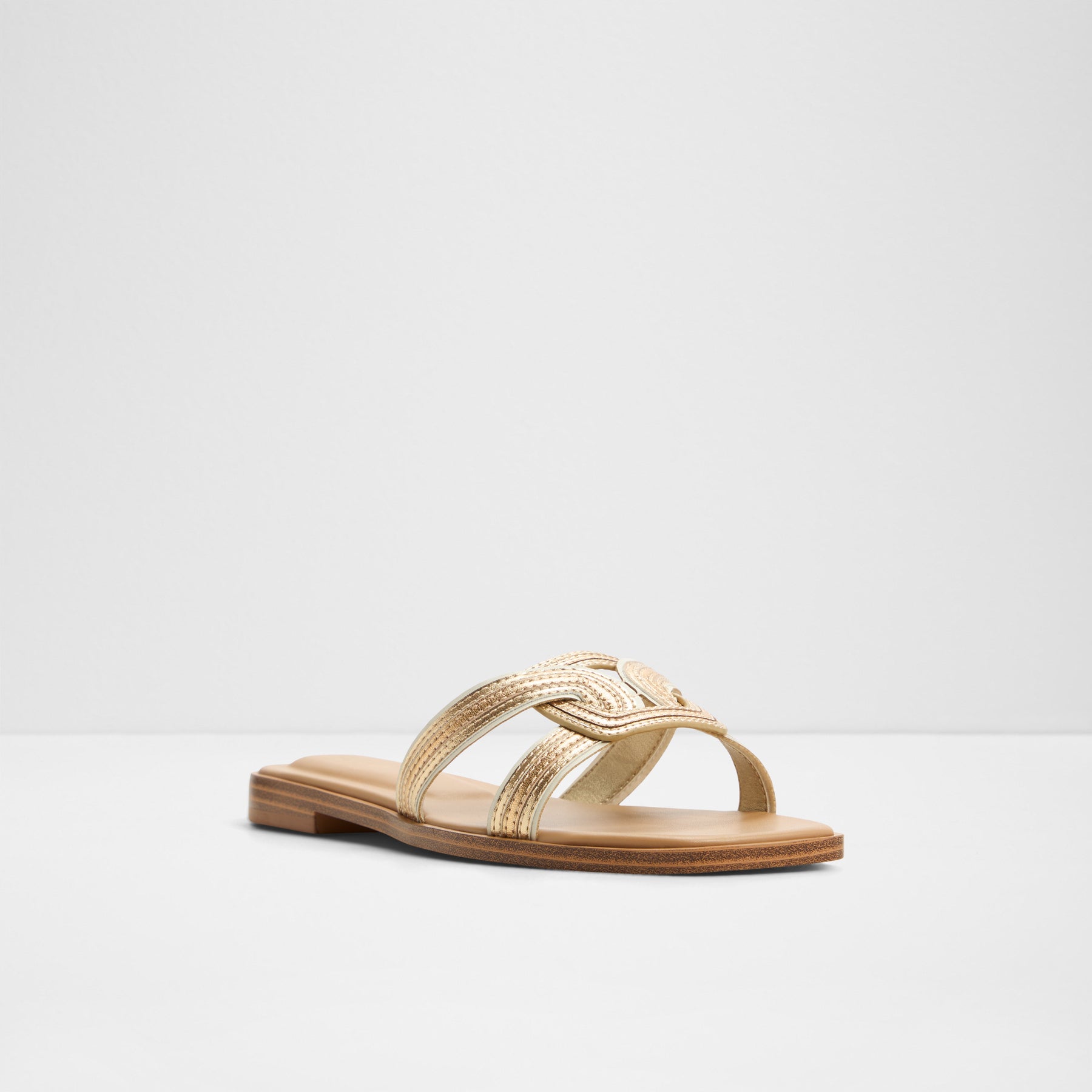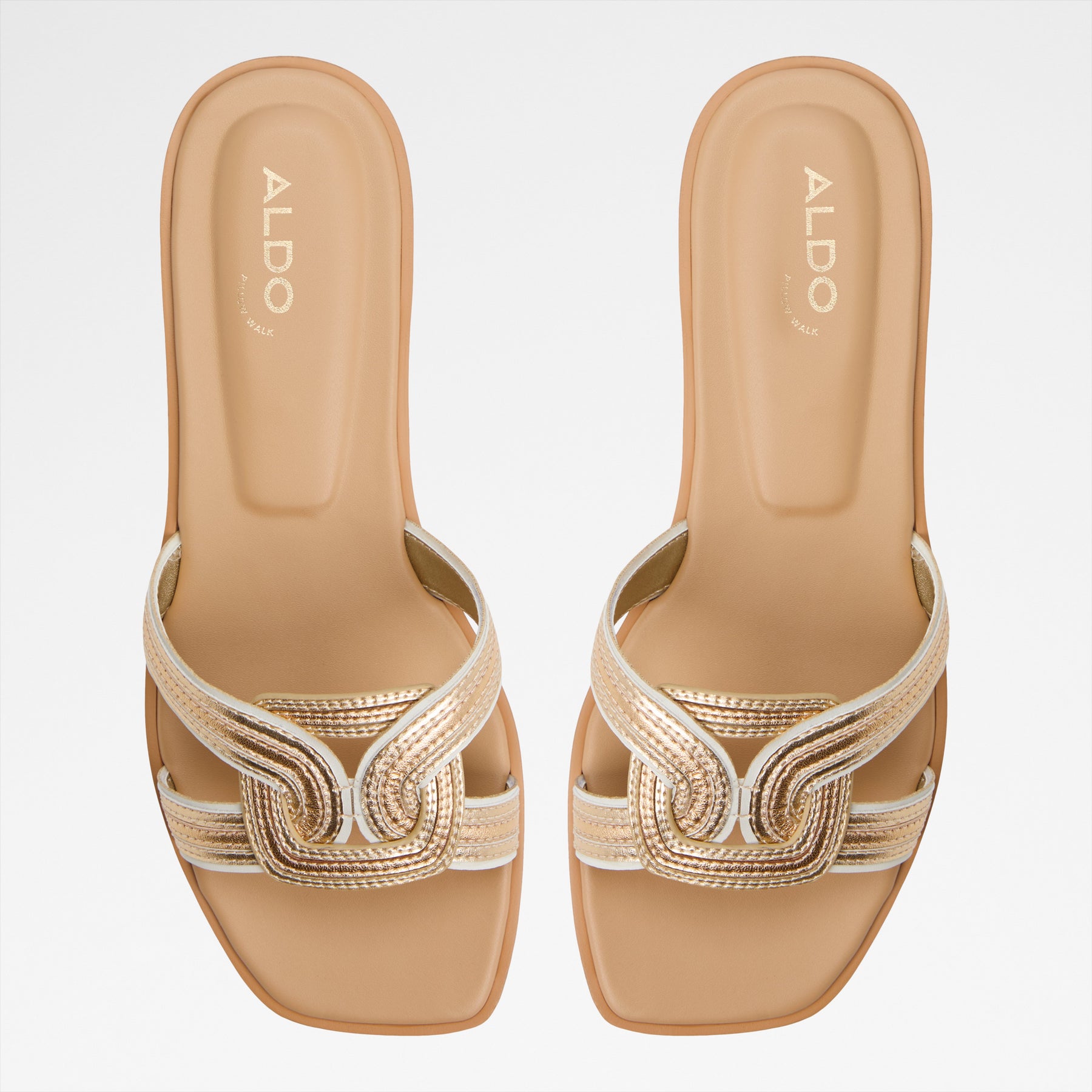 Sandálias rasas EROK para mulher, em dourado e com biqueira quadrada.