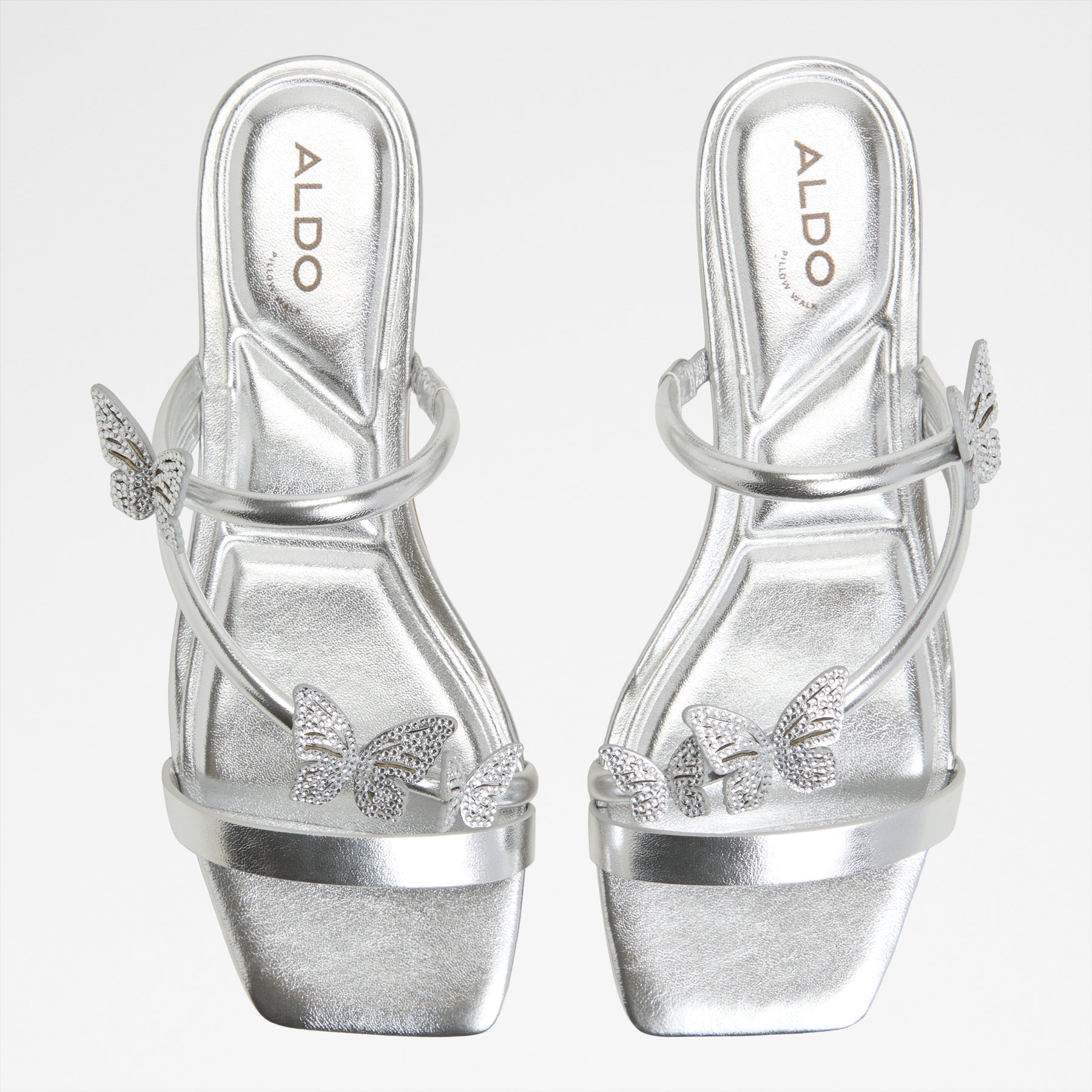 Sandálias rasas FLYHIGH para mulher, em prateado, com biqueira quadrada e apliques de borboletas.