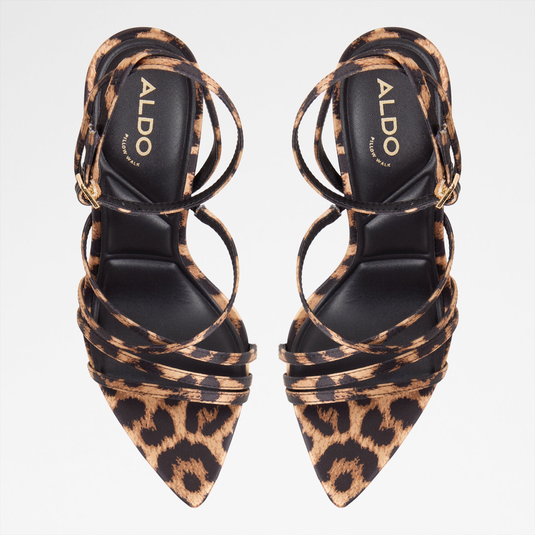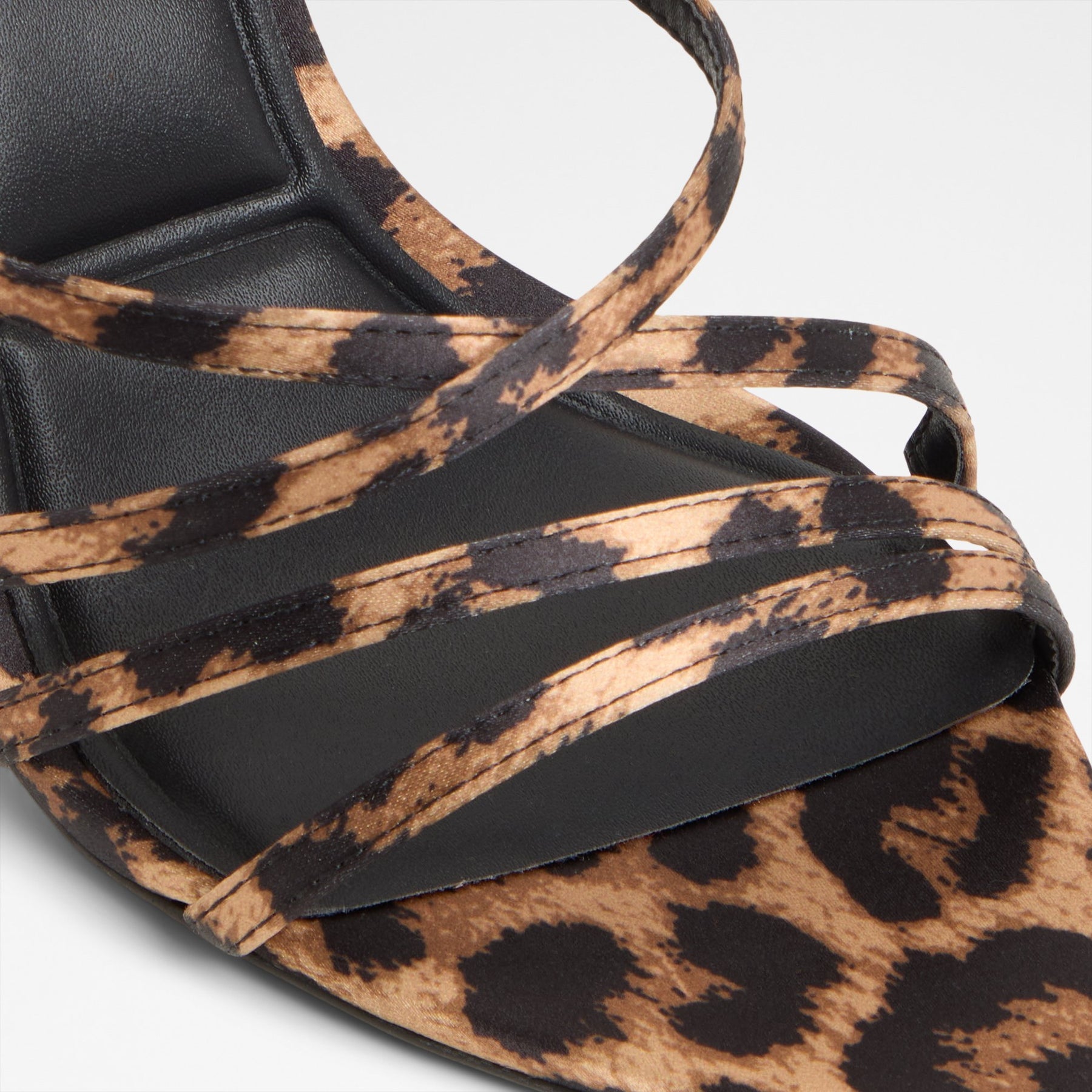 Sandálias SOLANIA para mulher, em preto, de salto fino, com biqueira pontiaguda e um padrão de pele animal. Com fecho de fivela no tornozelo.