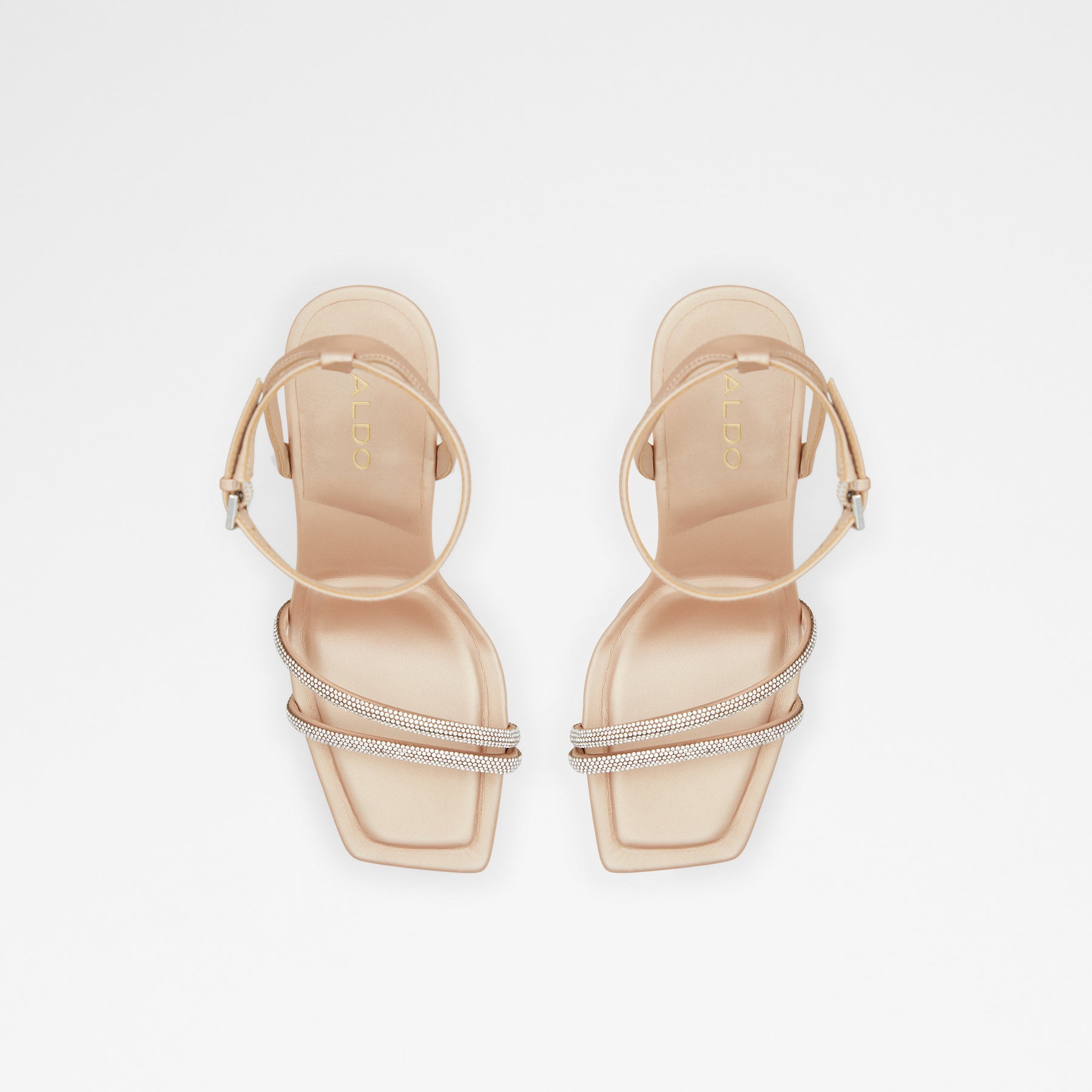Sandálias TINTIN para mulher, em bege, de salto em bloco, com biqueira quadrada e pedras brilhantes. Com fecho de fivela no tornozelo.