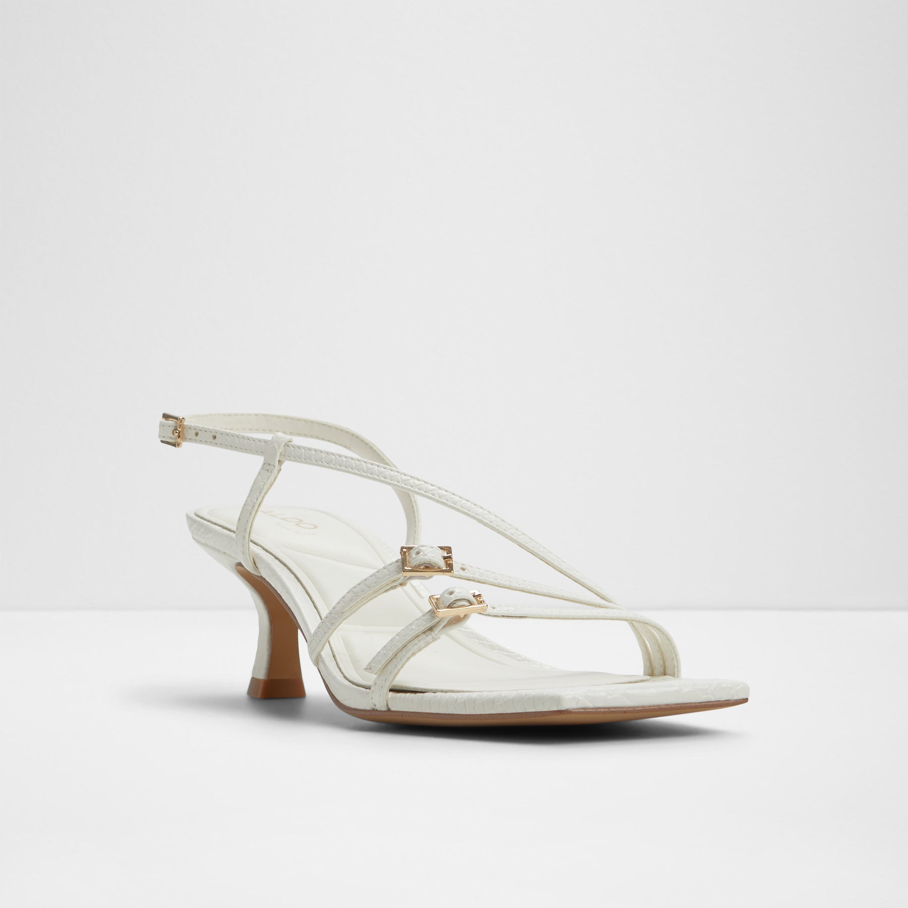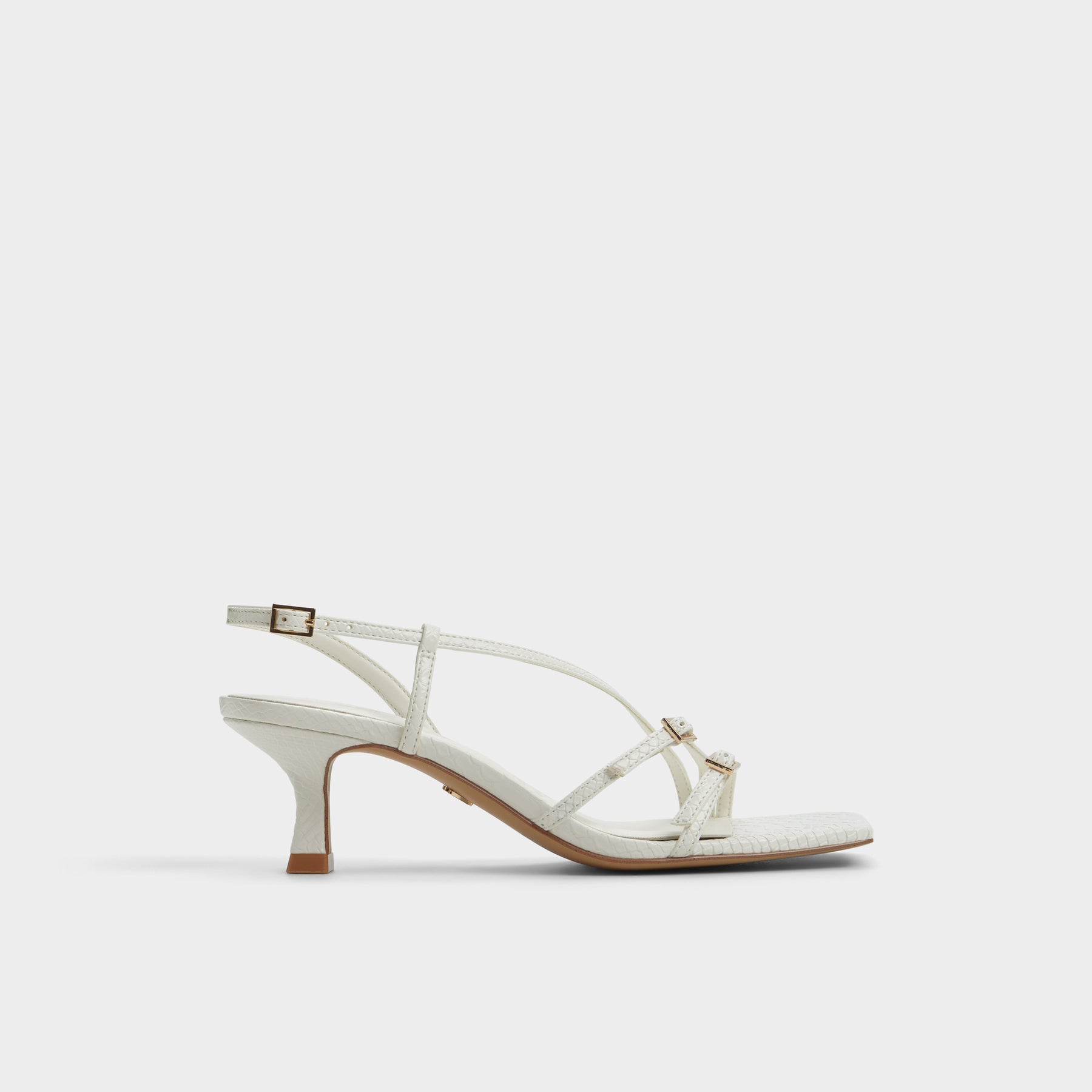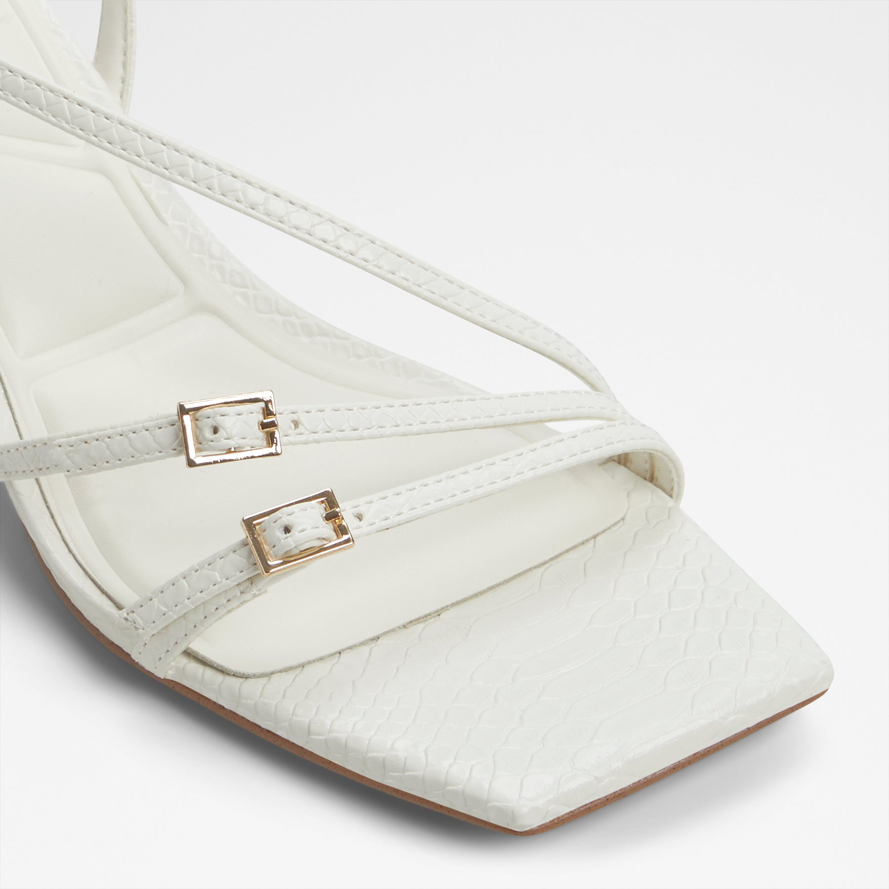 Sandálias HARLIE para mulher, em branco, de salto em funil, com biqueira quadrada e fivelas decorativas. Com padrão de pele animal. Com fecho de fivela no tornozelo.