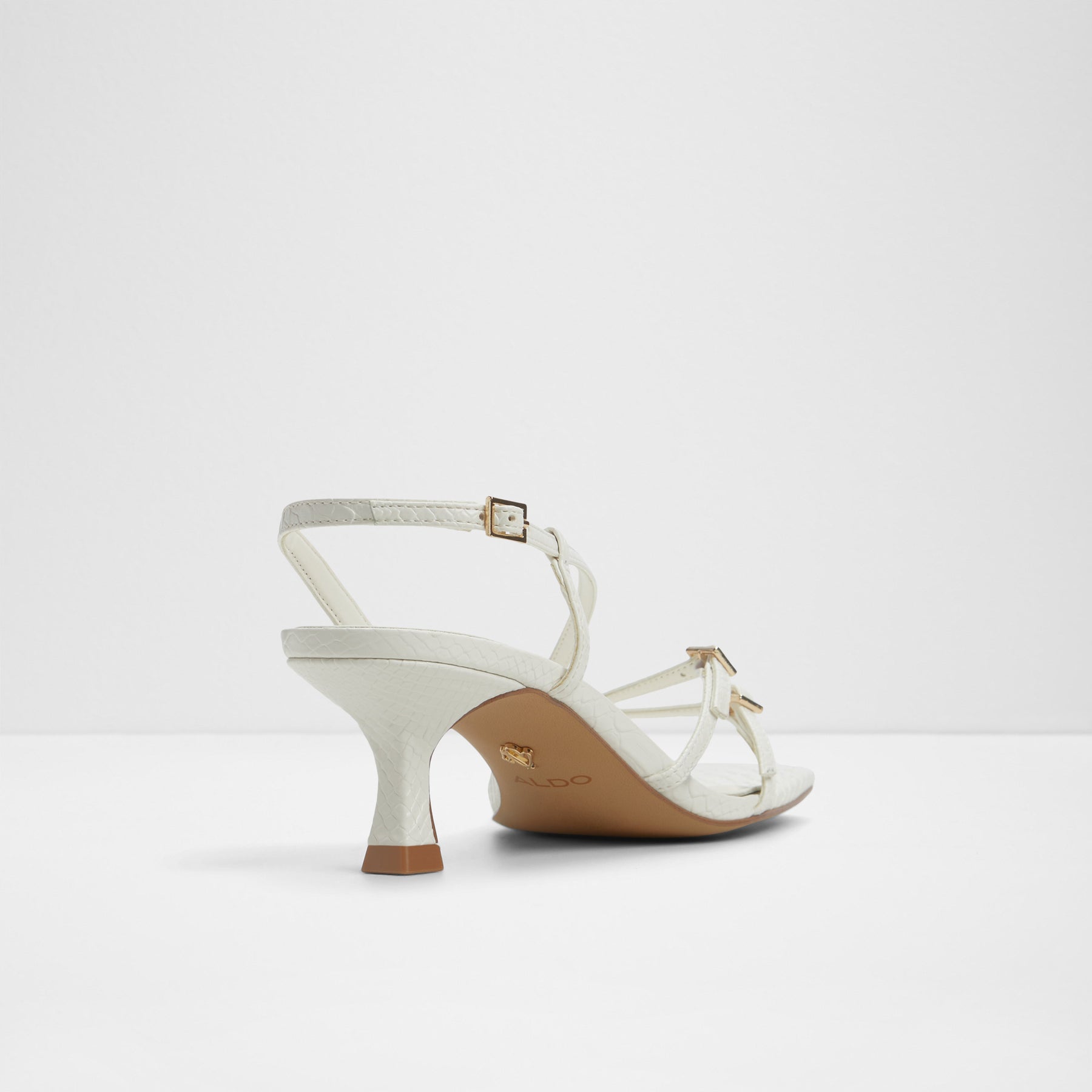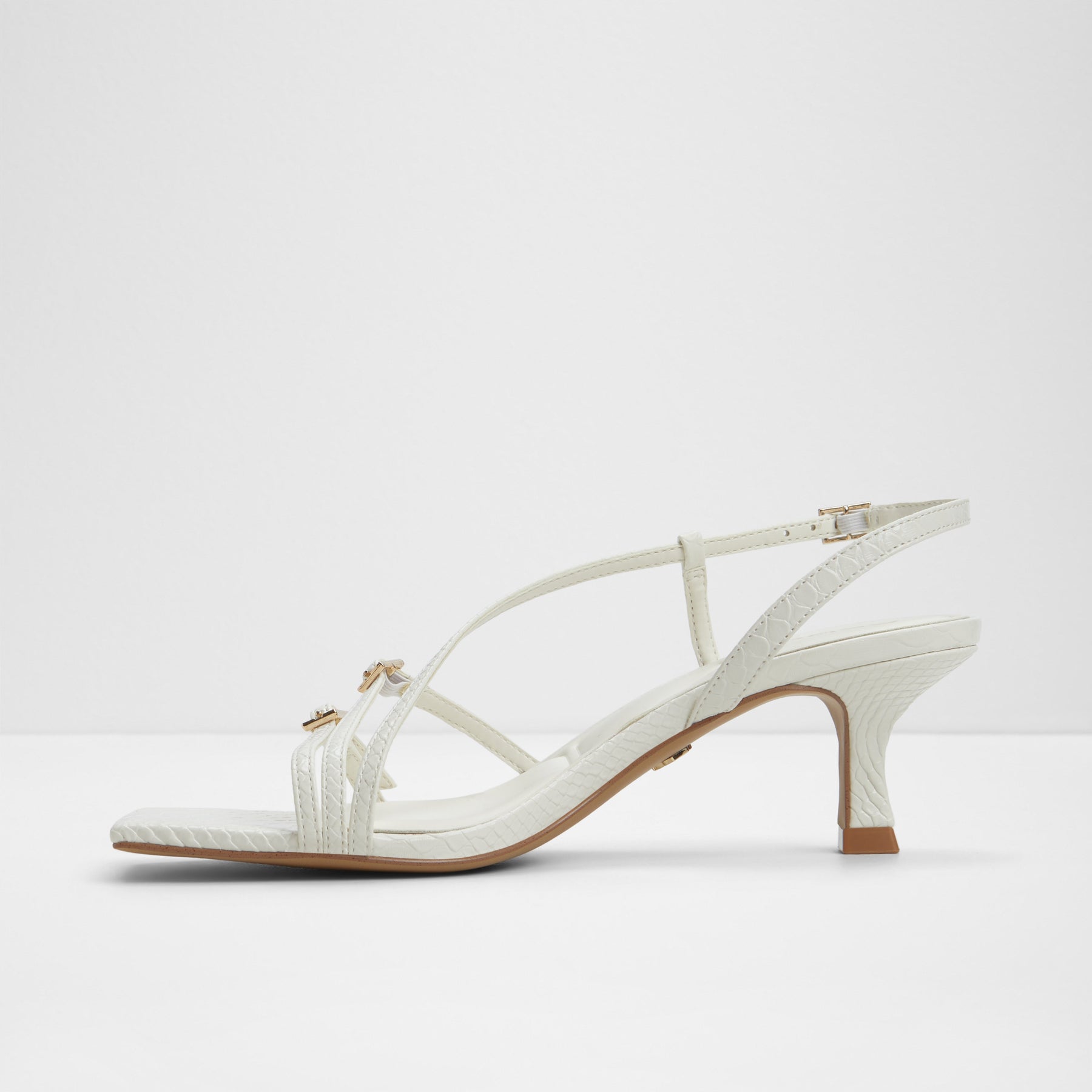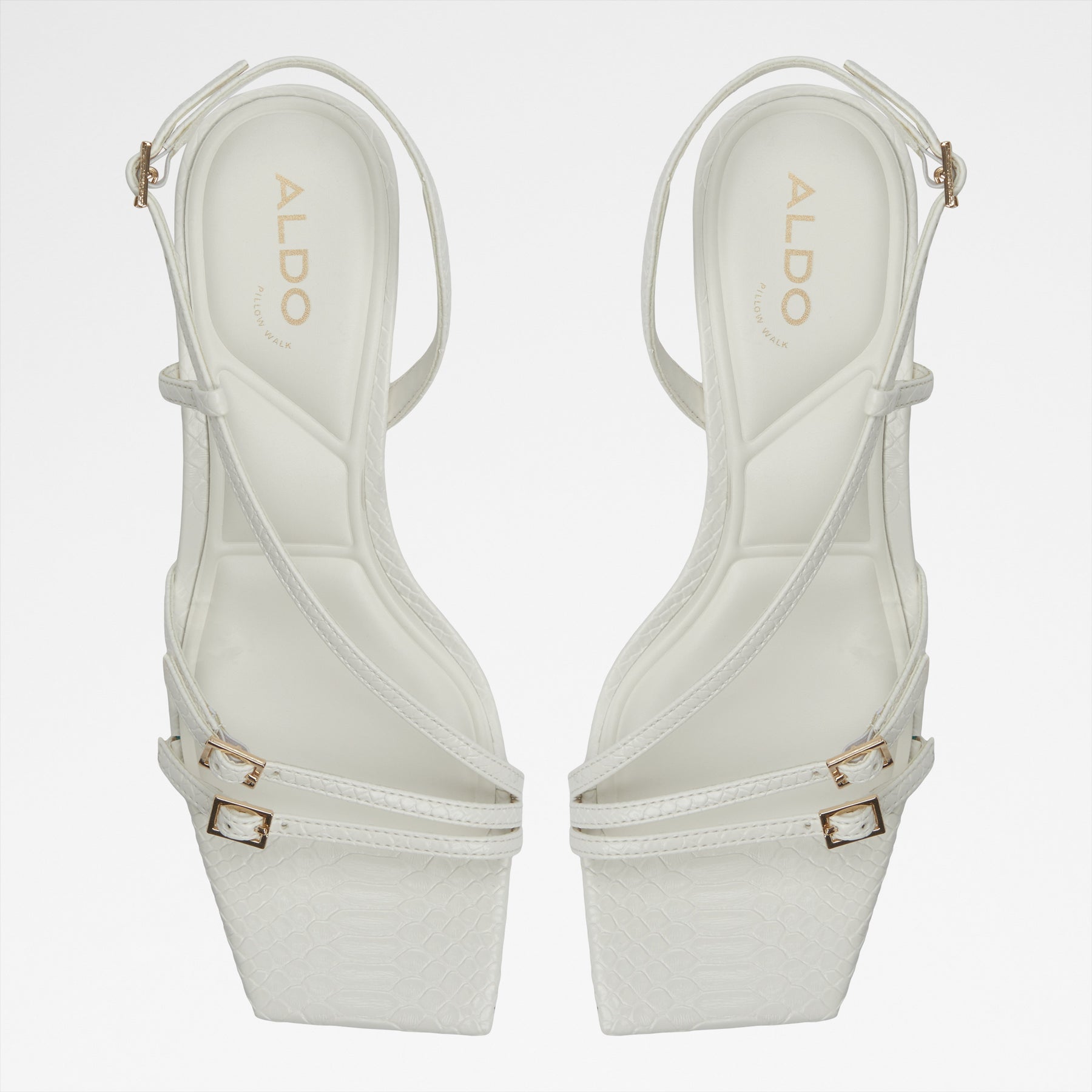 Sandálias HARLIE para mulher, em branco, de salto em funil, com biqueira quadrada e fivelas decorativas. Com padrão de pele animal. Com fecho de fivela no tornozelo.