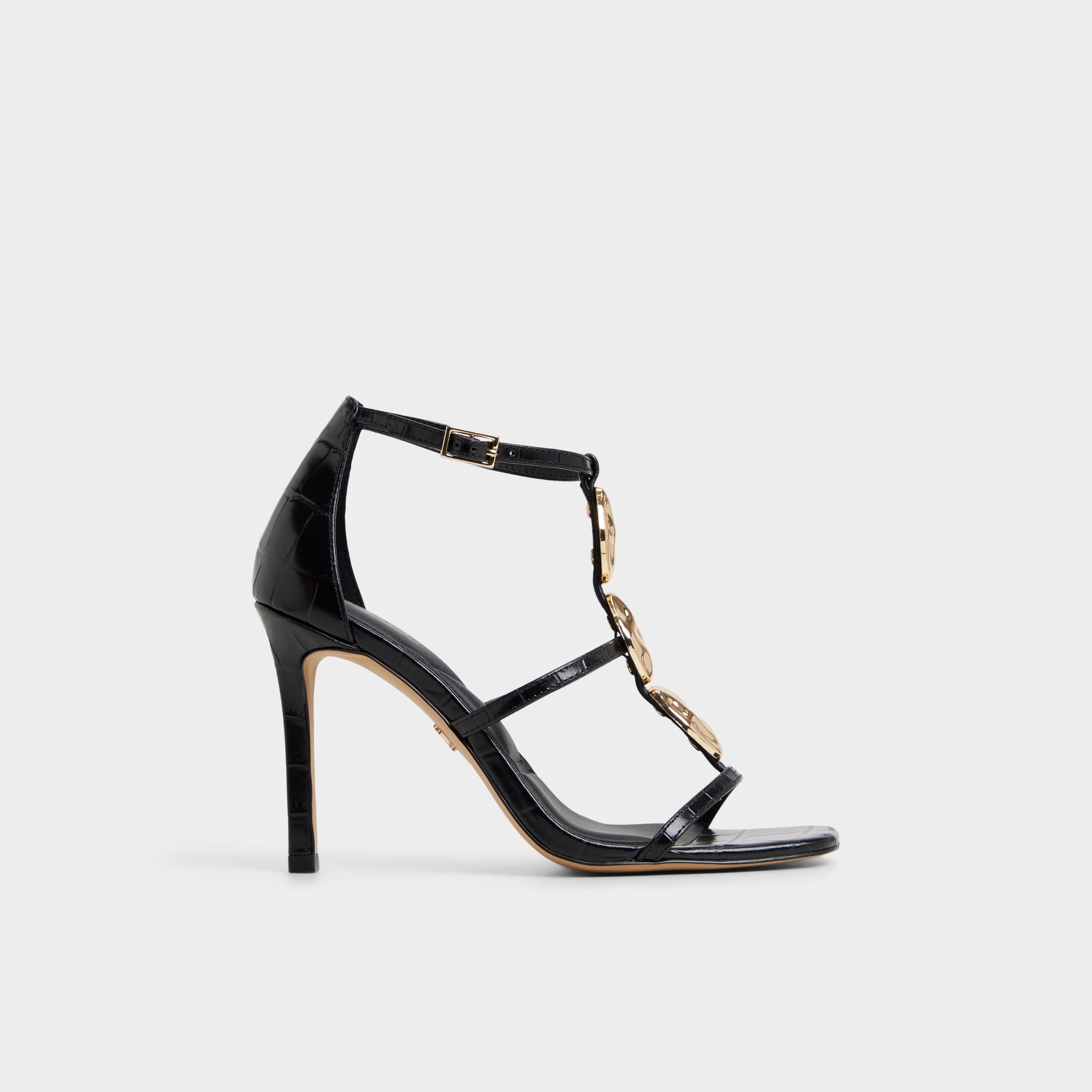 Sandálias BASILS para mulher, em pele, em preto, de salto fino, com biqueira quadrada e apliques metálicos decorativos no peito do pé. Com textura de pele animal. Com fecho de fivela no tornozelo.