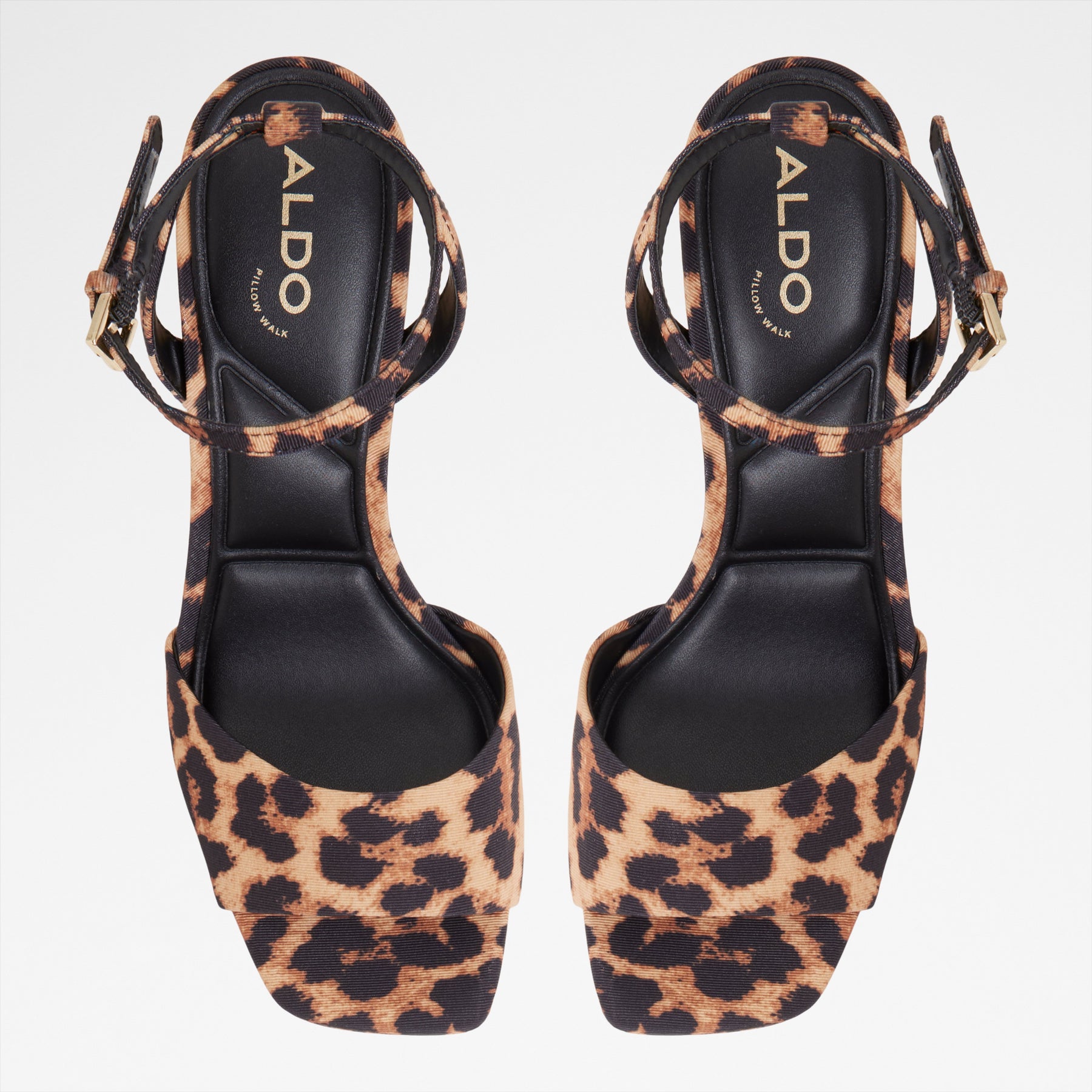 Sandálias CHICGLEAM para mulher, em preto, de salto em bloco com plataforma, com biqueira quadrada e um padrão de pele animal. Com fecho de fivela no tornozelo.