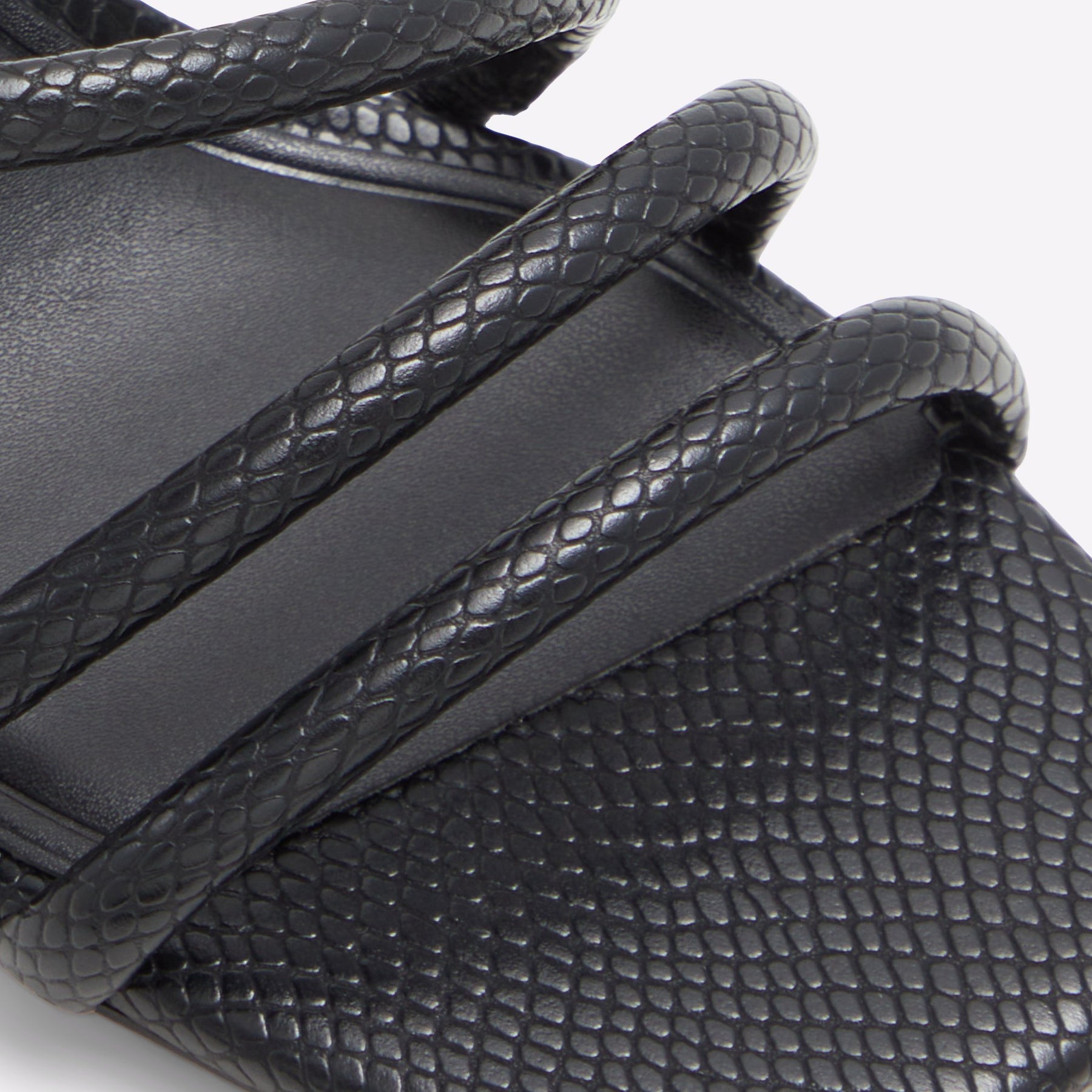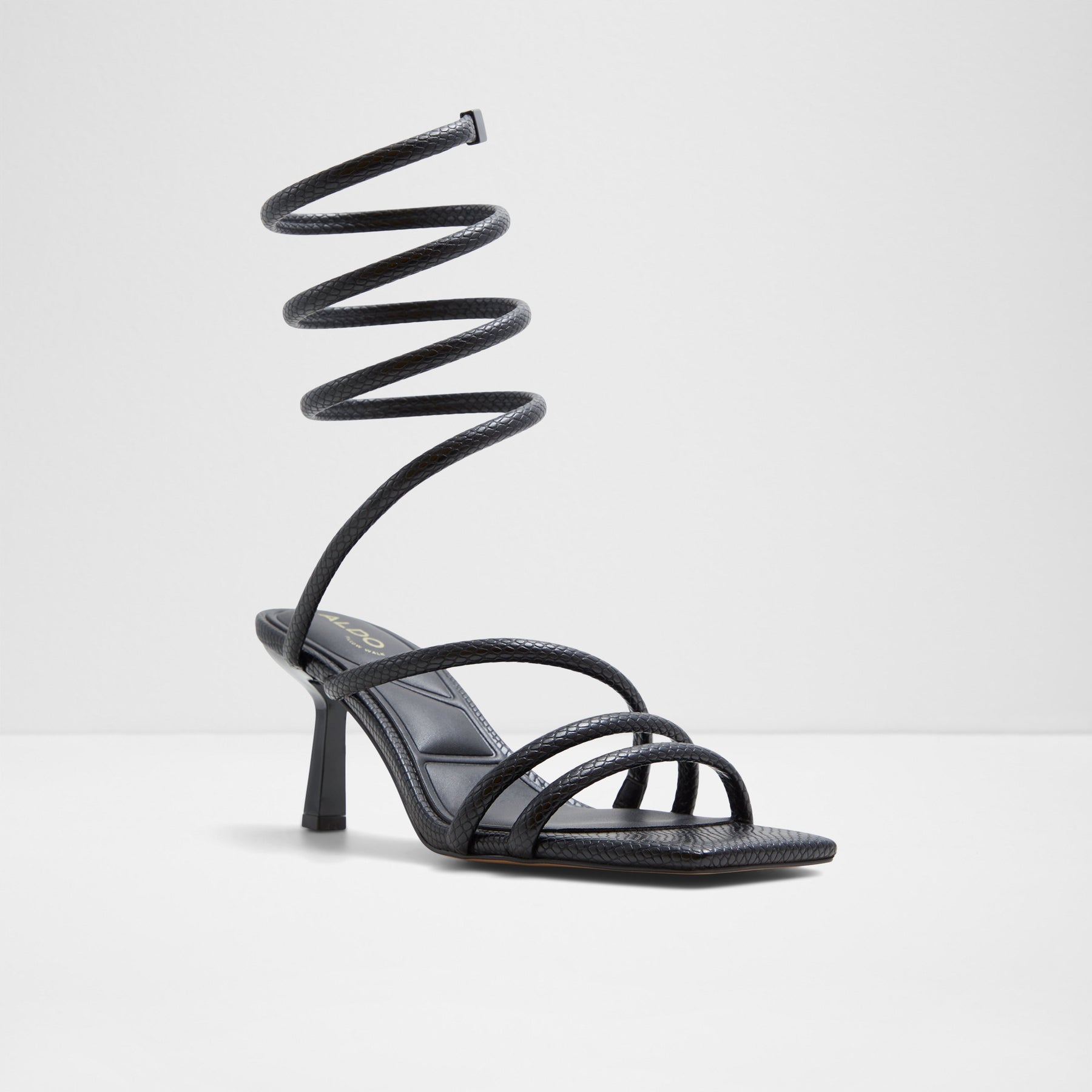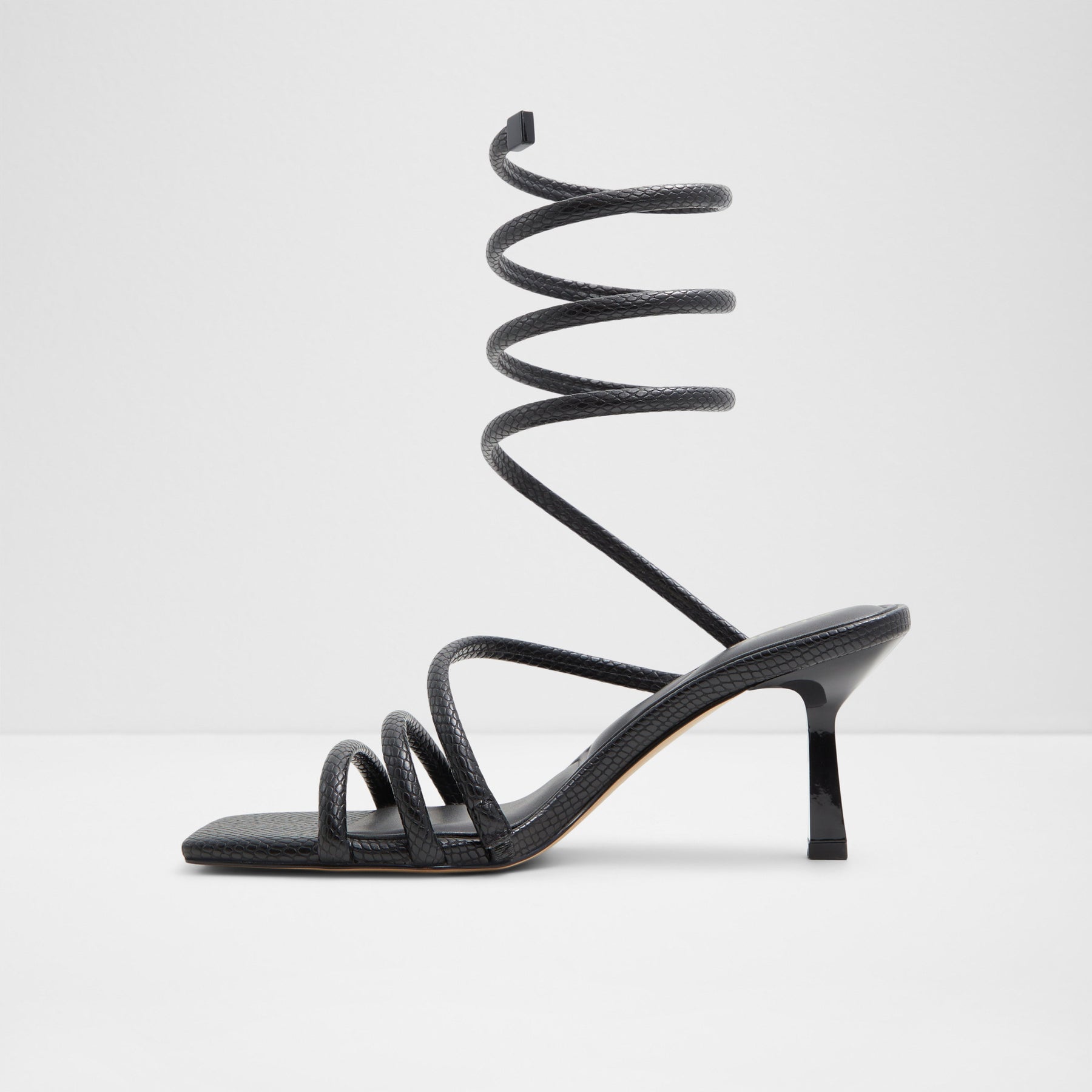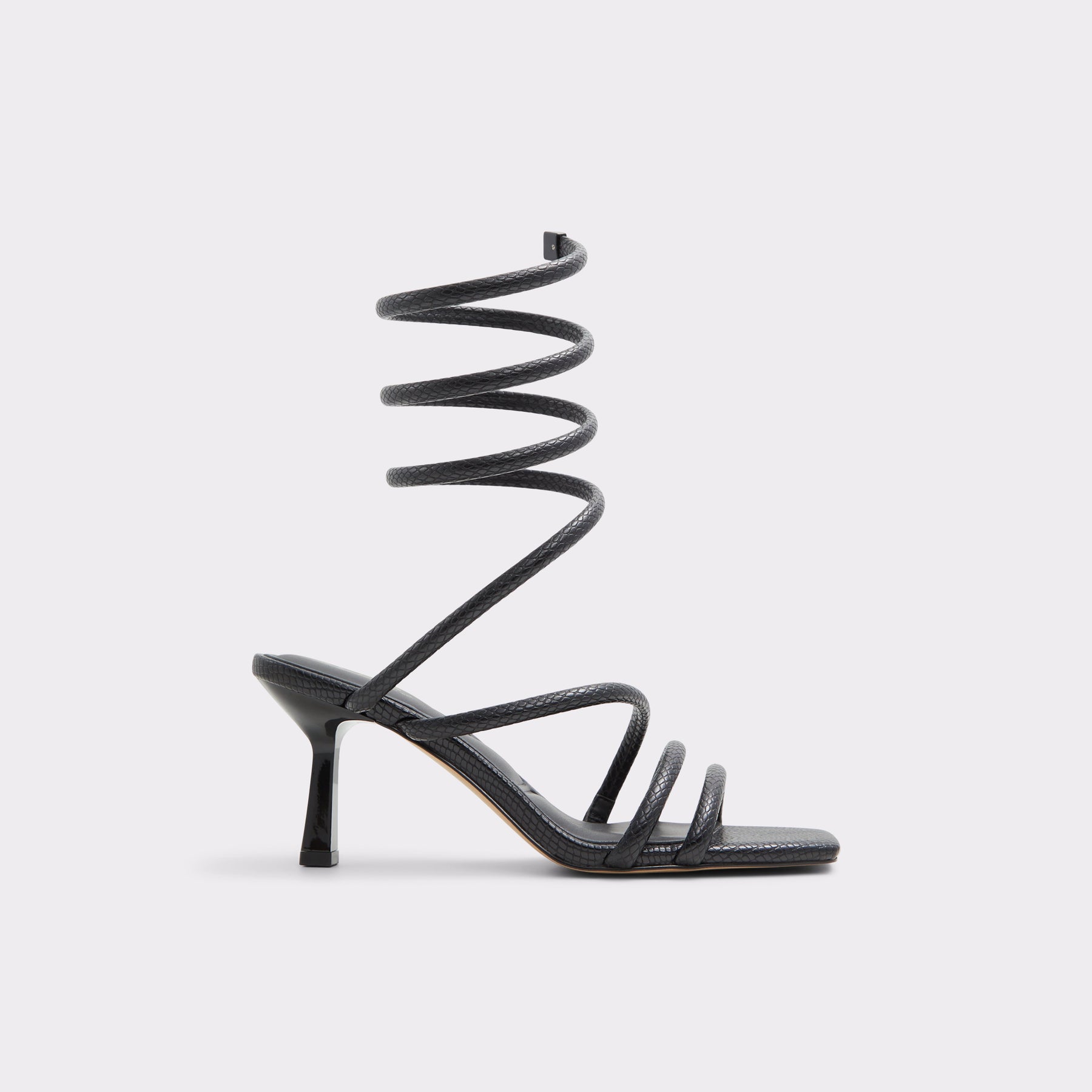 Sandálias TWIRLY para mulher, em preto, de salto fino, com biqueira quadrada e uma textura de pele animal. Com aperto de tiras em espiral no tornozelo.
