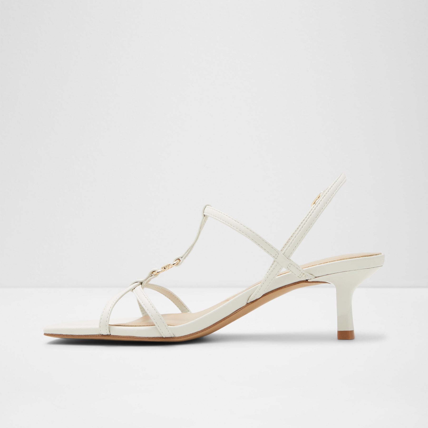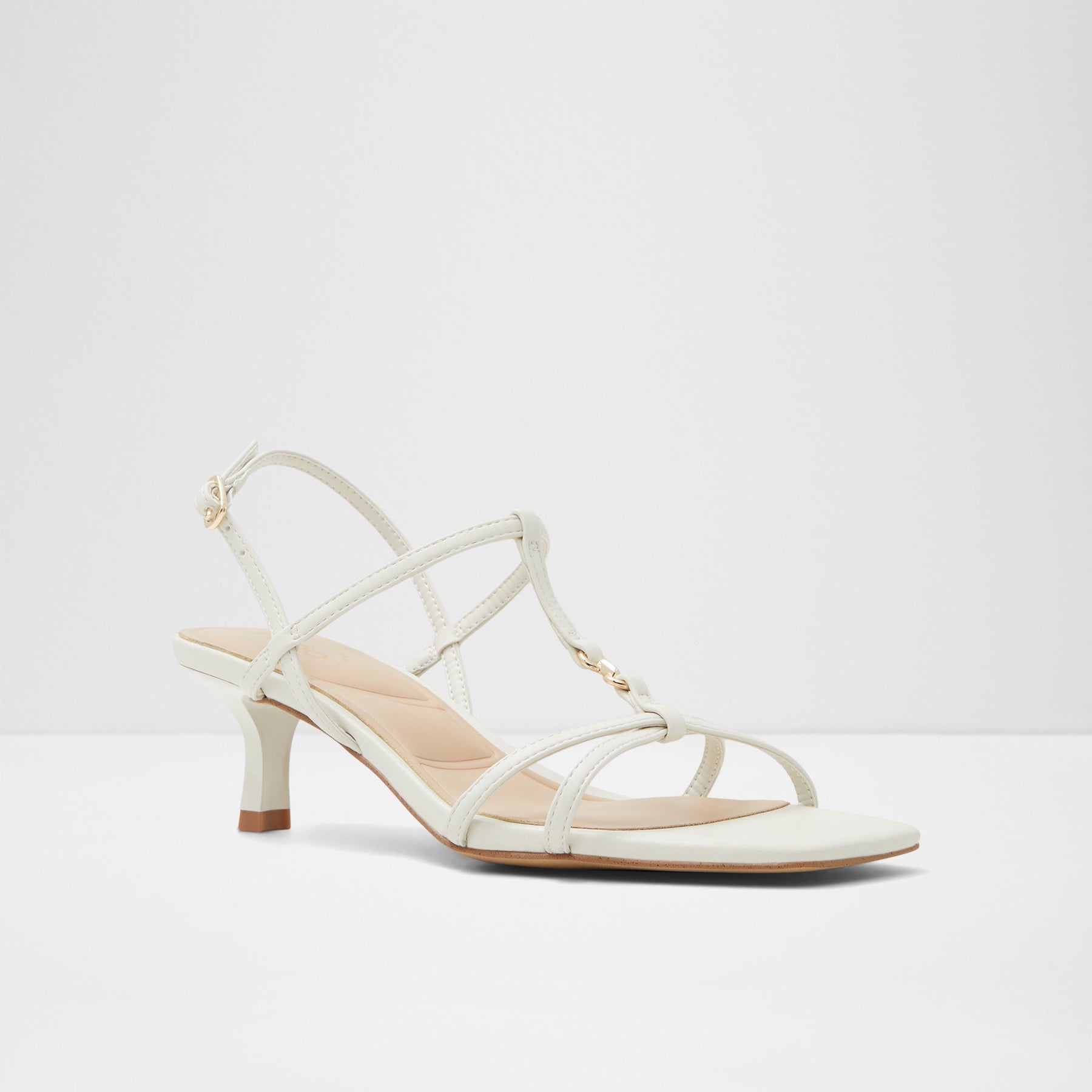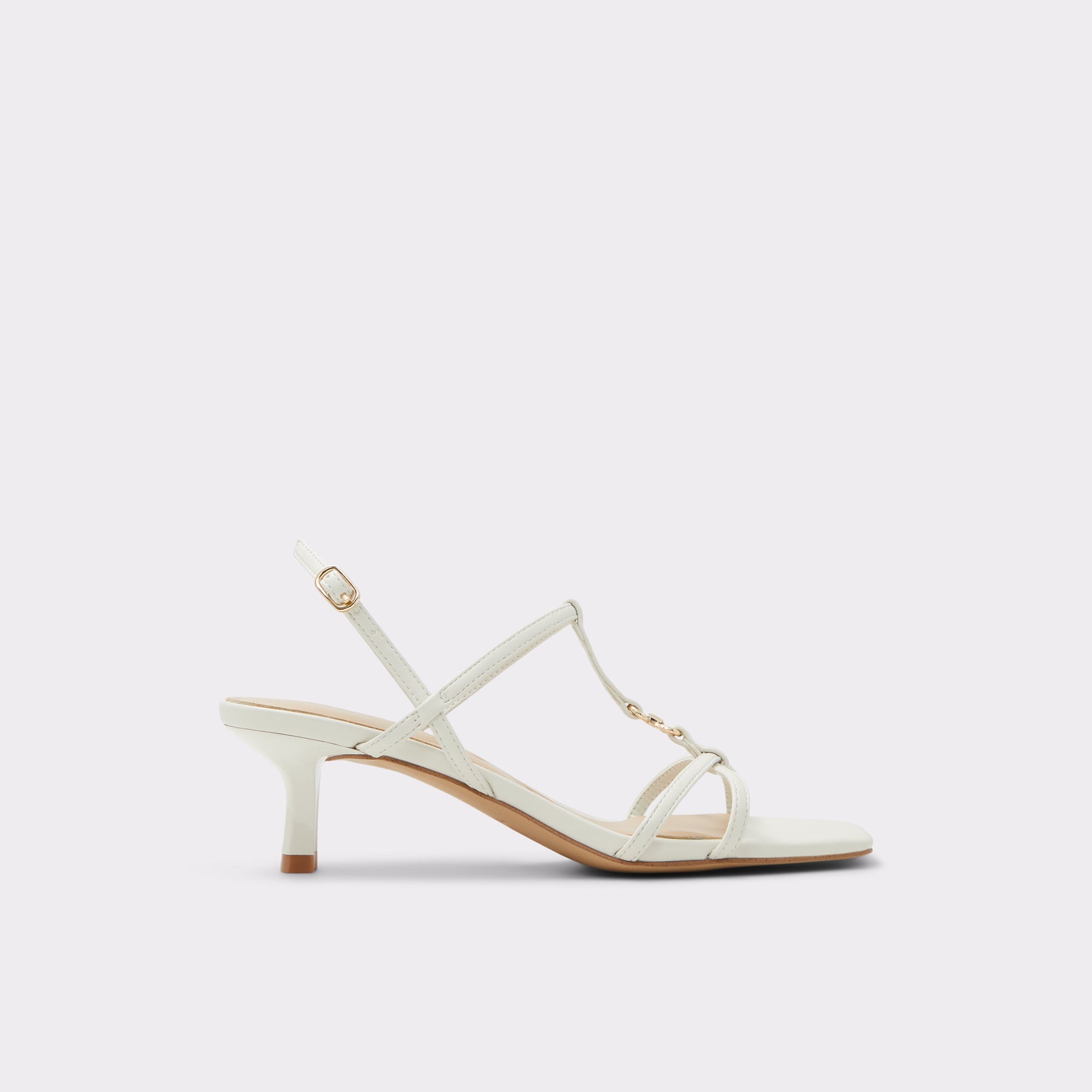 Sandálias JOSEFINA para mulher, em branco, de salto fino, com biqueira quadrada e um aplique metálico. Com fecho de fivela no tornozelo.