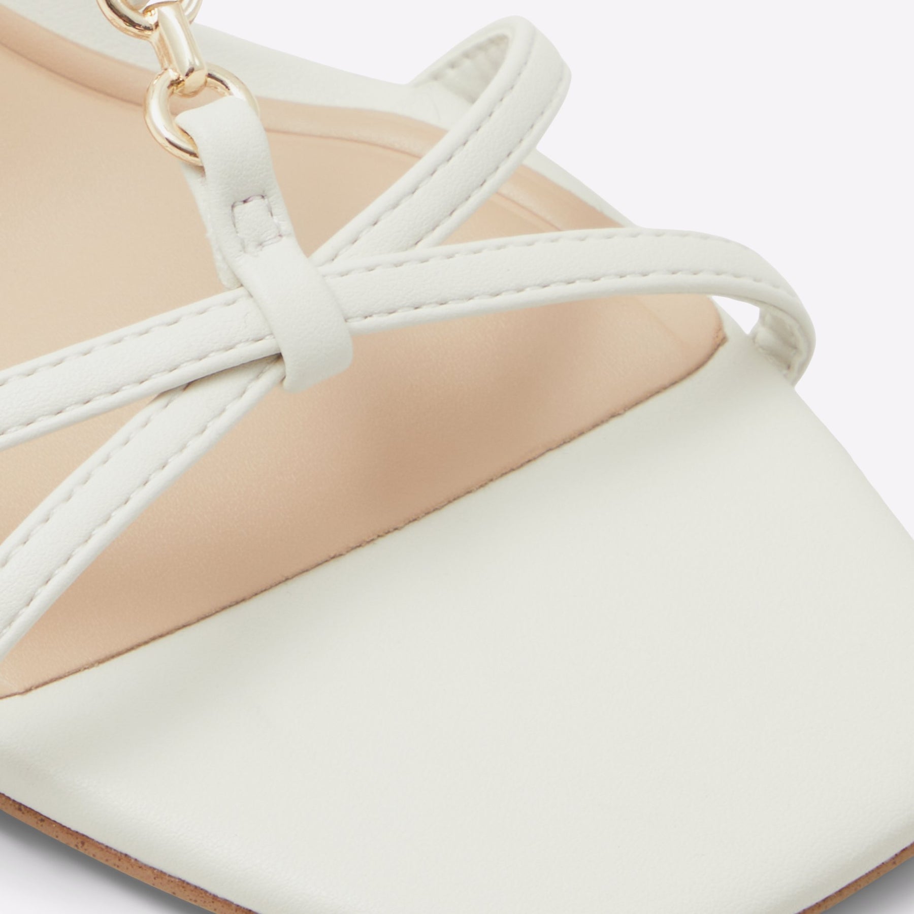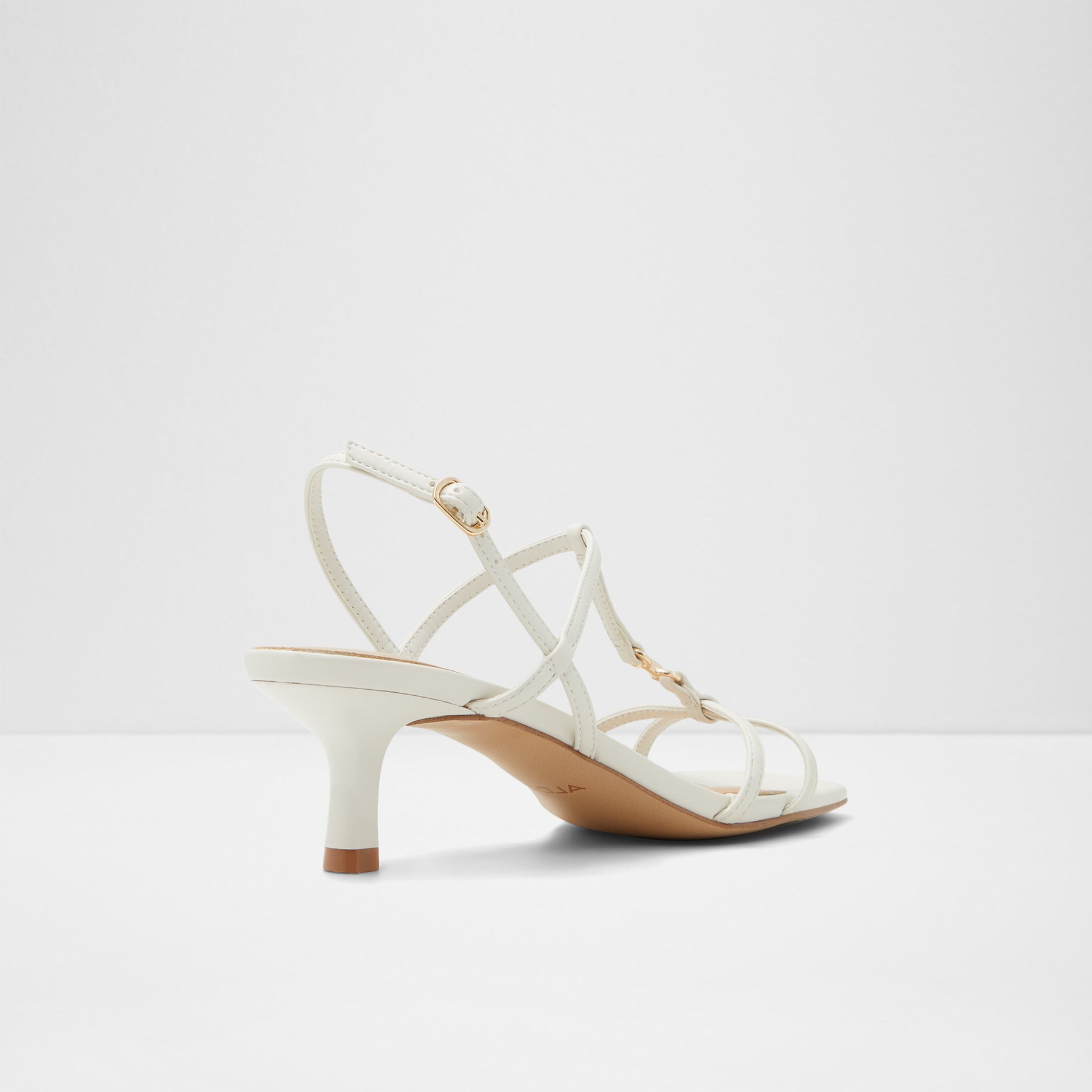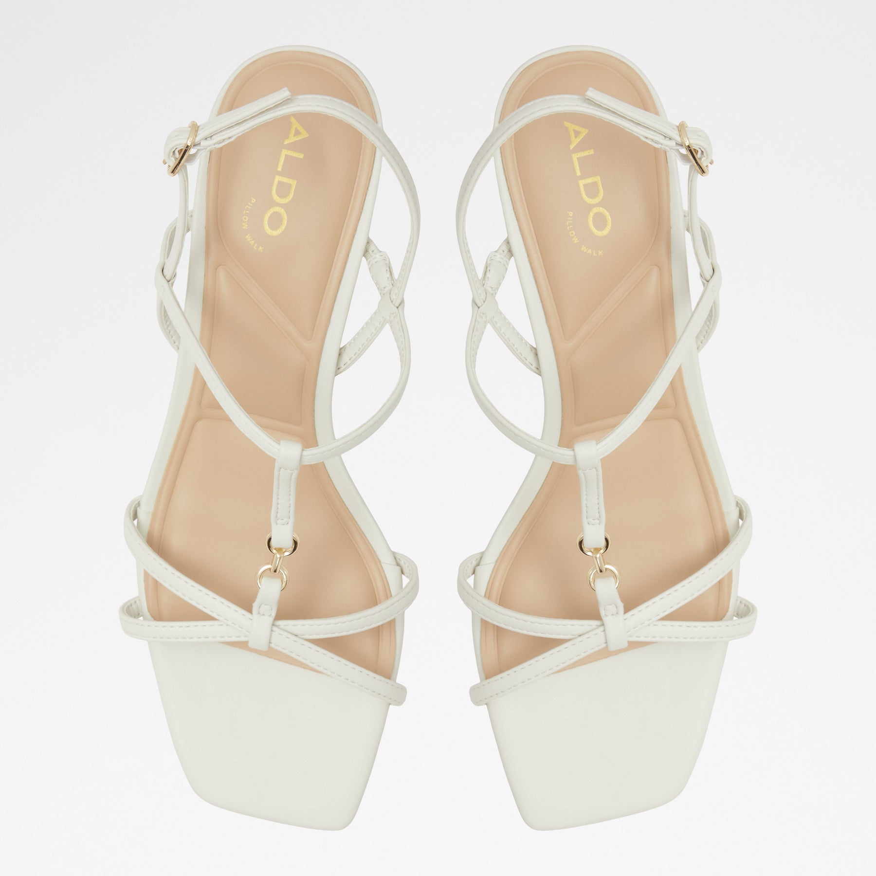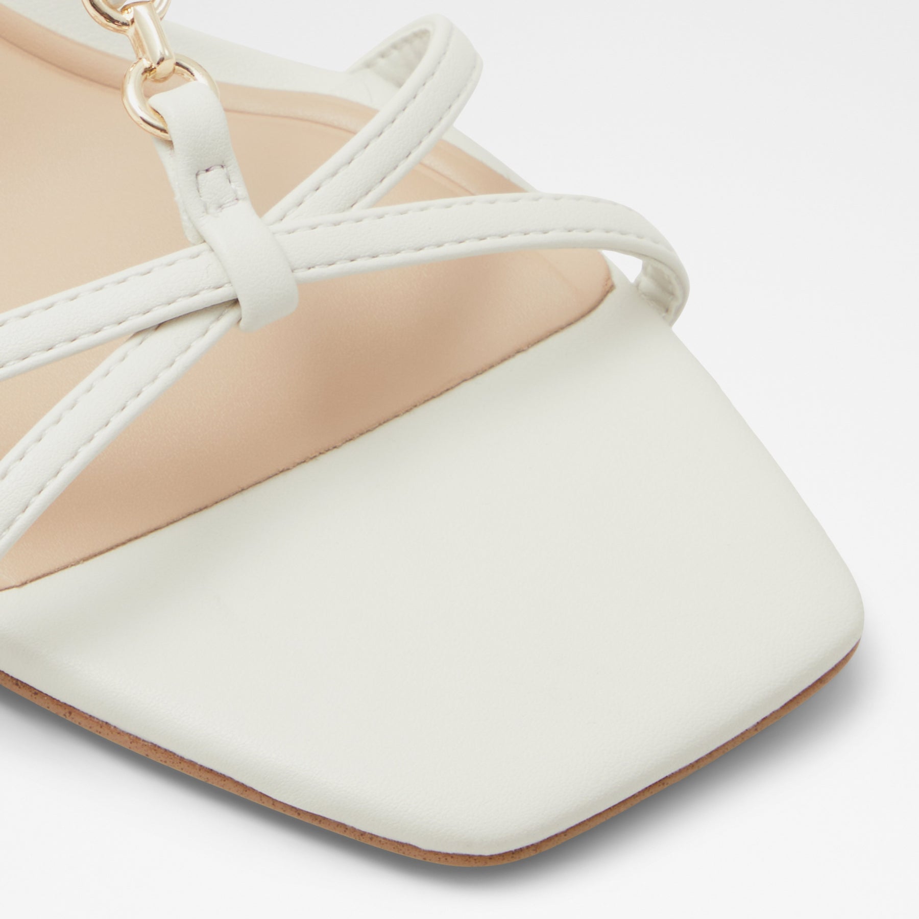 Sandálias JOSEFINA para mulher, em branco, de salto fino, com biqueira quadrada e um aplique metálico. Com fecho de fivela no tornozelo.
