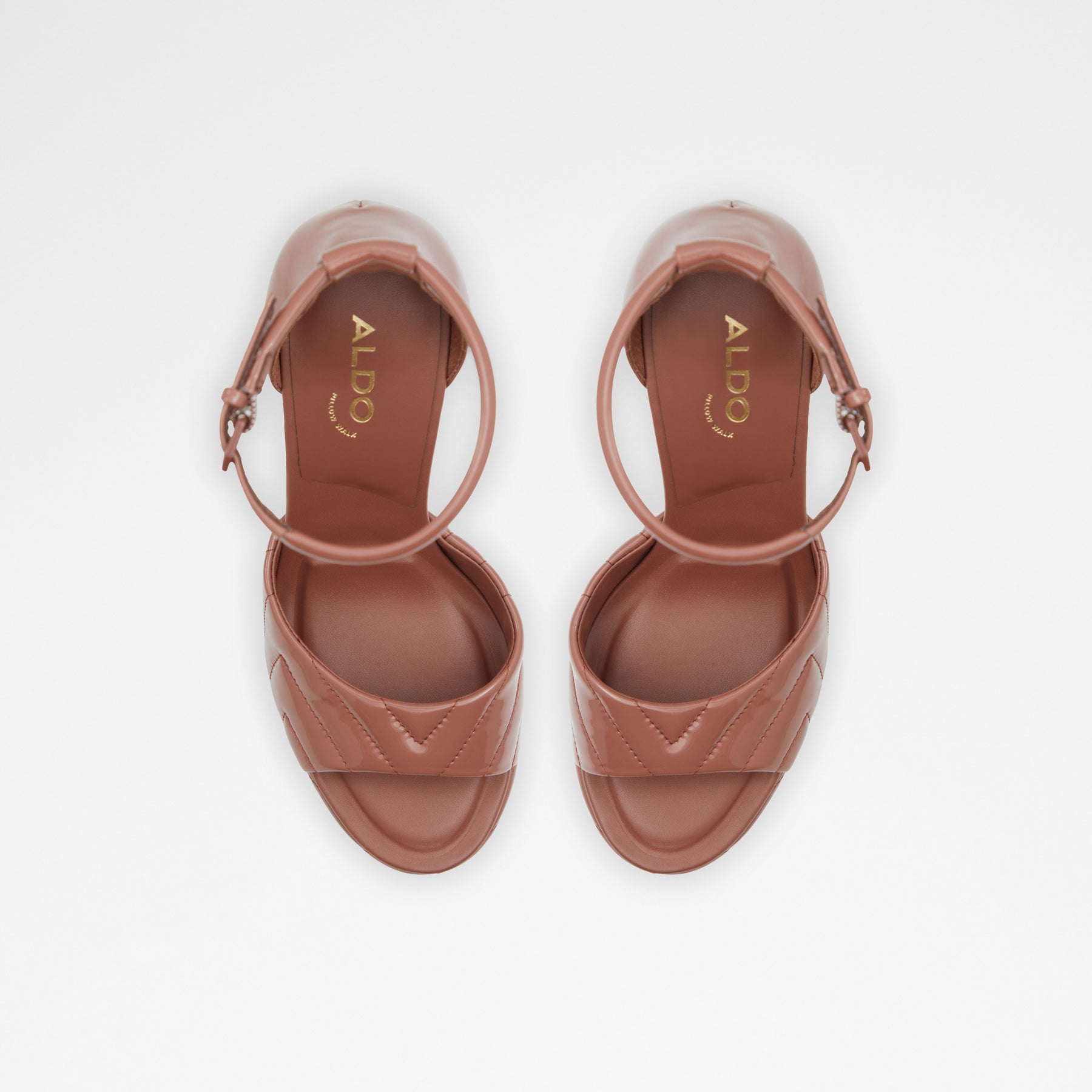 Sandálias MILENA para mulher, em verniz castanho, de salto em bloco com plataforma, com biqueira redonda e uma textura acolchoada. Com fecho de fivela no tornozelo.