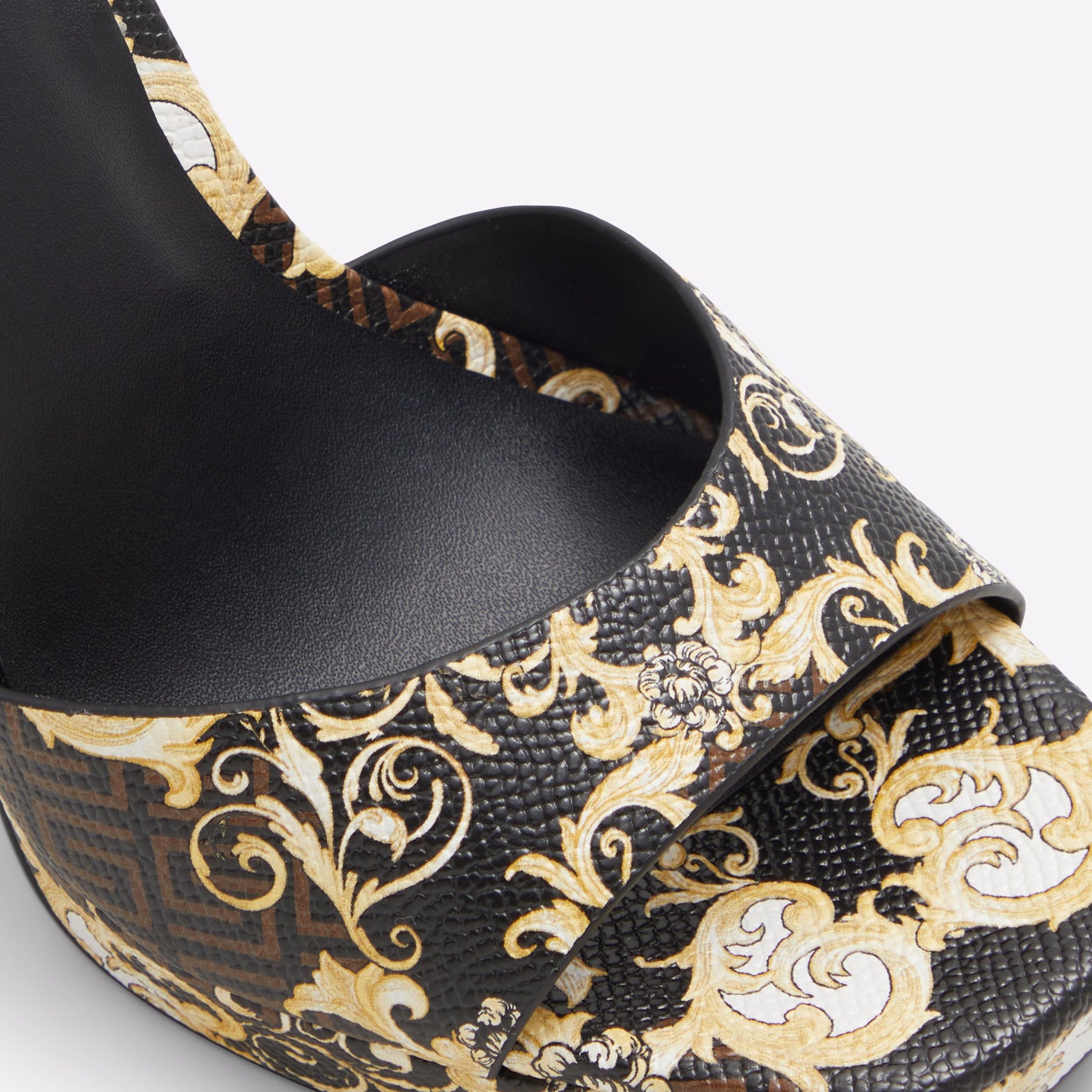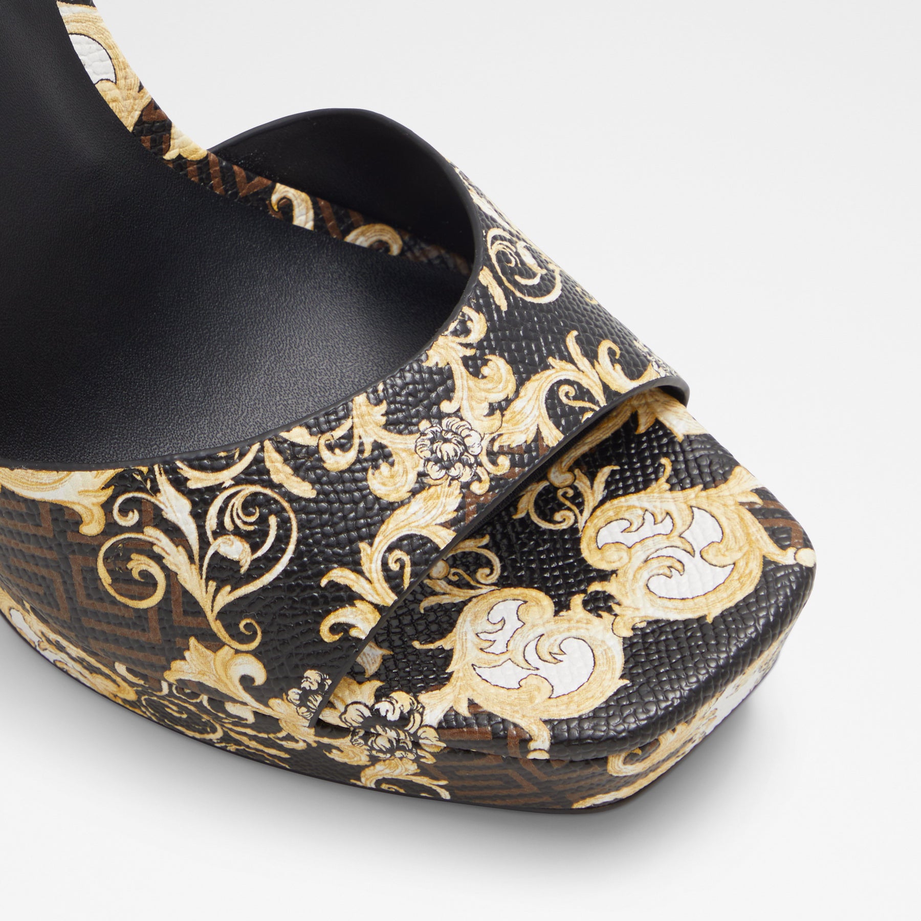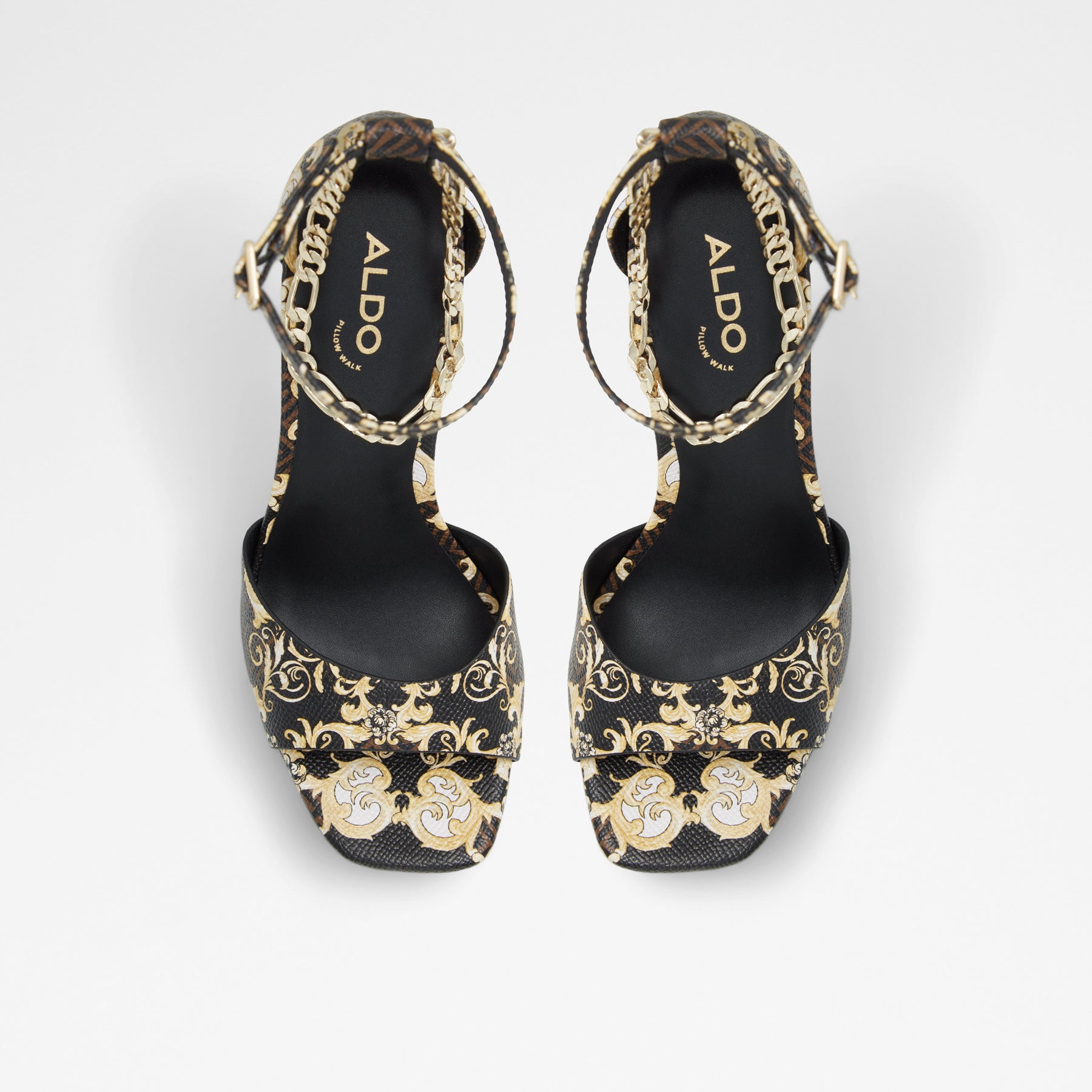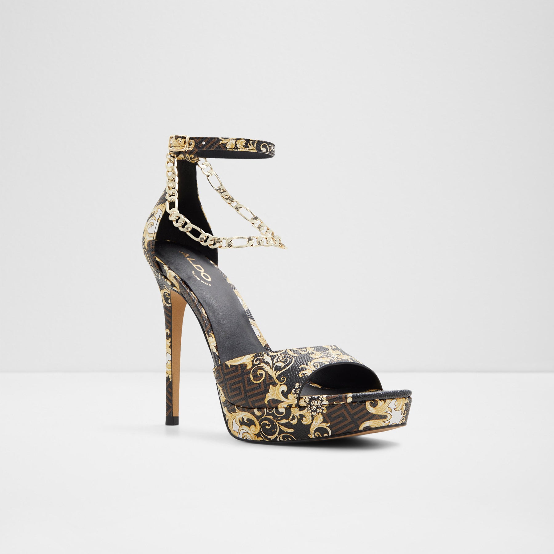 Sandálias PRISILLA para mulher, em castanho, de salto fino com plataforma, com biqueira quadrada e um estampado colorido. Com corrente decorativa. Com fecho de fivela no tornozelo.