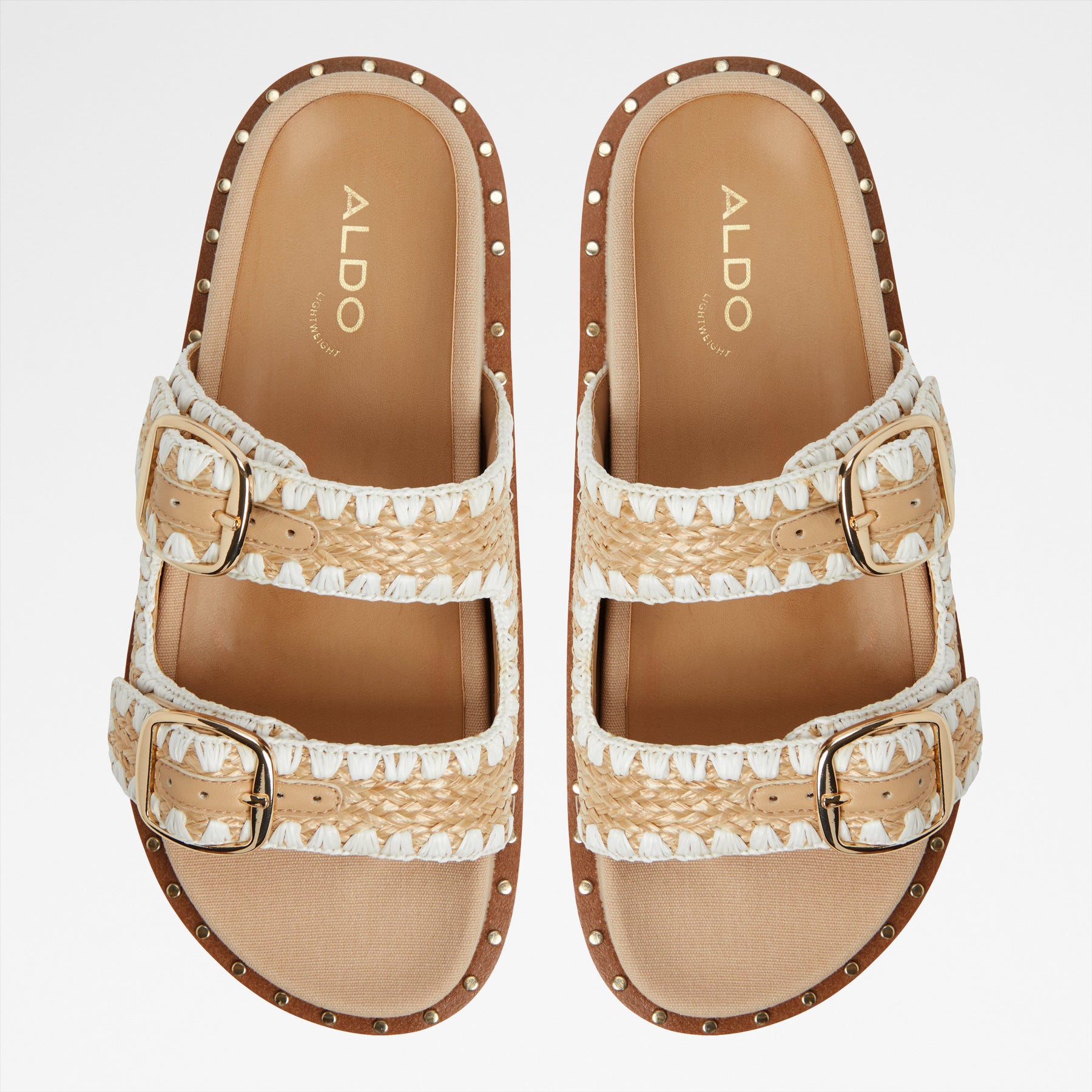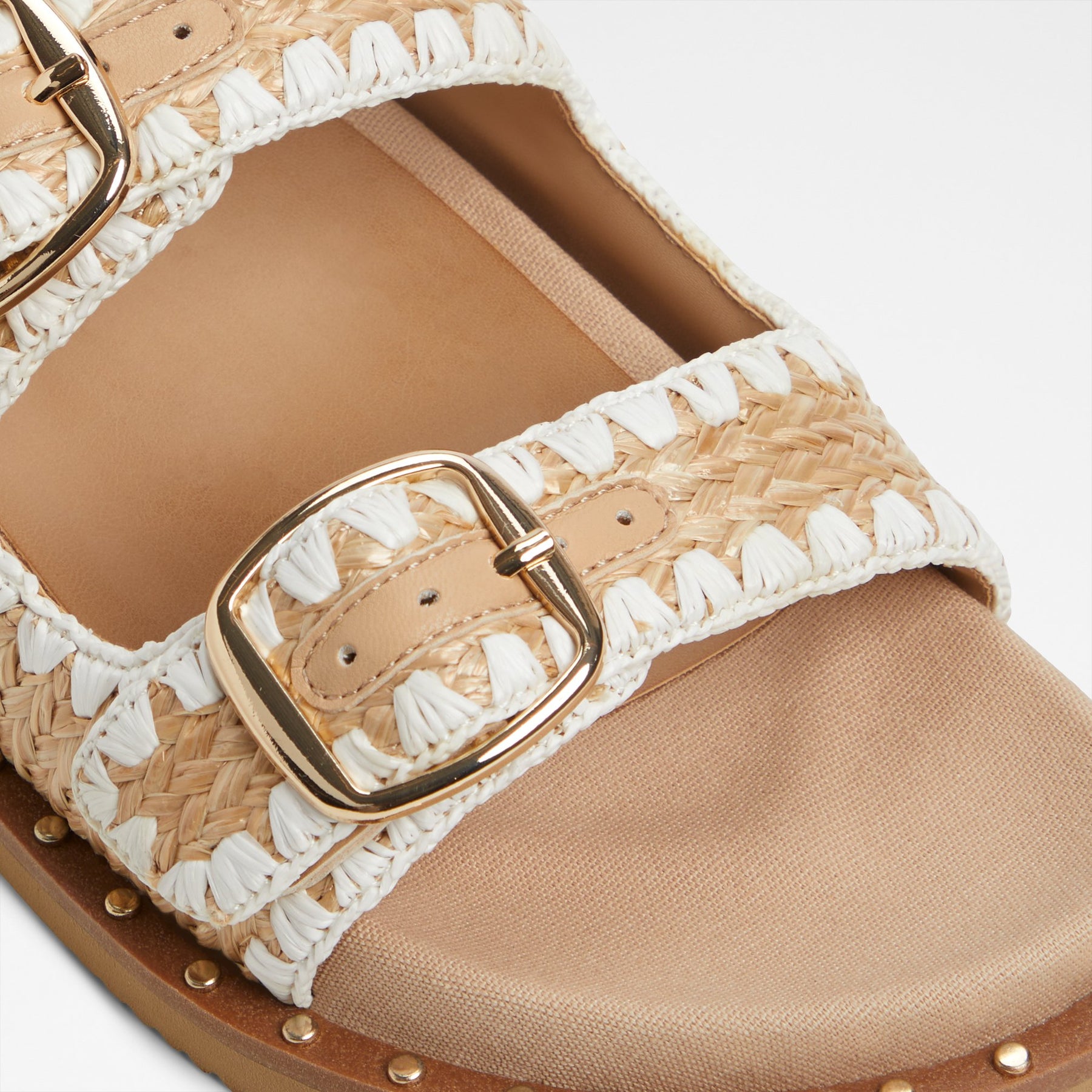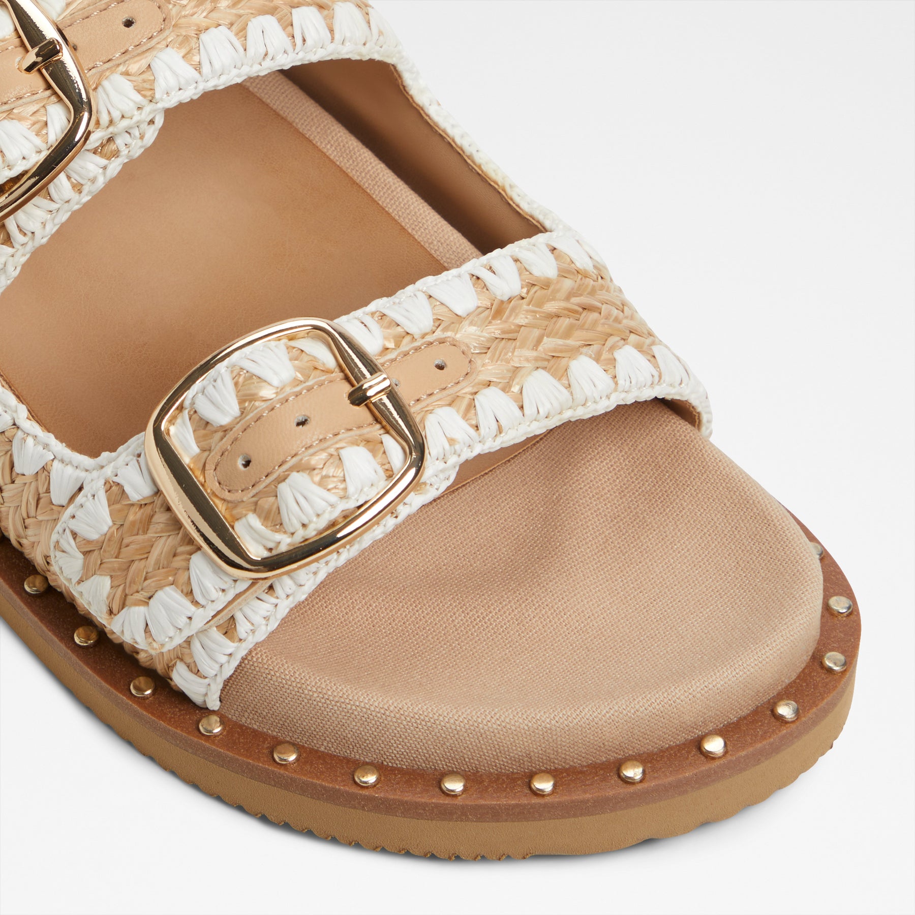 Sandálias rasas KRAVIS para mulher, em bege, com biqueira amendoada e material tipo ráfia. Com fivelas decorativas.