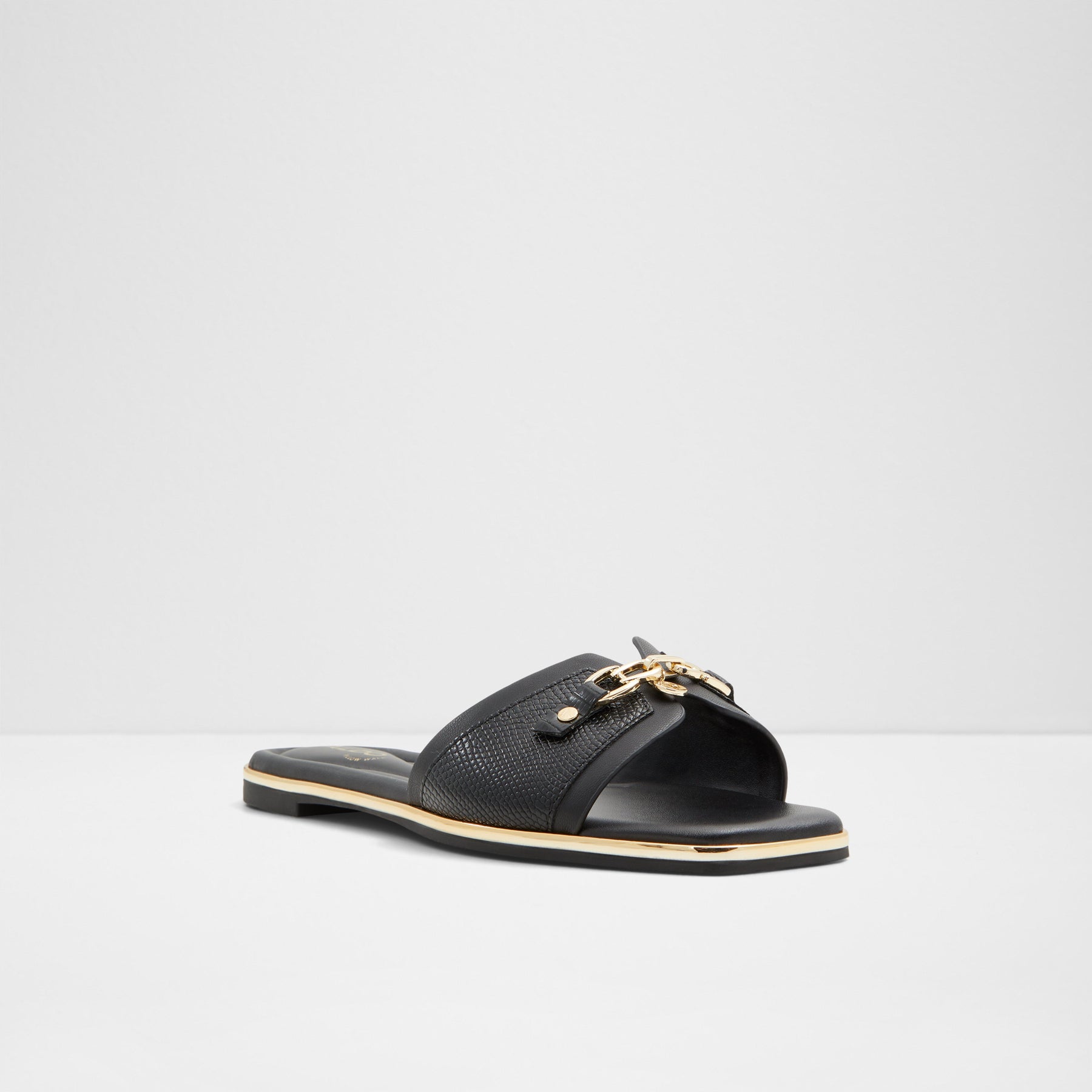 Sandálias rasas ALAMASSI para mulher, em preto, com biqueira quadrada e um aplique metálico. Detalhes decorativos em dourado e padrão de pele animal.