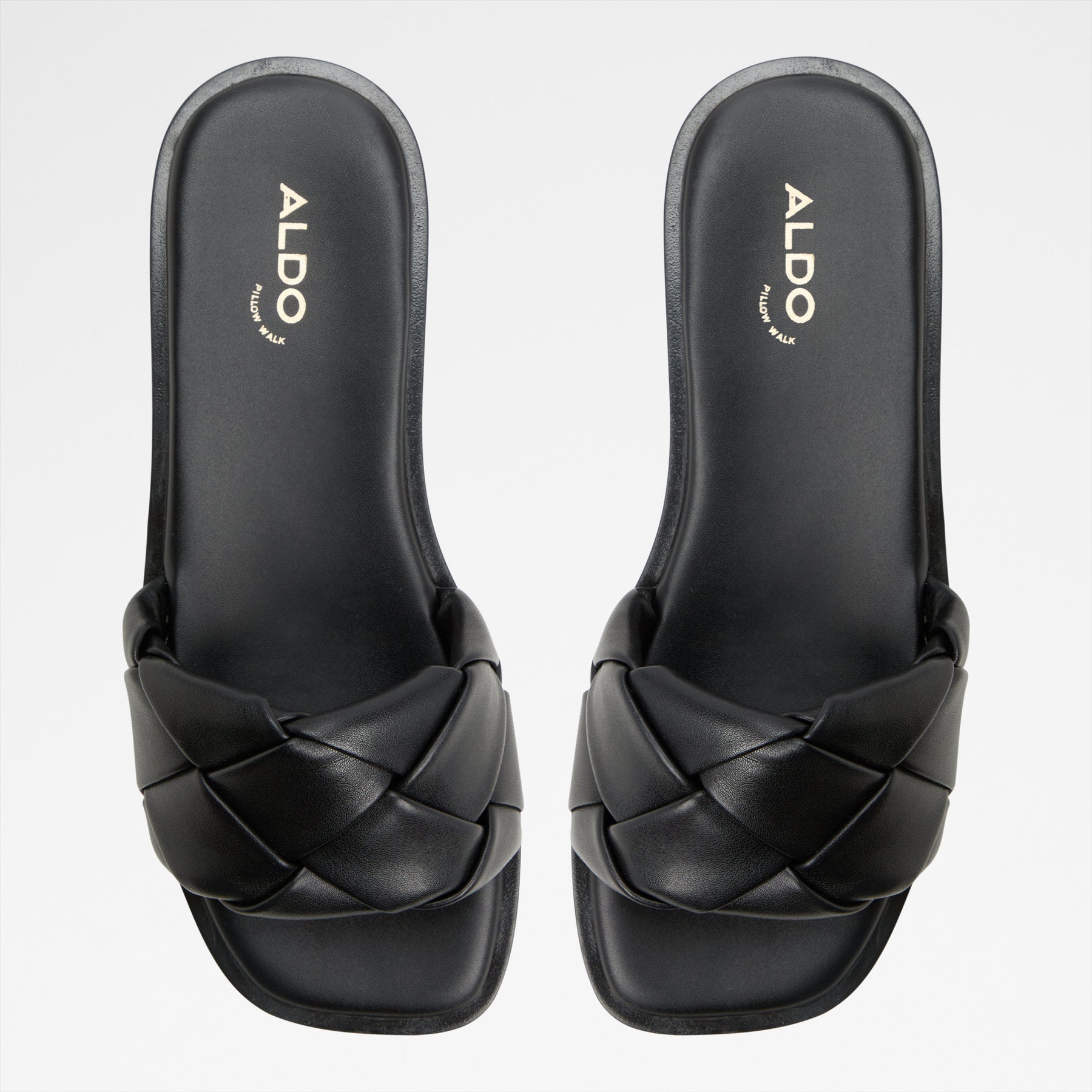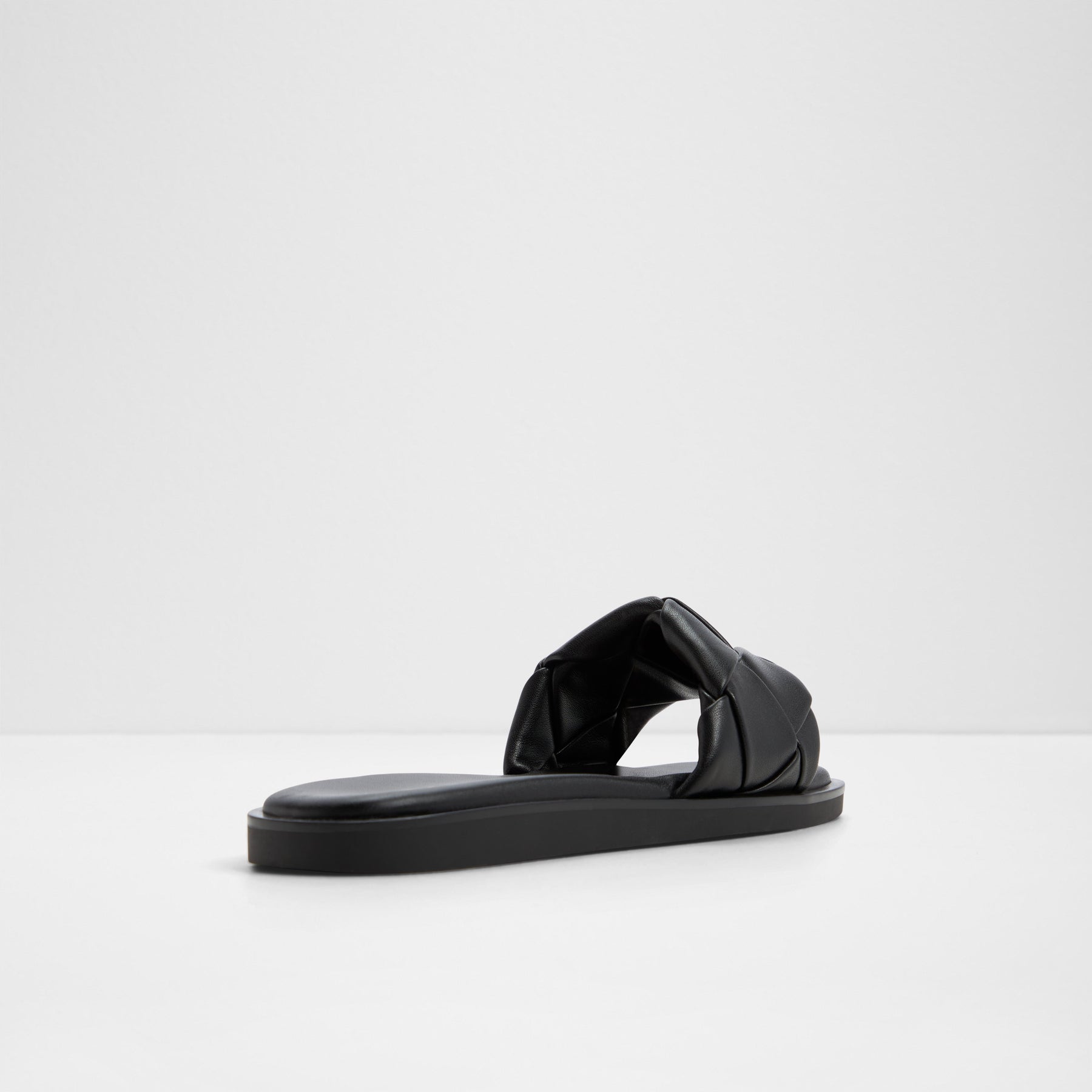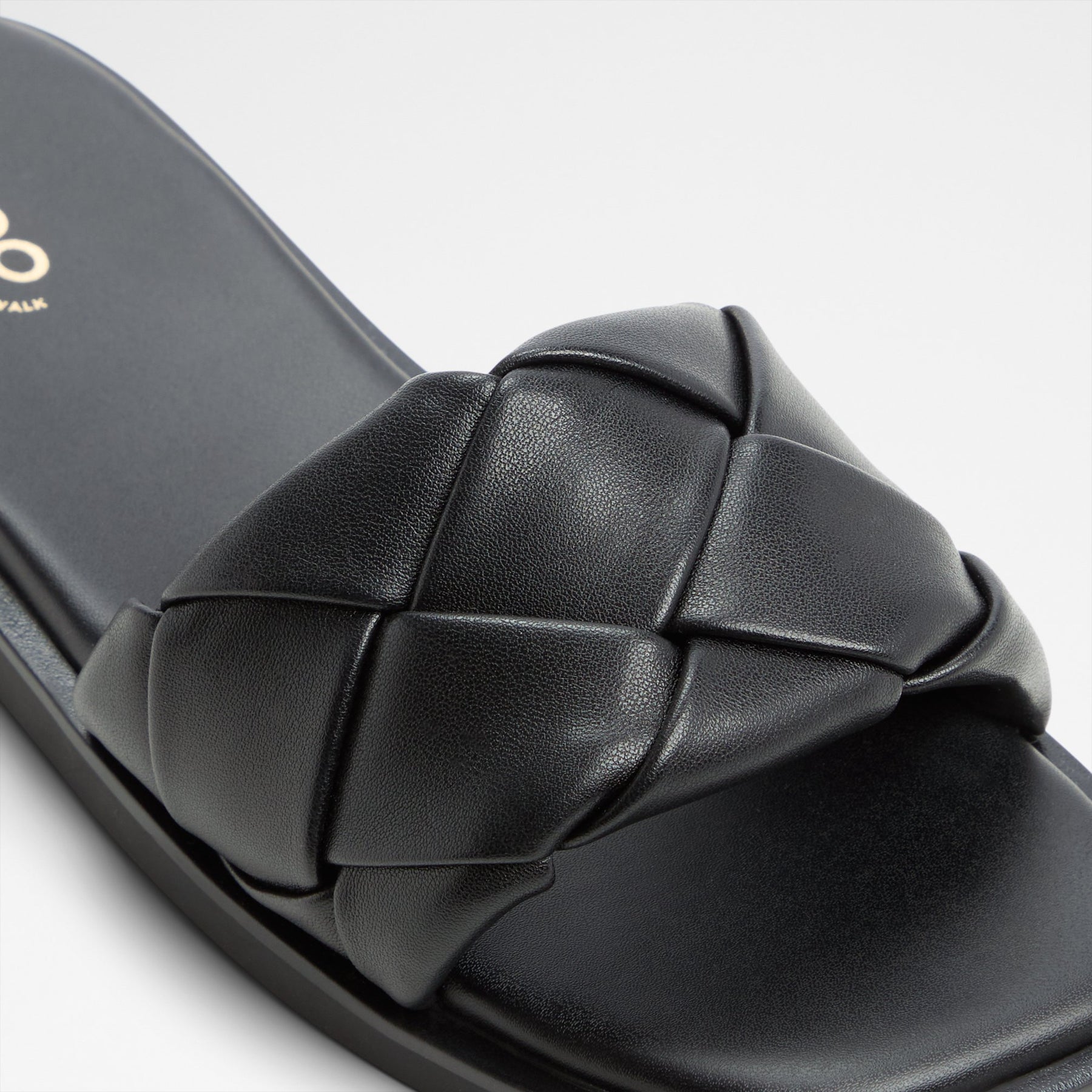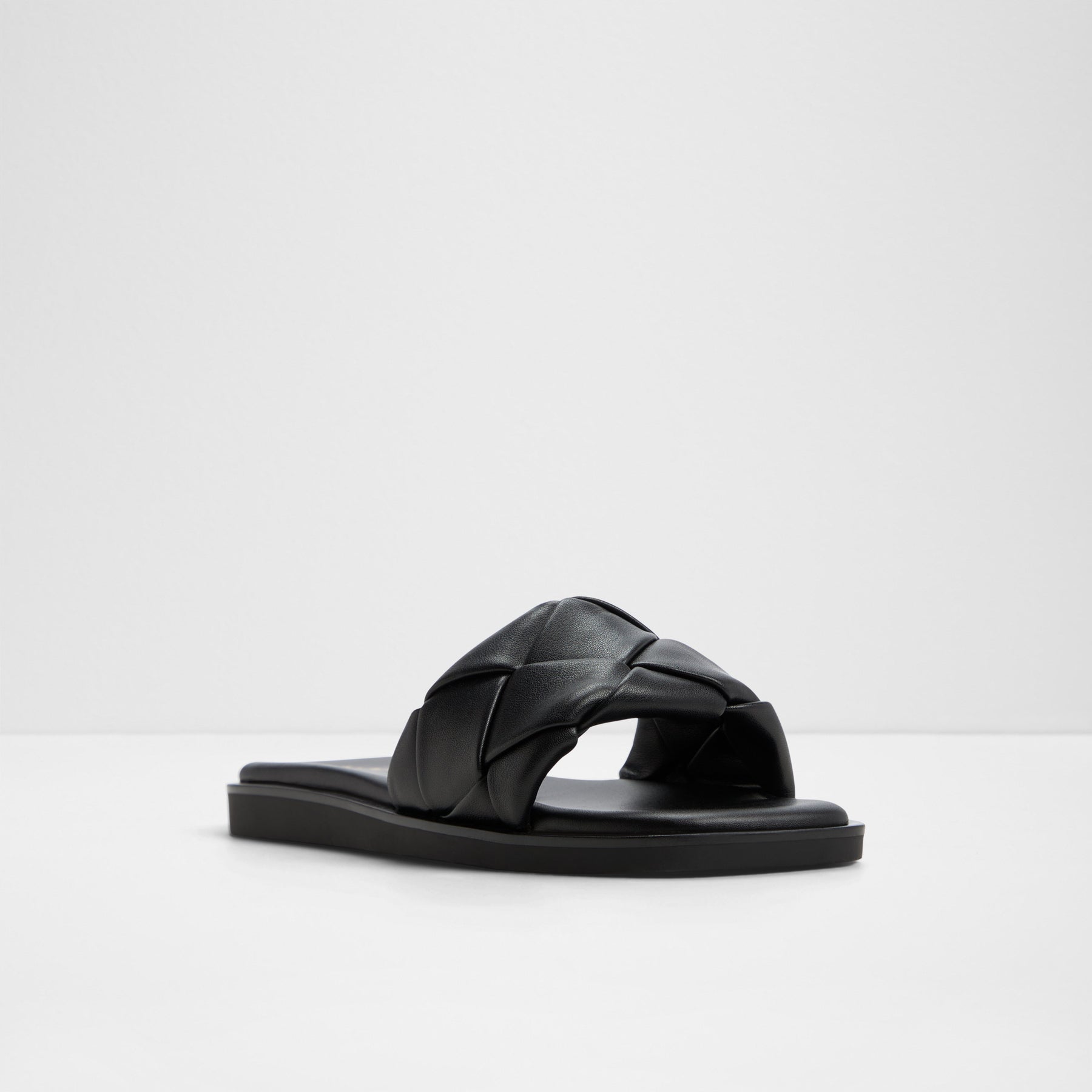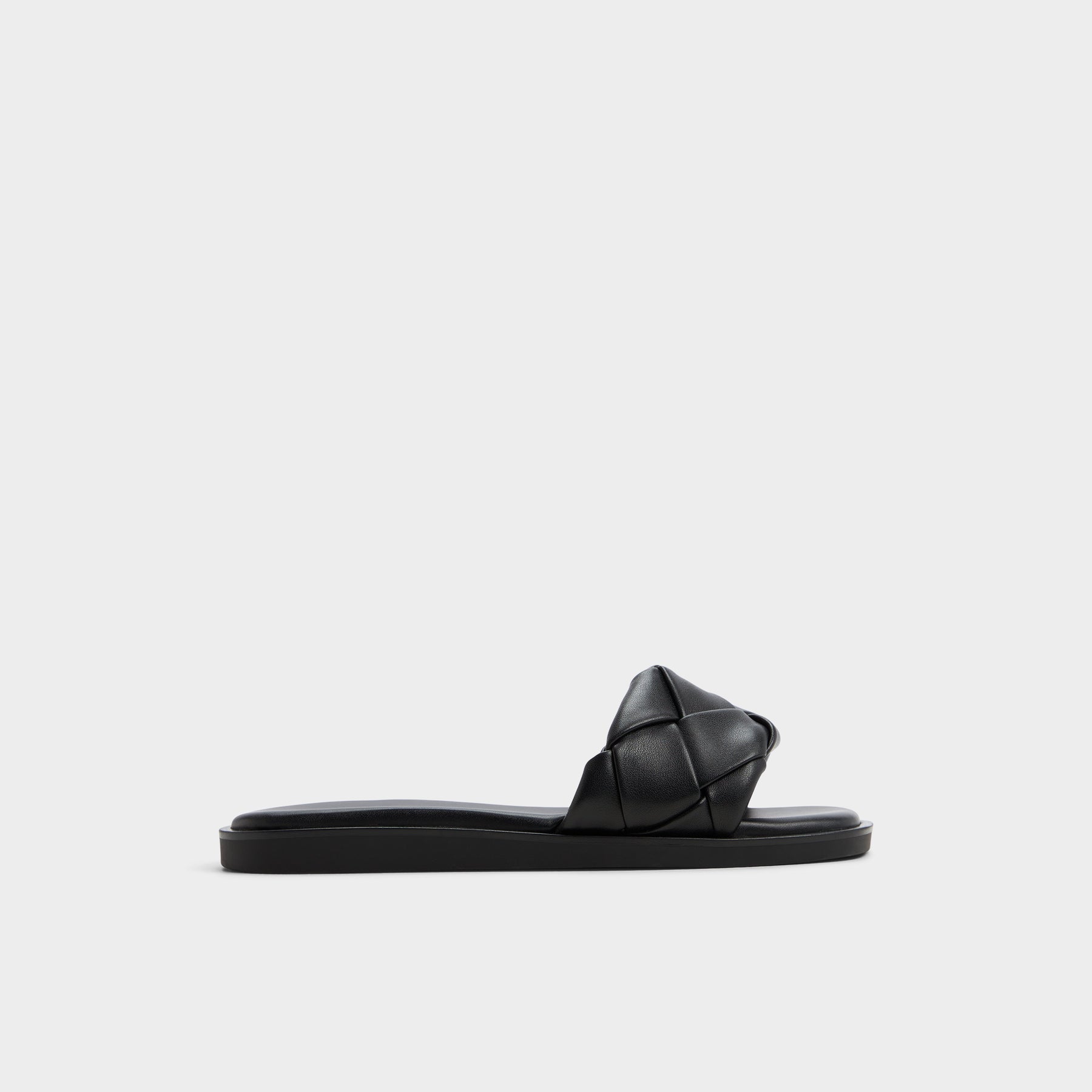 Sandálias rasas ESTERELLE para mulher, em preto, com biqueira quadrada e uma textura entrançada.