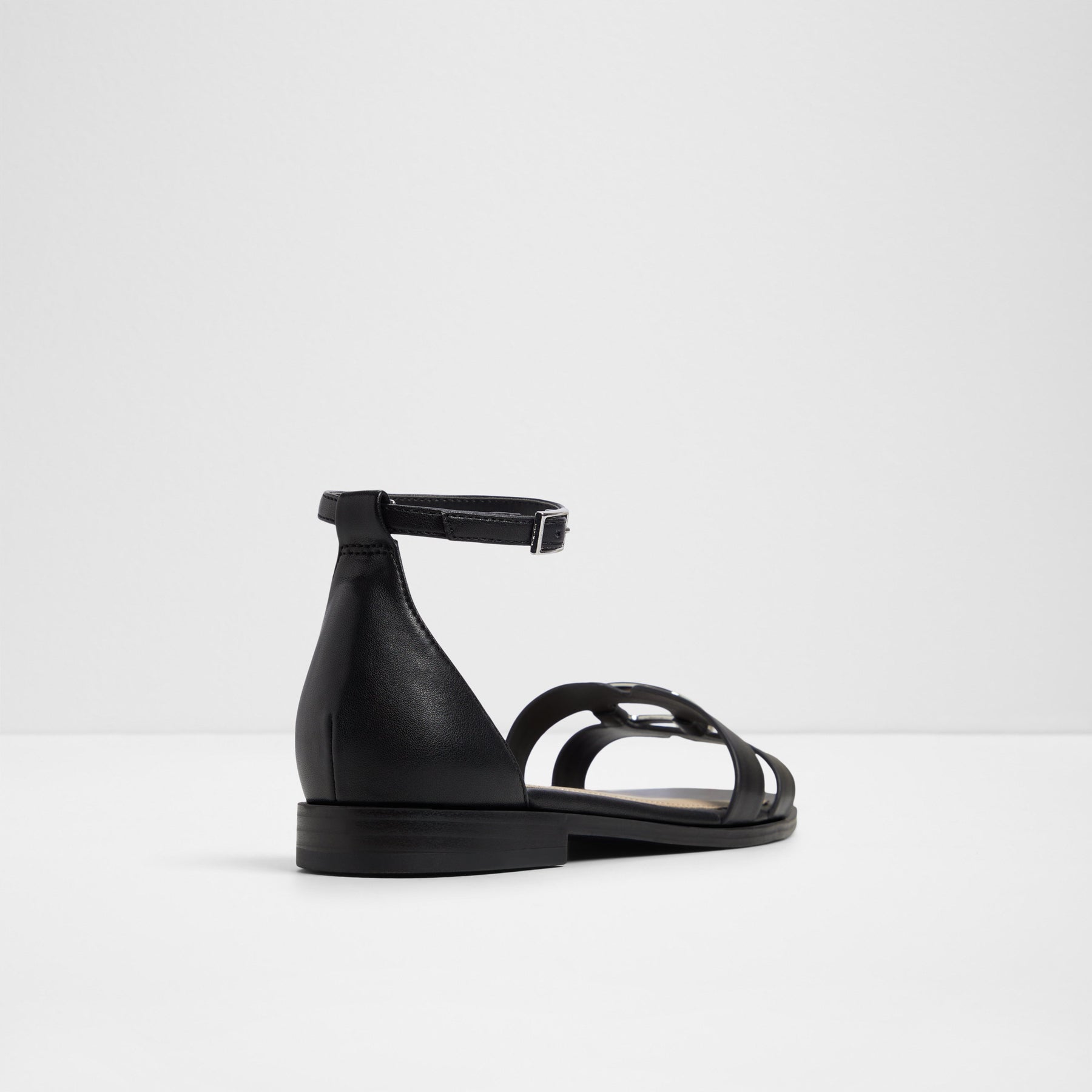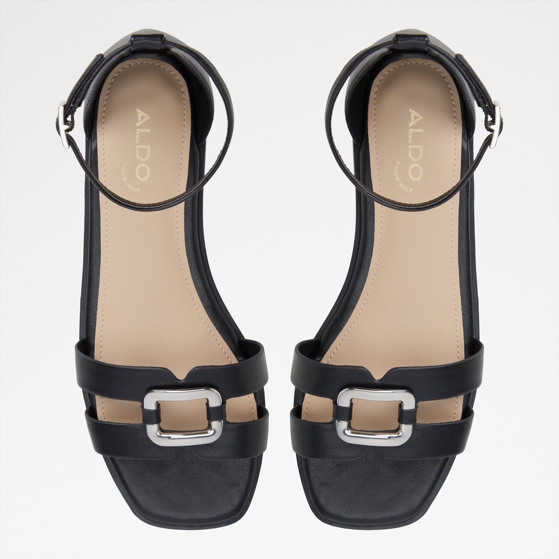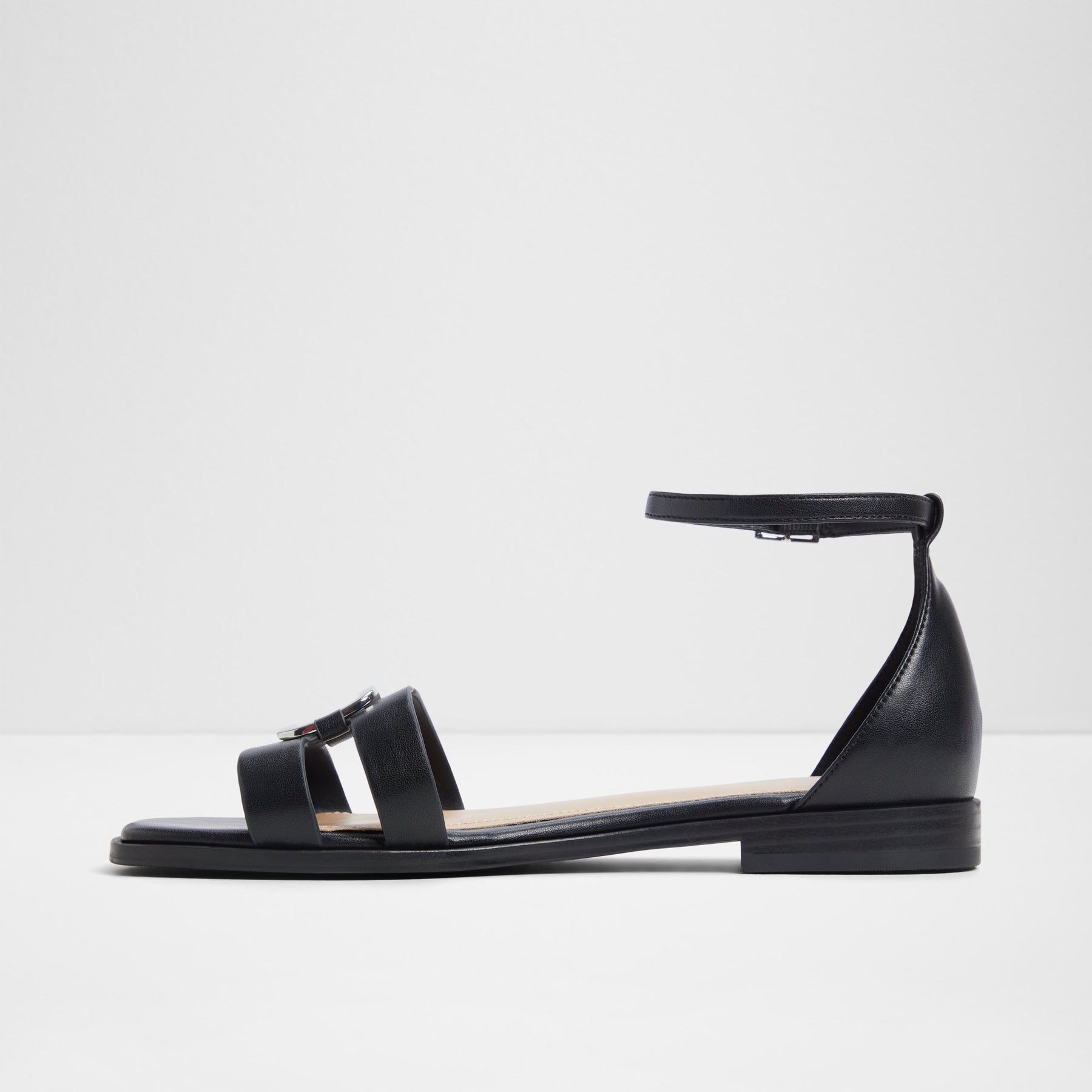 Sandálias rasas VOK para mulher, em preto, com biqueira quadrada e um aplique metálico. Com fecho de fivela no tornozelo.