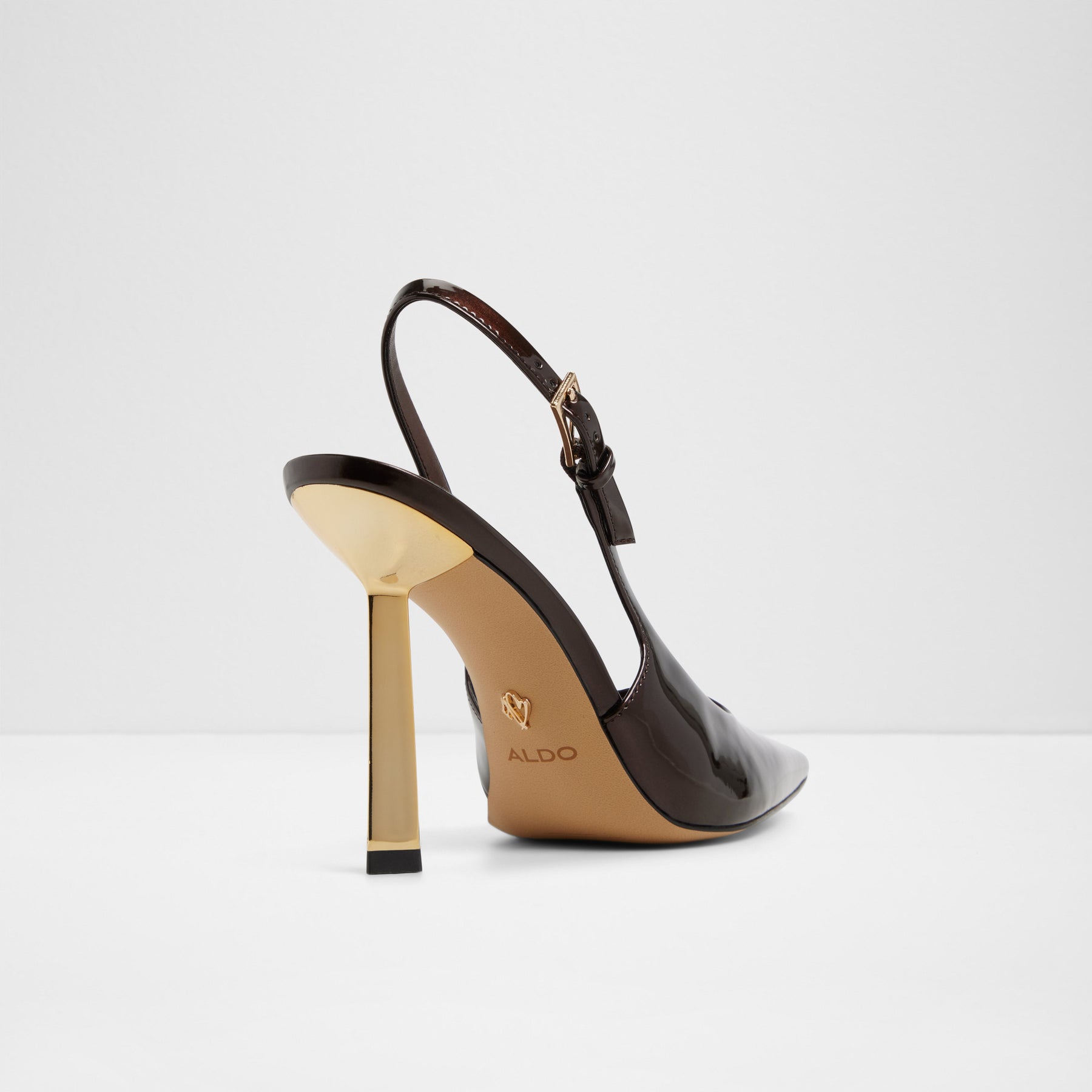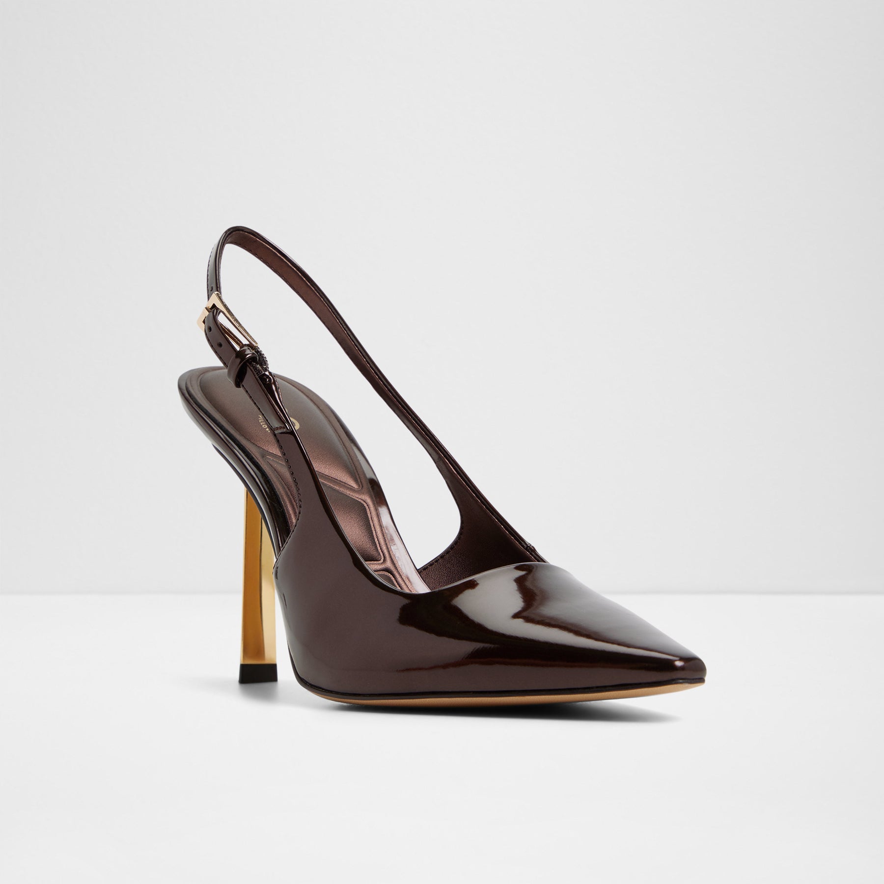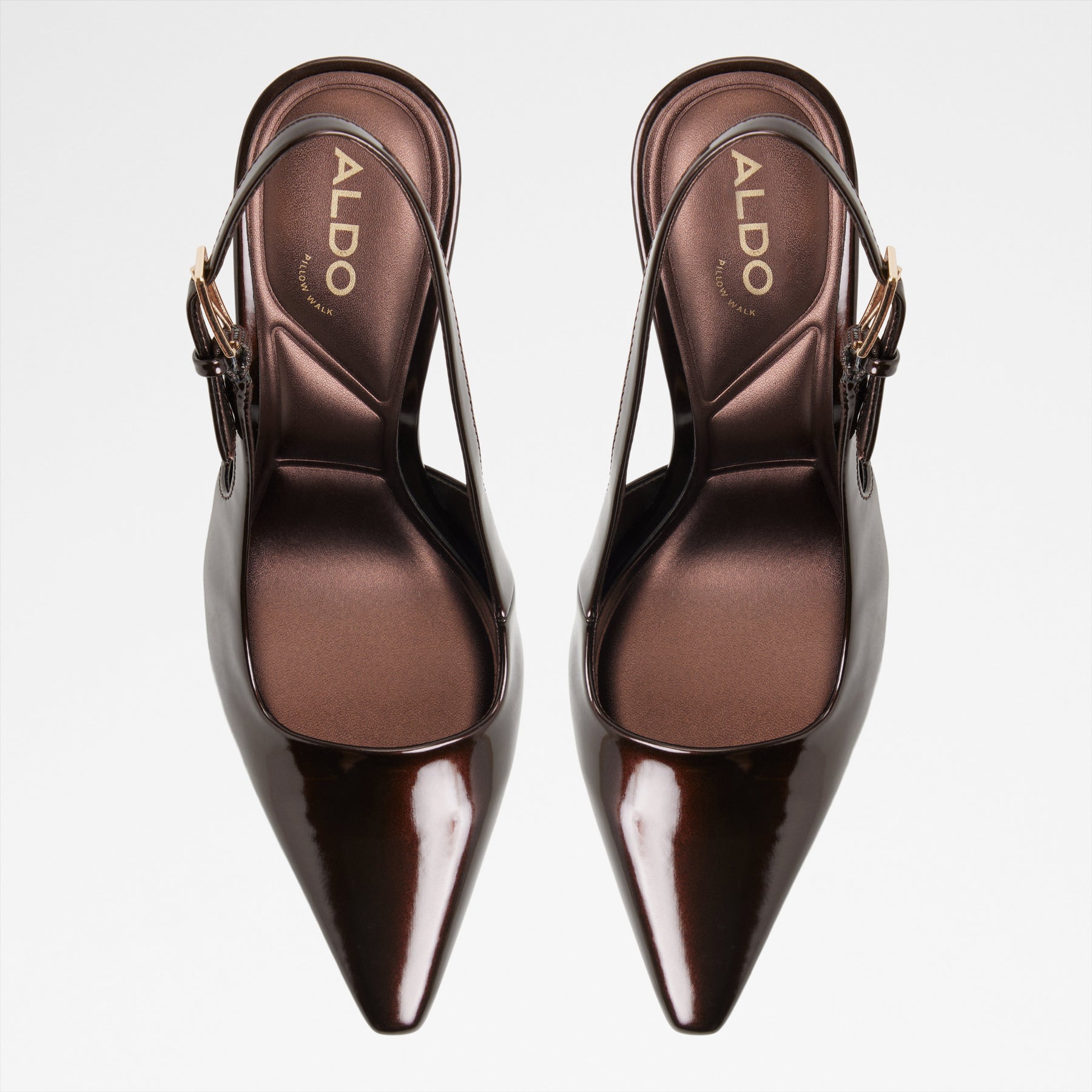 Sapatos MARYSA para mulher, em castanho, de salto fino, com biqueira pontiaguda e um pormenor sofisticado no salto. Com fecho de fivela no tornozelo.