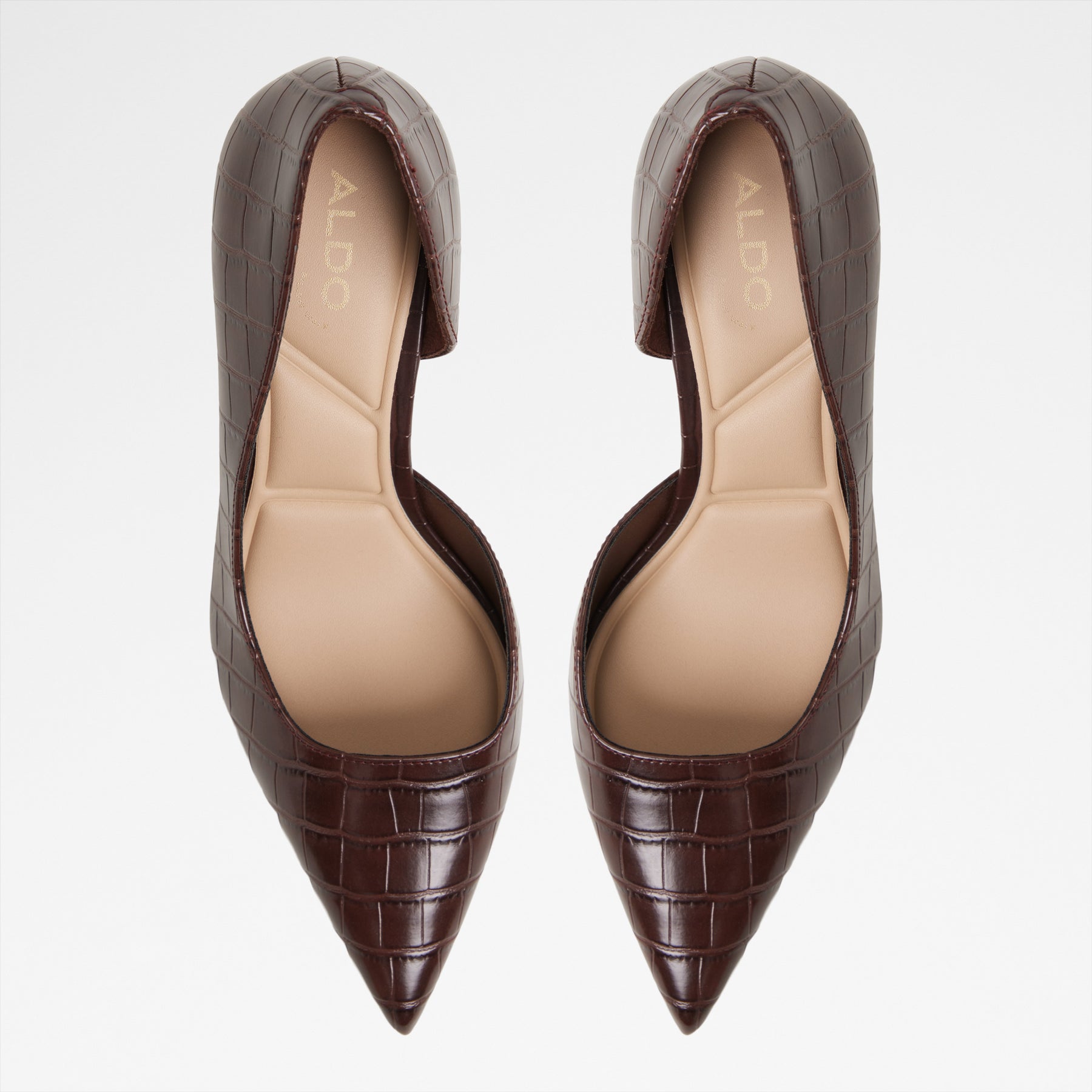 Sapatos LIVIANNA para mulher, em castanho, de salto em funil, com biqueira pontiaguda e uma textura de pele animal.