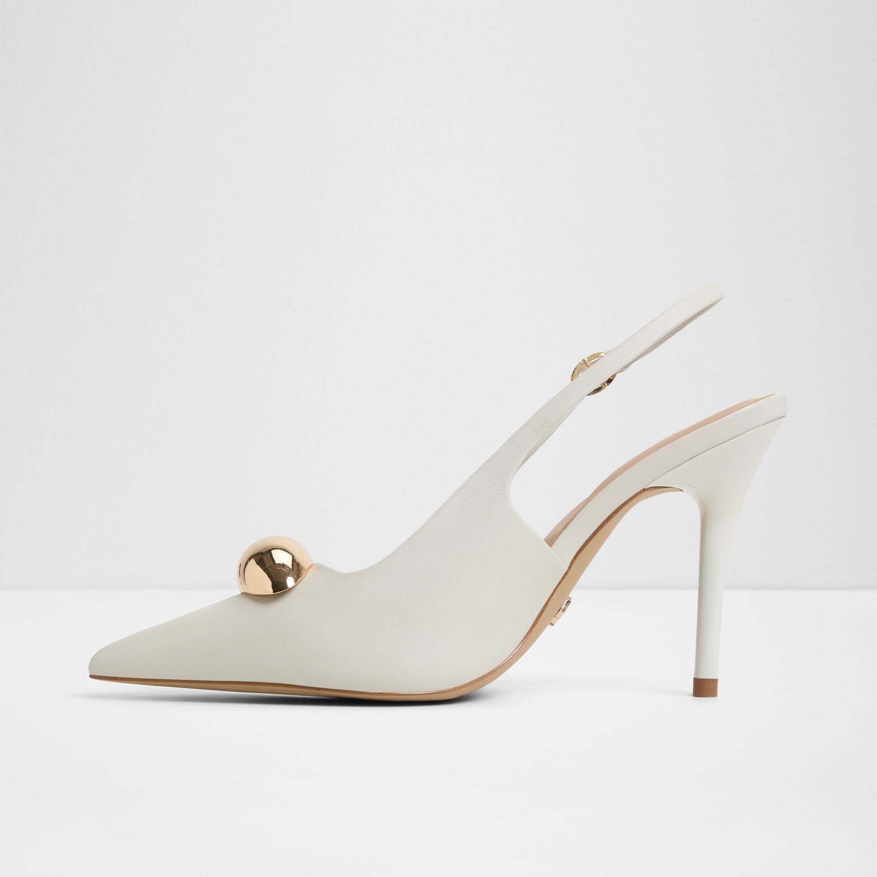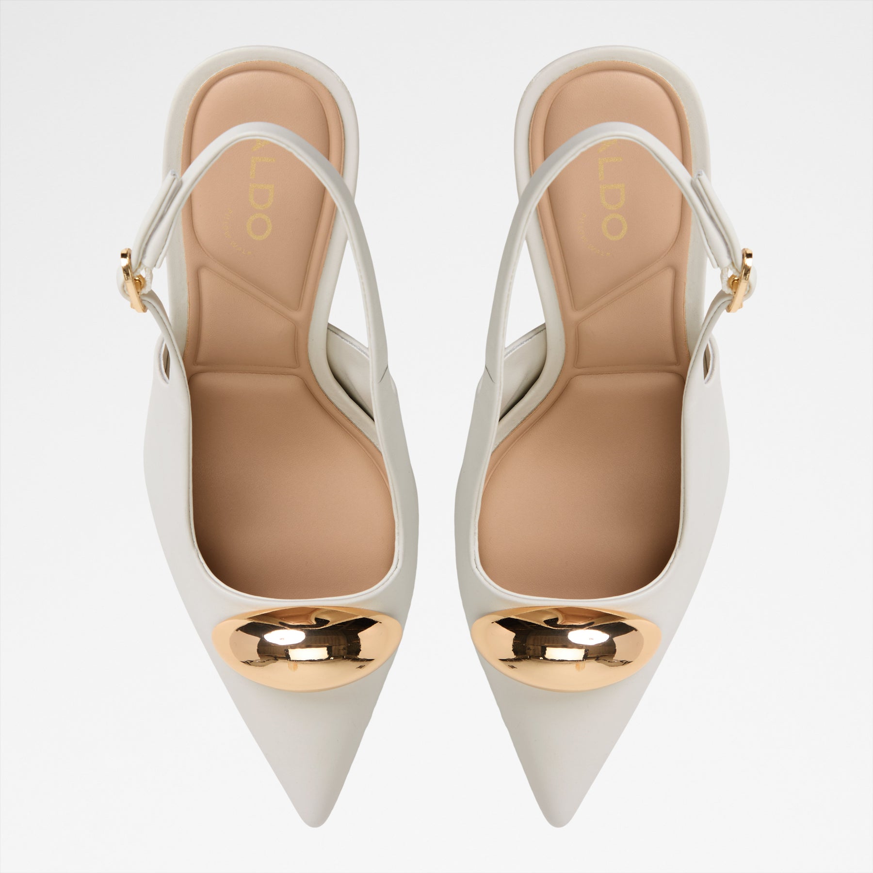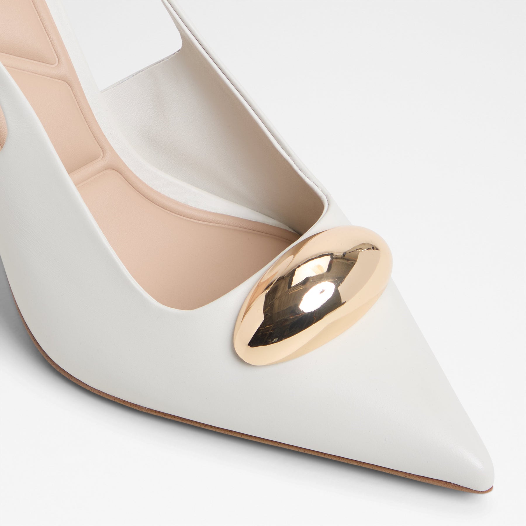 Sapatos CAMBERLEY para mulher, em pele, em branco, de salto fino, com biqueira pontiaguda e um aplique decorativo. Com fecho de fivela no tornozelo.