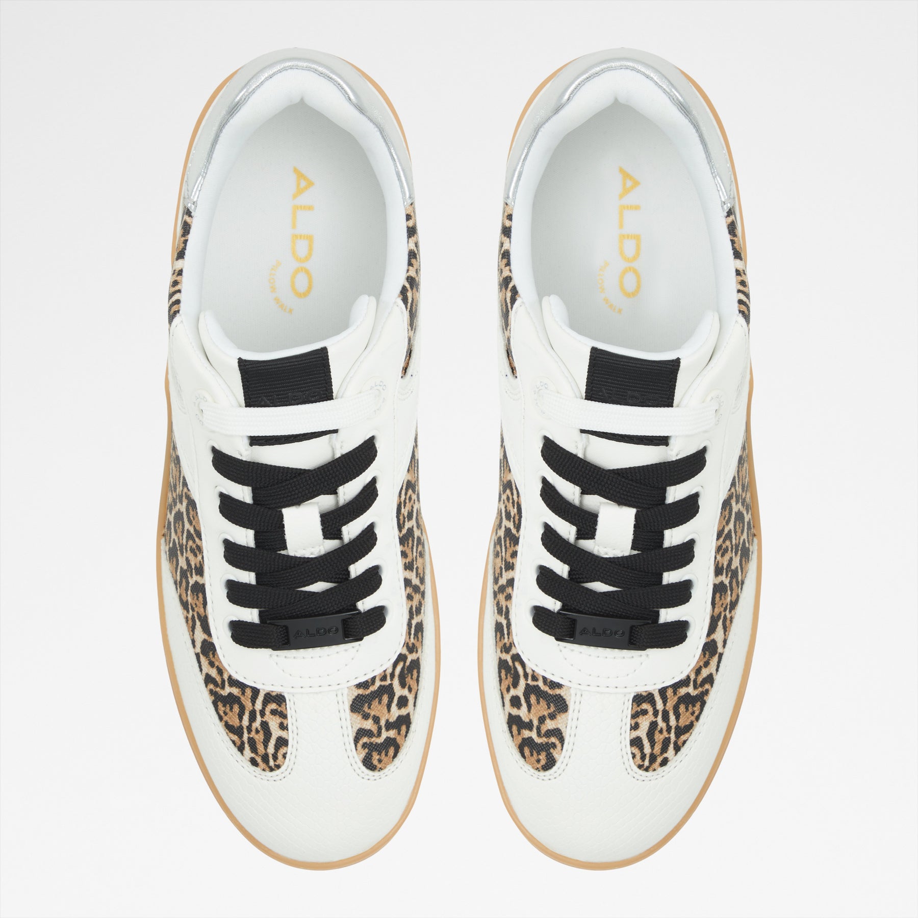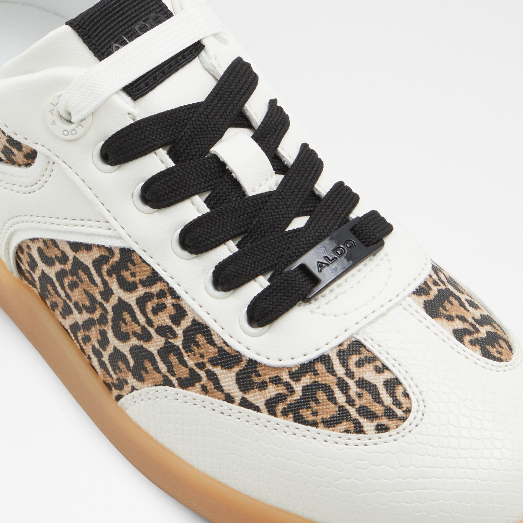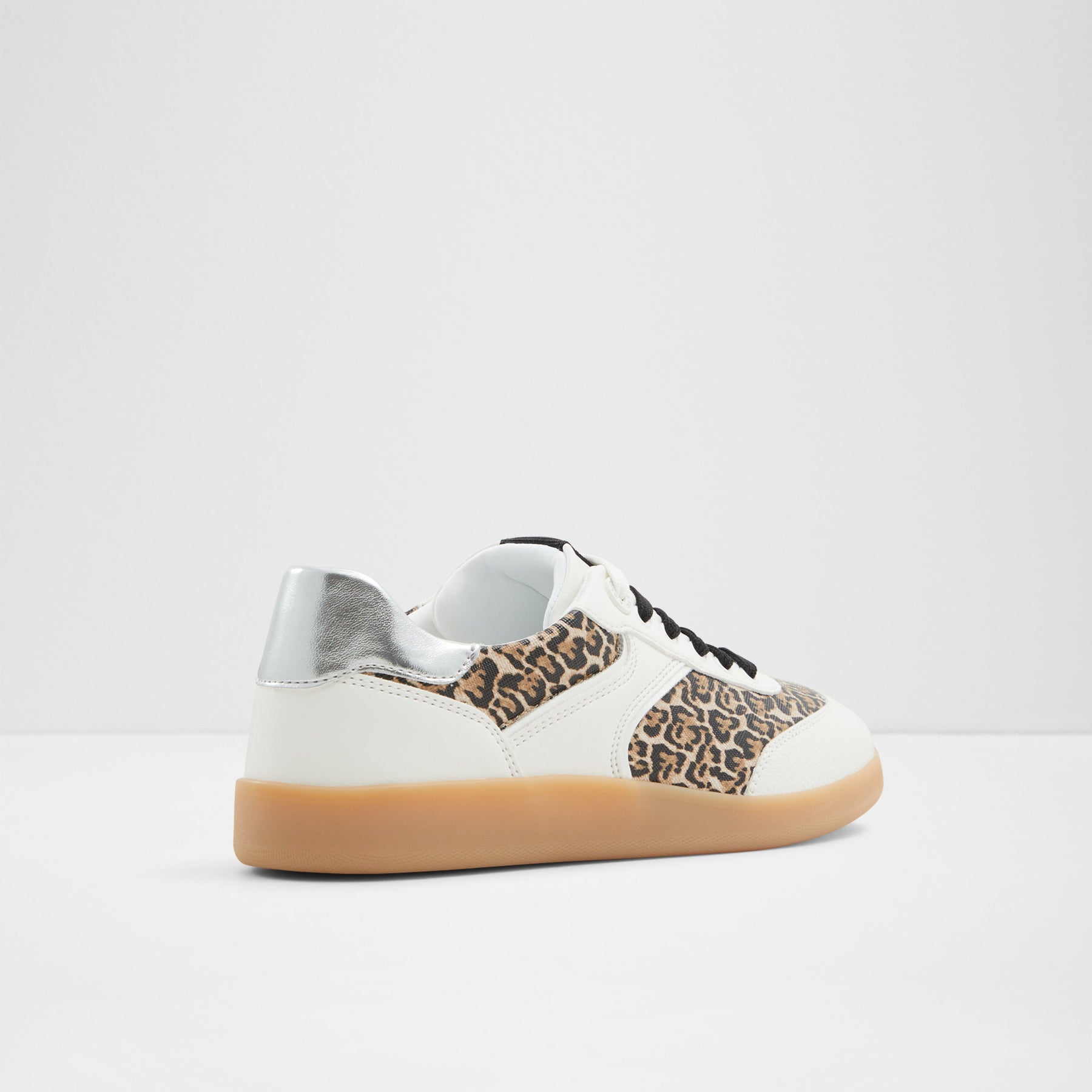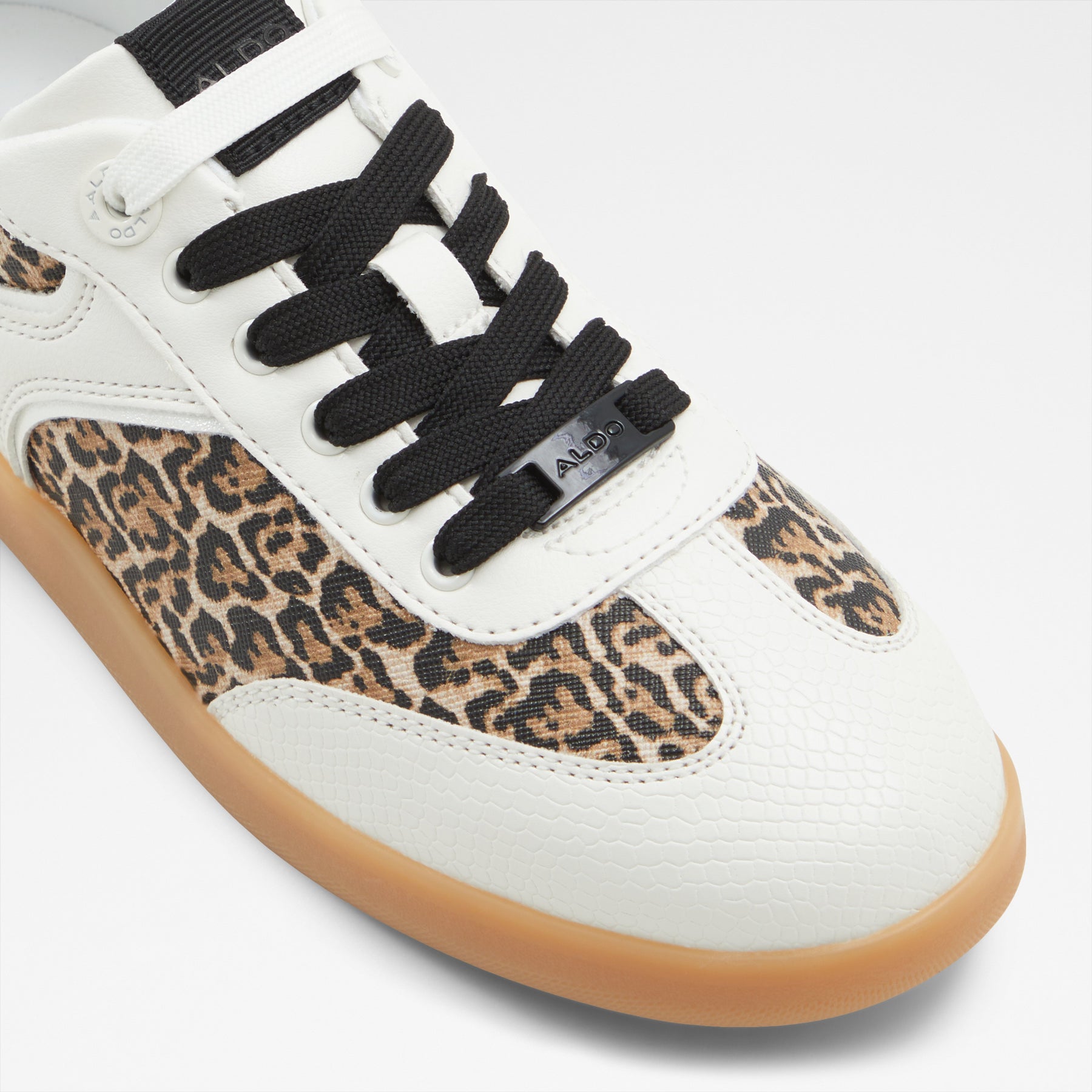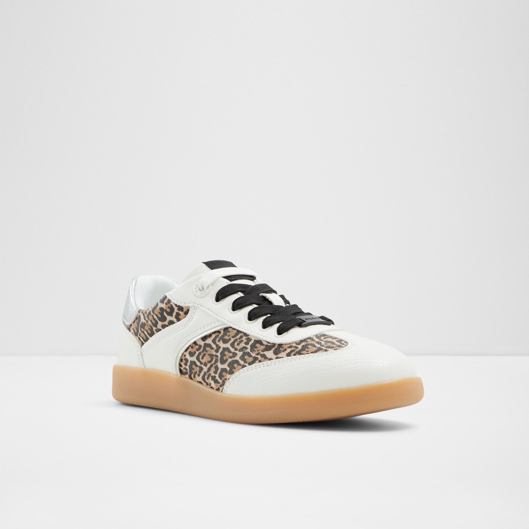 Sapatilhas rasas ERILG para mulher, em branco, com biqueira redonda e um padrão de pele animal. Com fecho de cordões e sola em contraste de cor.