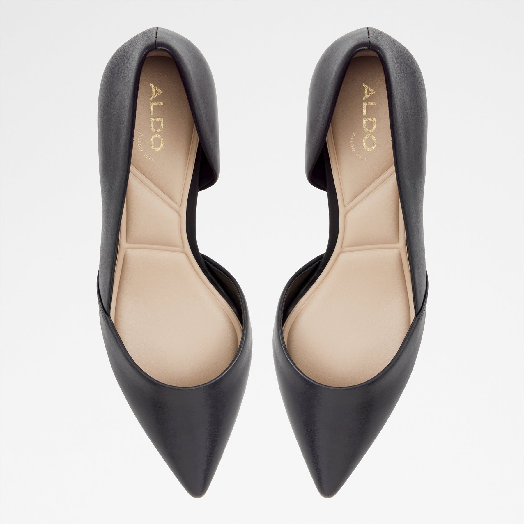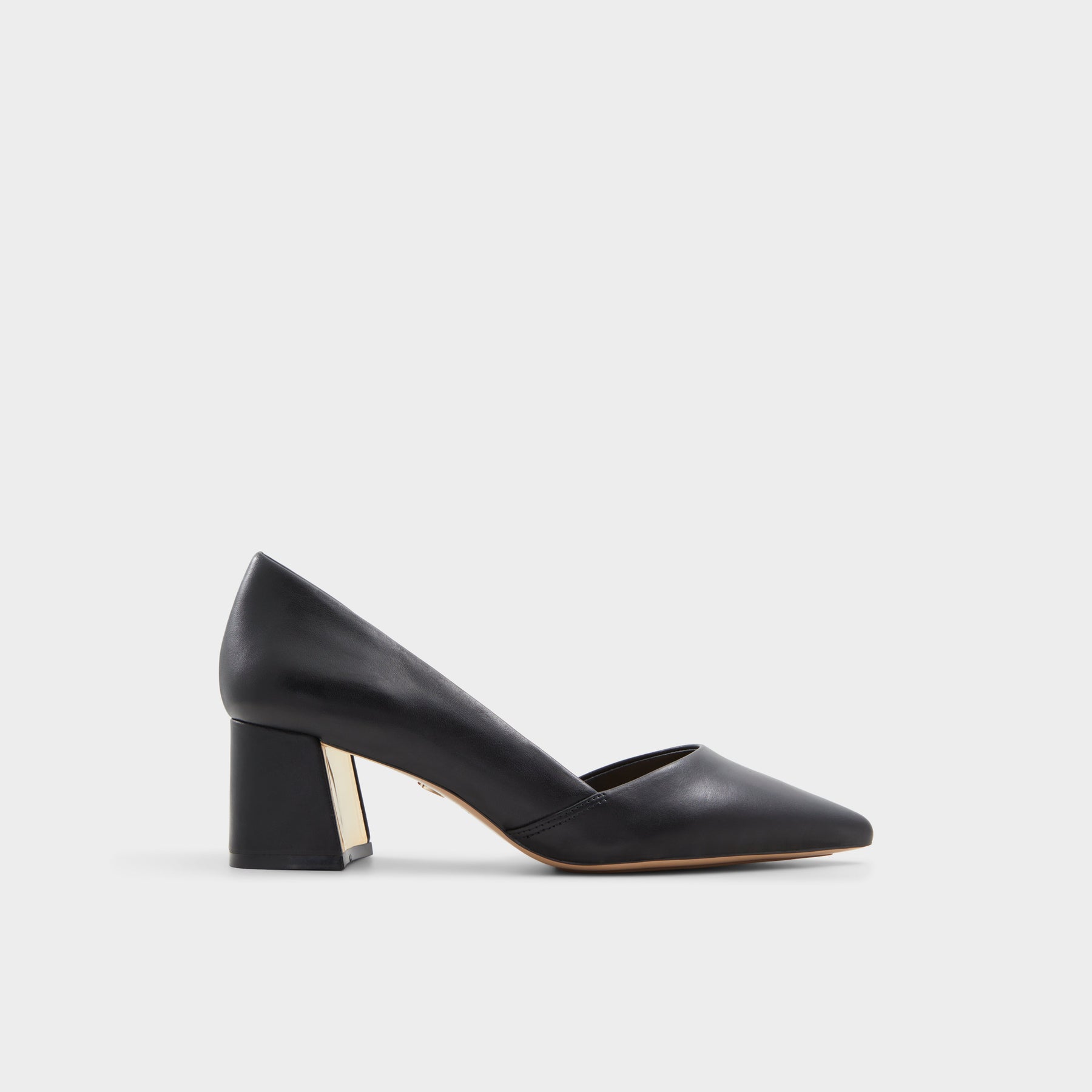 Sapatos OCEIWIA para mulher, em pele, em preto, de salto em bloco, com biqueira pontiaguda e um detalhe dourado no salto.