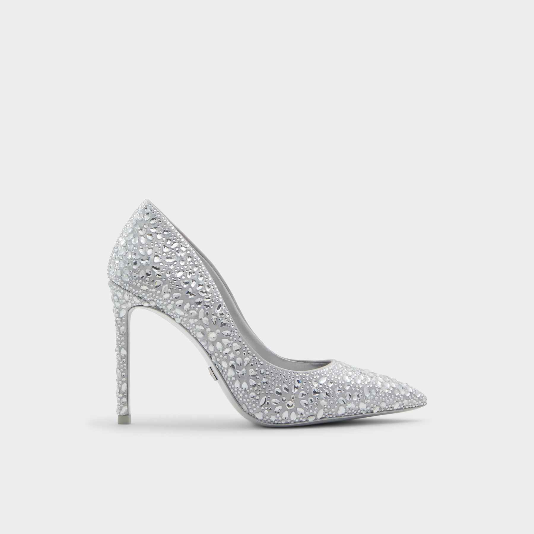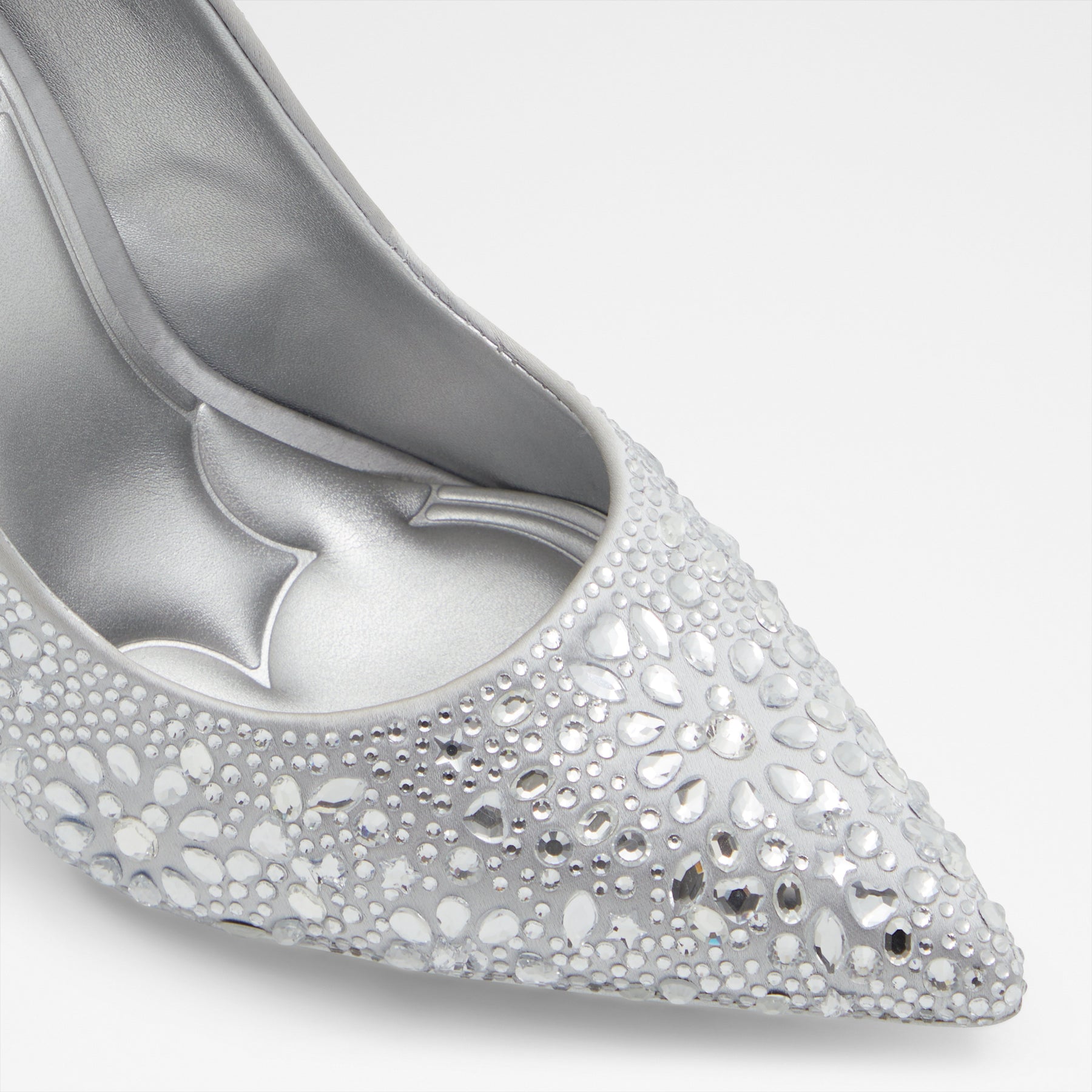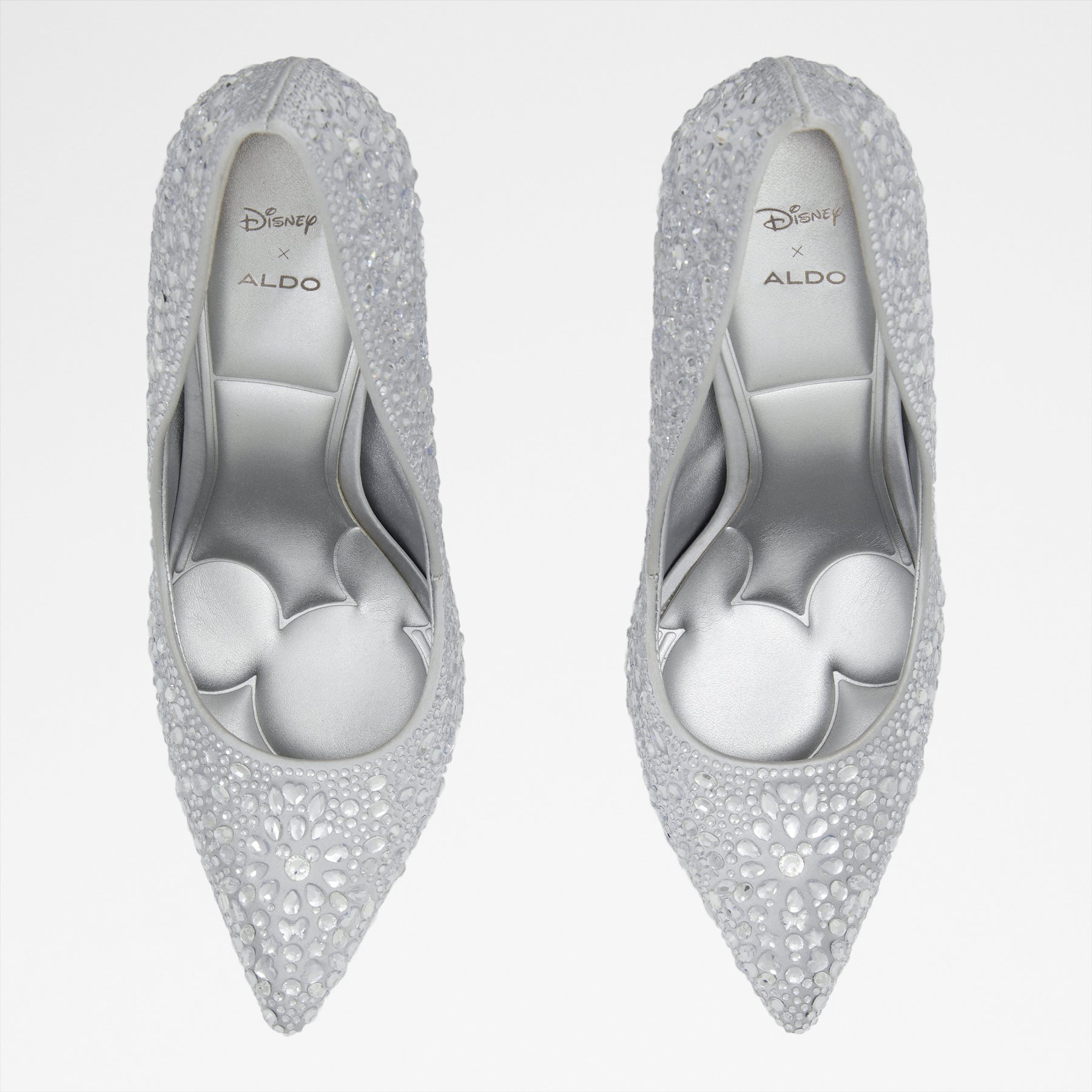 Sapatos D100PLSTESSY para mulher, em prateado, de salto fino, com biqueira pontiaguda e pedras brilhantes. Coleção exclusiva Disney Platinum x ALDO.