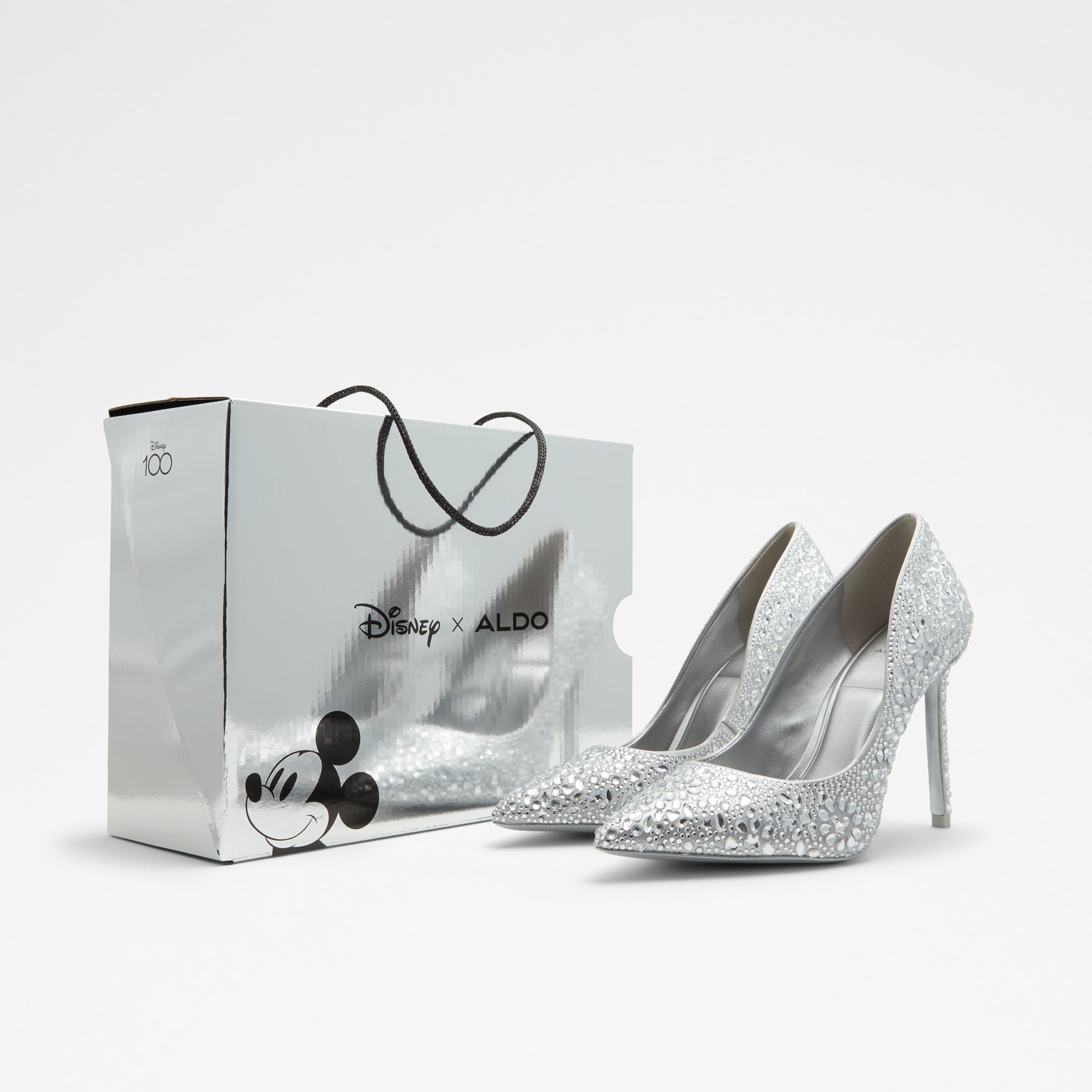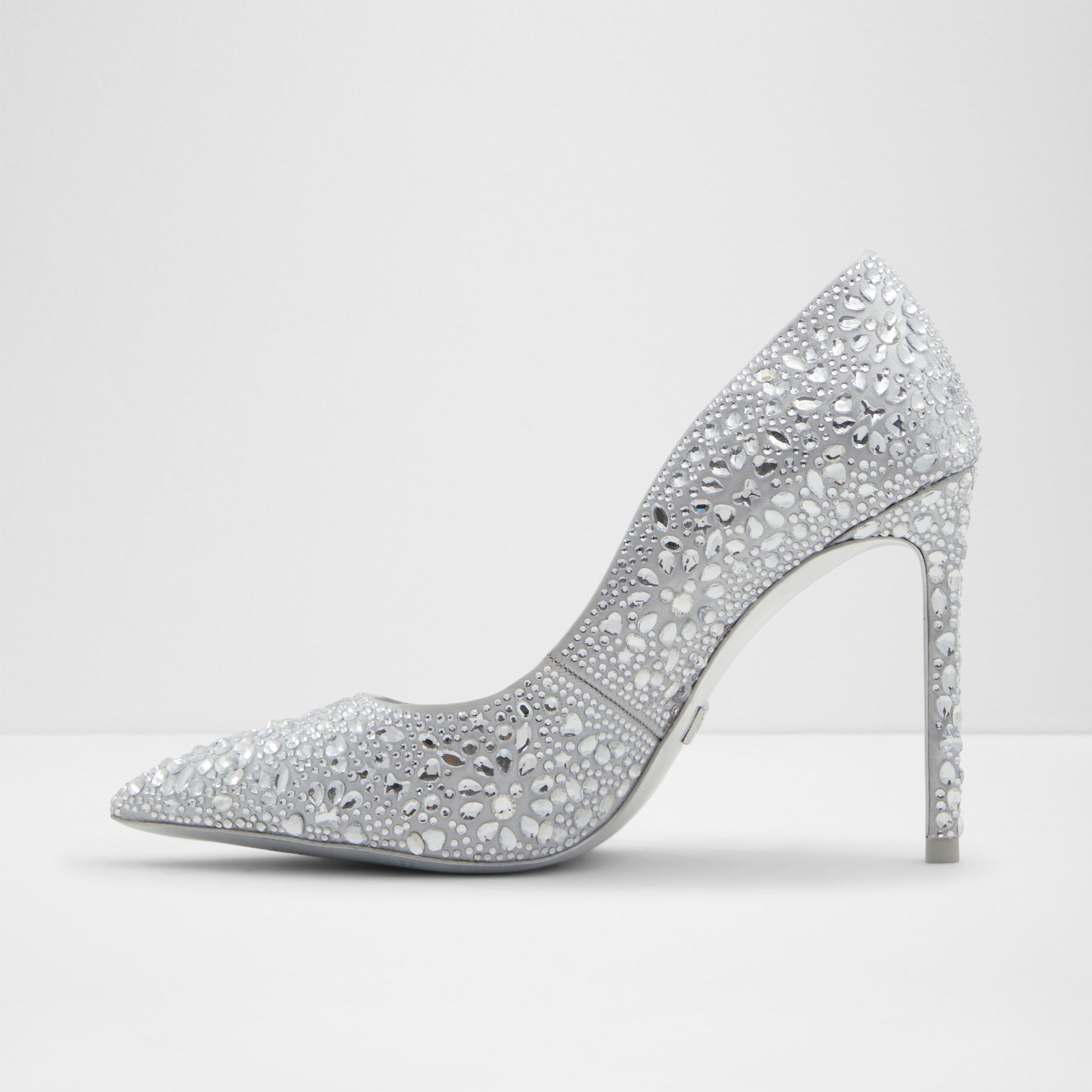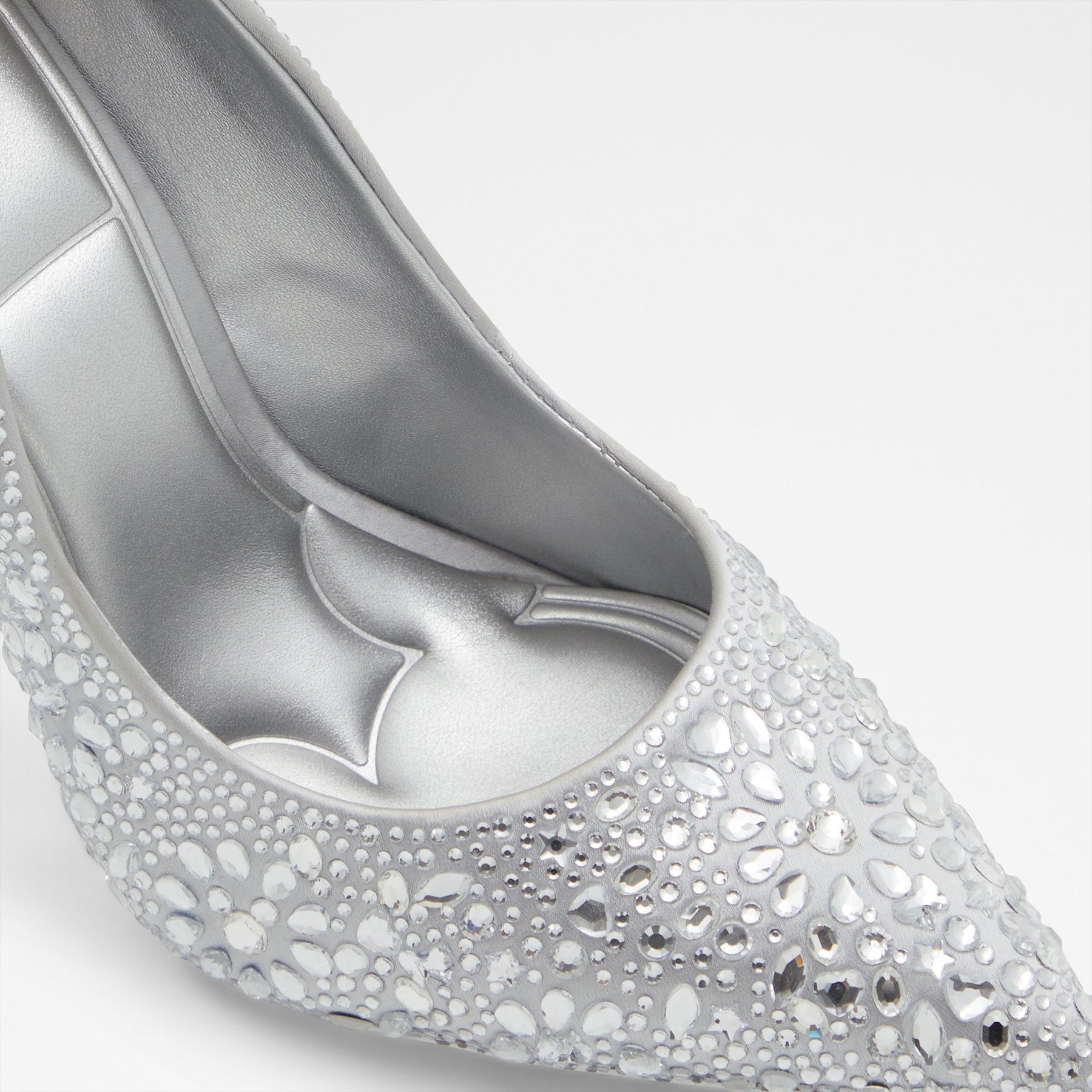 Sapatos D100PLSTESSY para mulher, em prateado, de salto fino, com biqueira pontiaguda e pedras brilhantes. Coleção exclusiva Disney Platinum x ALDO.