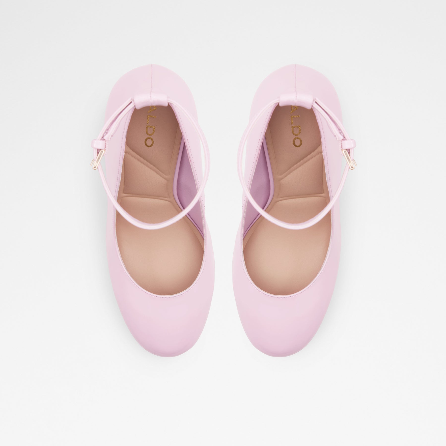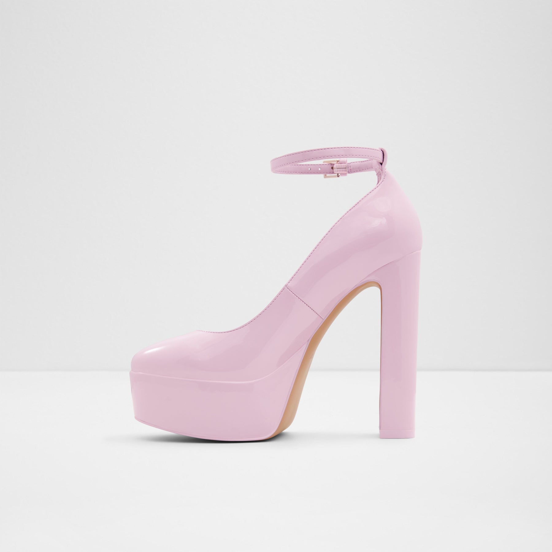 Sapatos FONDA para mulher, em verniz rosa, de salto em bloco com plataforma e com biqueira redonda. Com fecho de fivela no tornozelo.