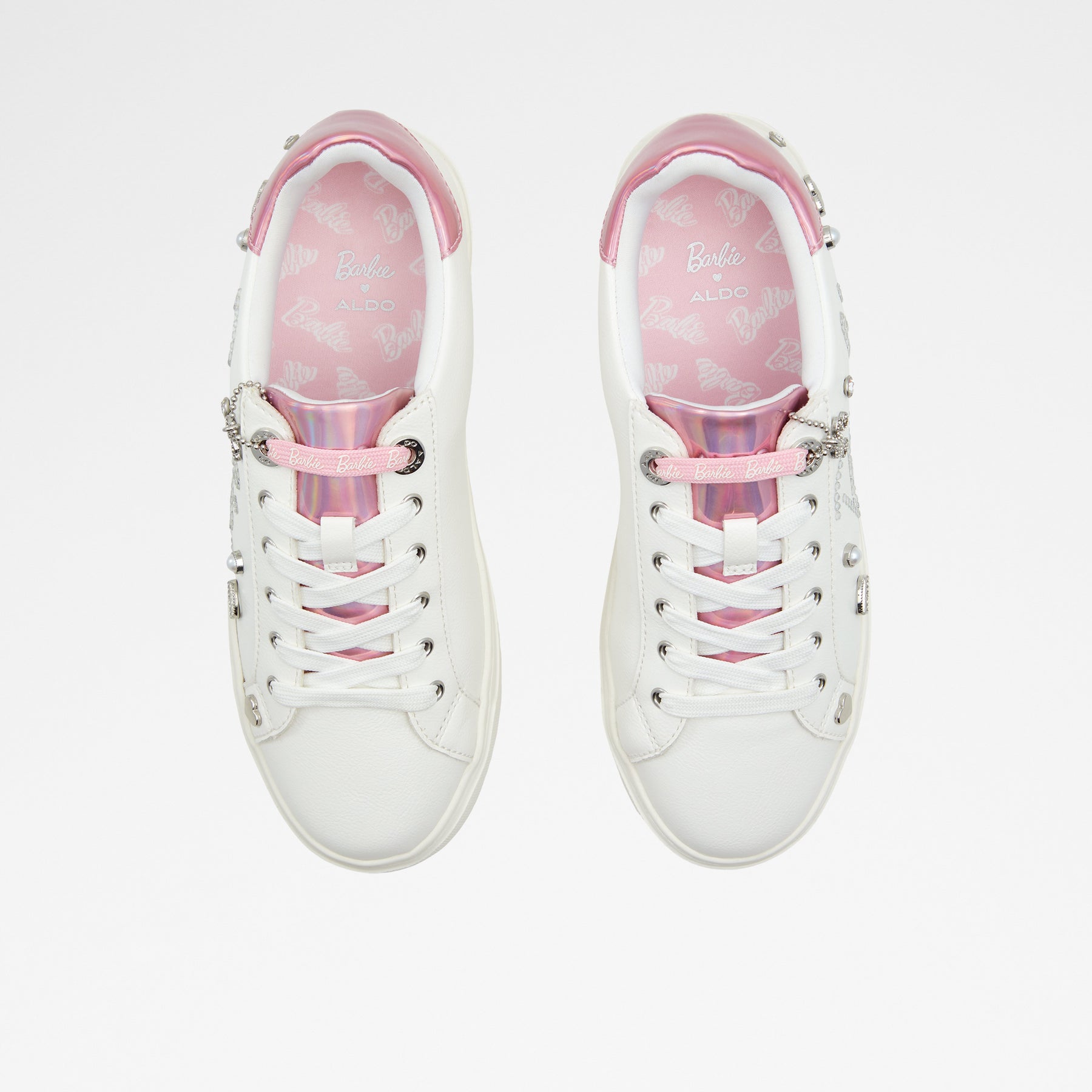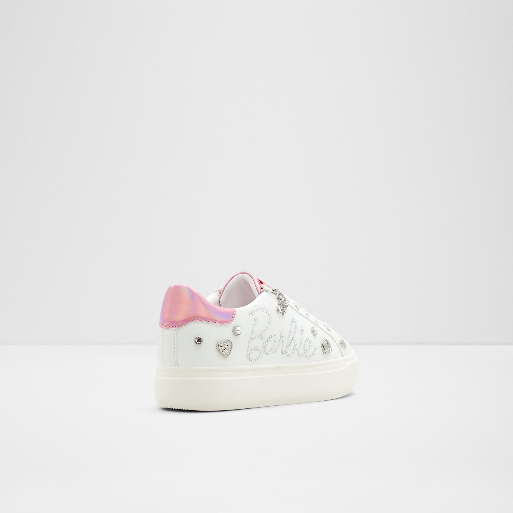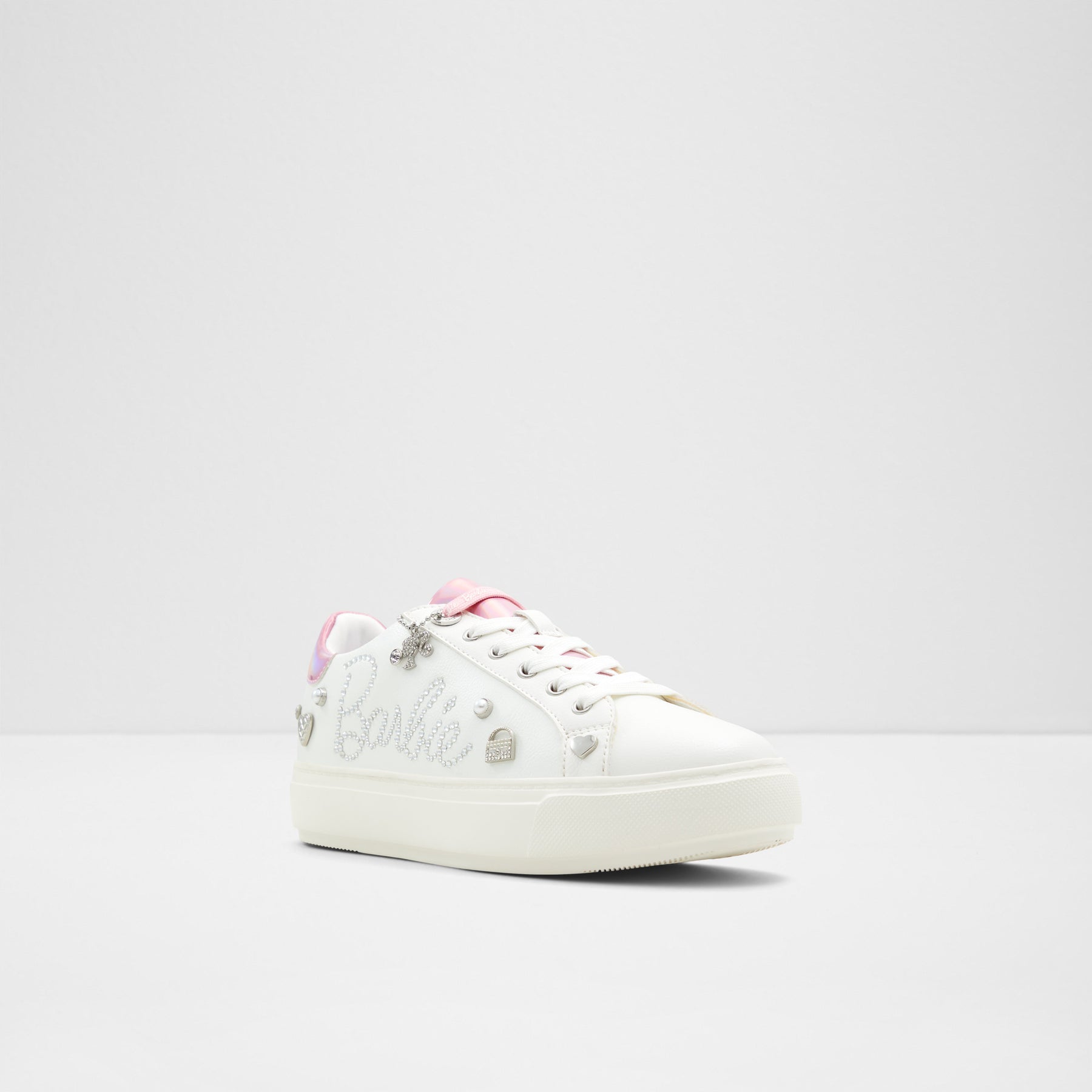 Sapatilhas rasas BARBIESNEAKR para mulher, em branco, com biqueira redonda e apliques decorativos. Com fecho de cordões. Coleção exclusiva Barbie x ALDO.