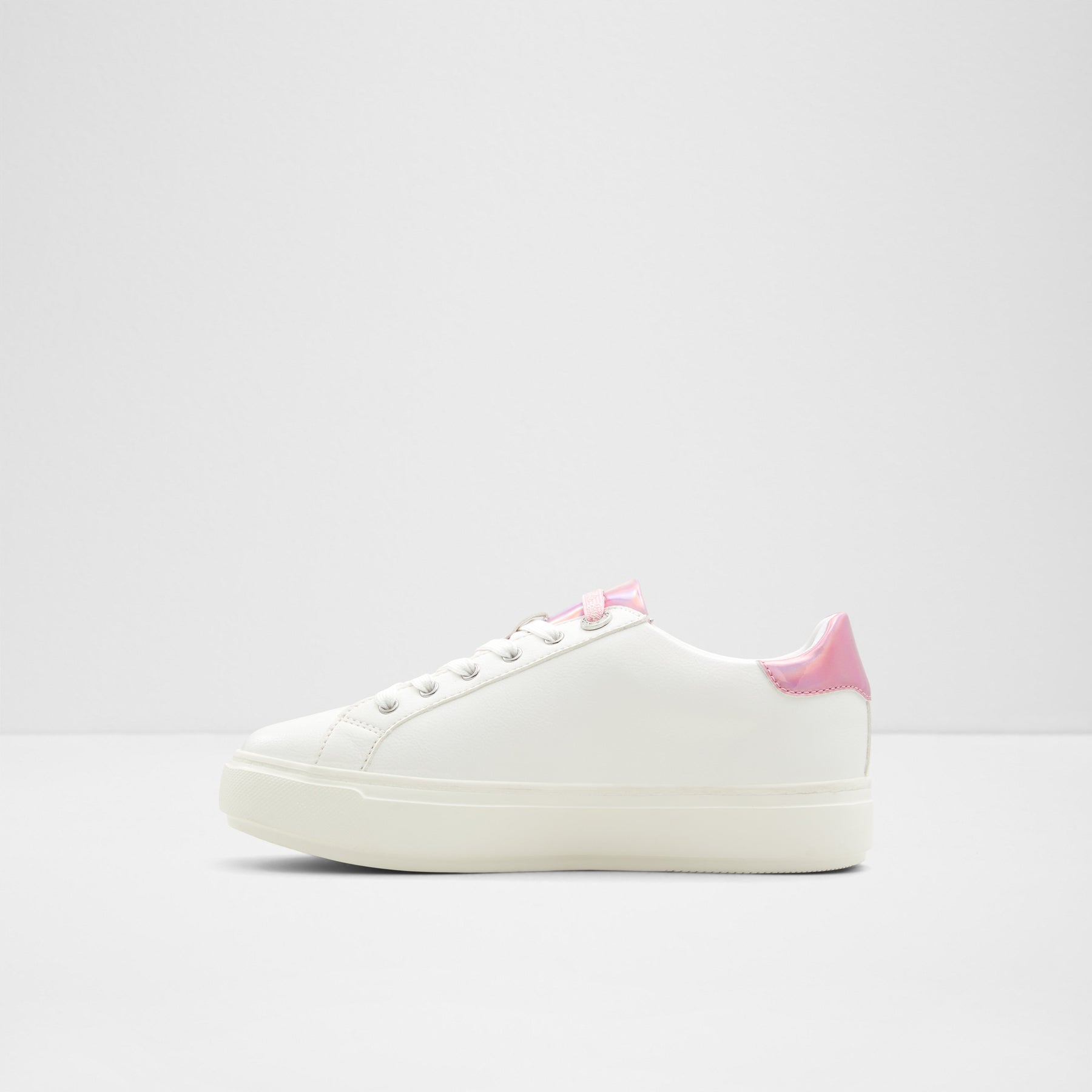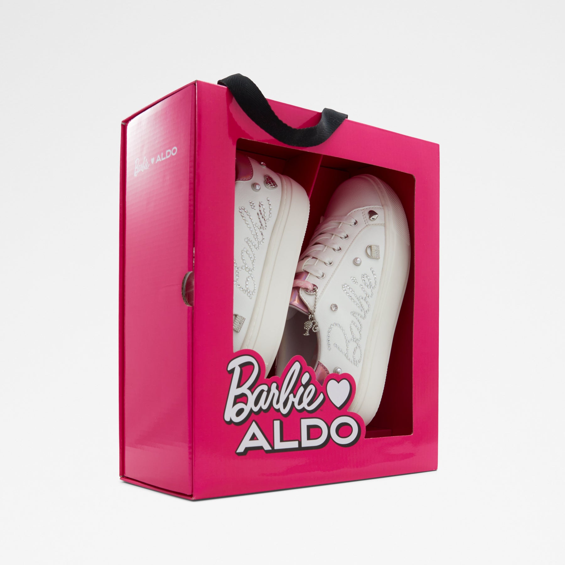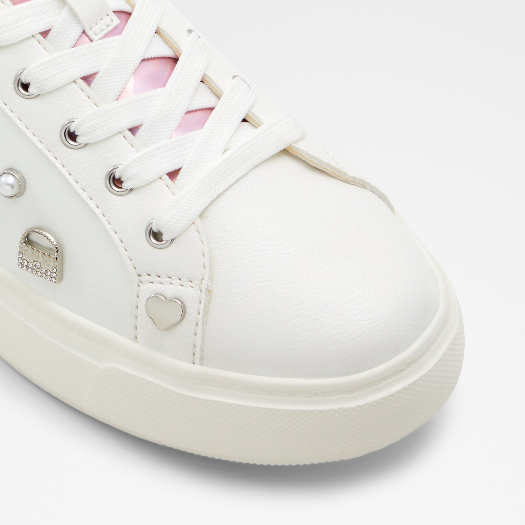 Sapatilhas rasas BARBIESNEAKR para mulher, em branco, com biqueira redonda e apliques decorativos. Com fecho de cordões. Coleção exclusiva Barbie x ALDO.